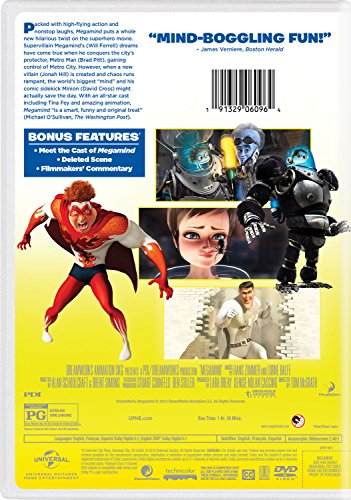 Packed with high-flying action and nonstop laughs, Megamind puts a whole new hilarious twist on the superhero movie. Super villain Megamind's (Will Ferrell) dreams have come true when he conquers the city's protector, Metro Man (Brad Pitt), gaining control of Metro City. However, when a new villain (Jonah Hill) is created and chaos runs rampant, the world's biggest "mind" and his comic sidekick Minion (David Cross) might actually save the day. With an all-star cast including Tina Fey and amazing animation, Megamind "is a smart, funny and original treat" (Michael O'Sullivan, The Washington Post). Bonus Content: Meet the Cast of Megamind Deleted Scenes Filmmakers' Commentary
