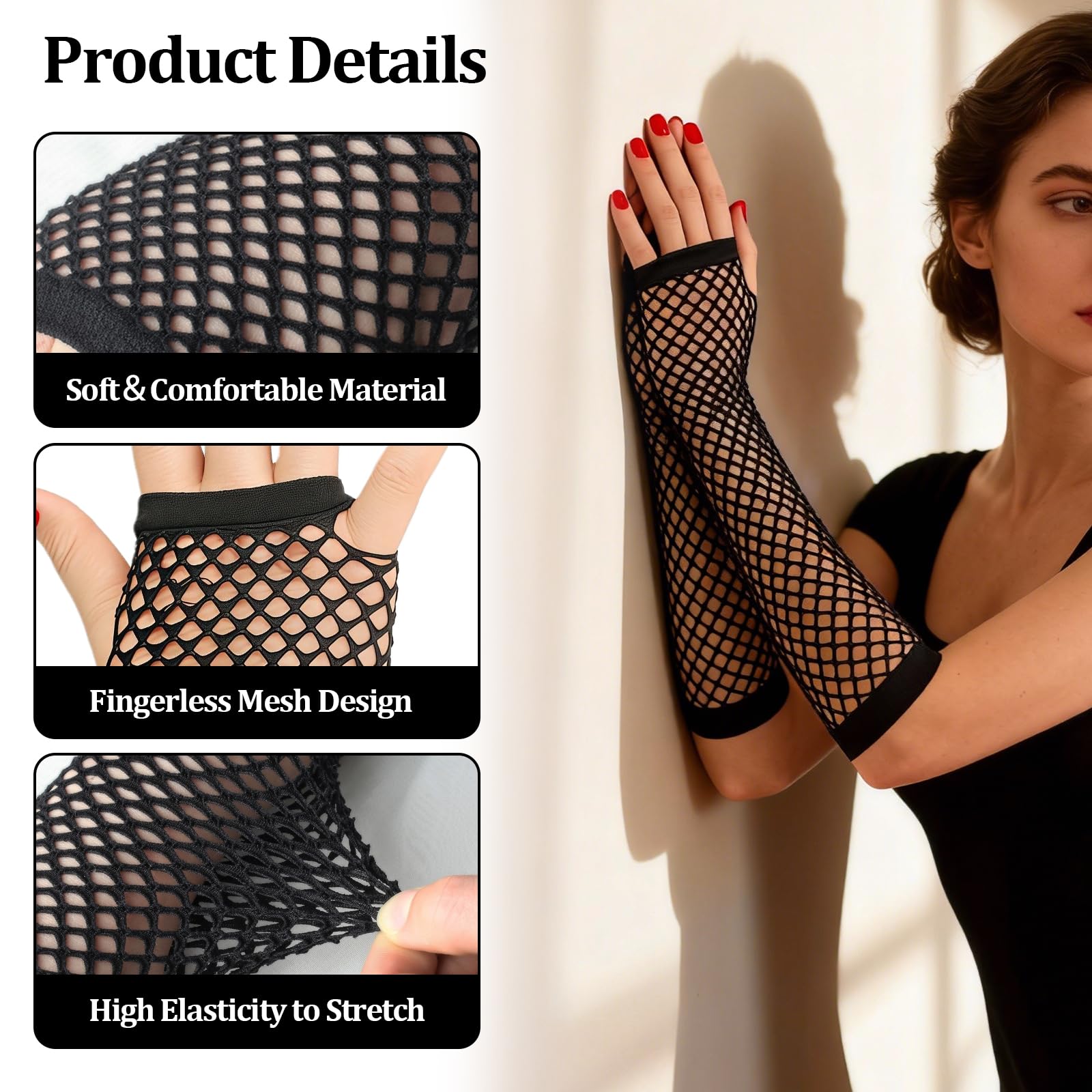 Classic Fingerless Fishnet Design: The timeless fingerless fishnet style allows for effortless movement during daily activities. Elastic bands at both ends ensure a secure fit and prevent slipping, keeping the gloves in place.