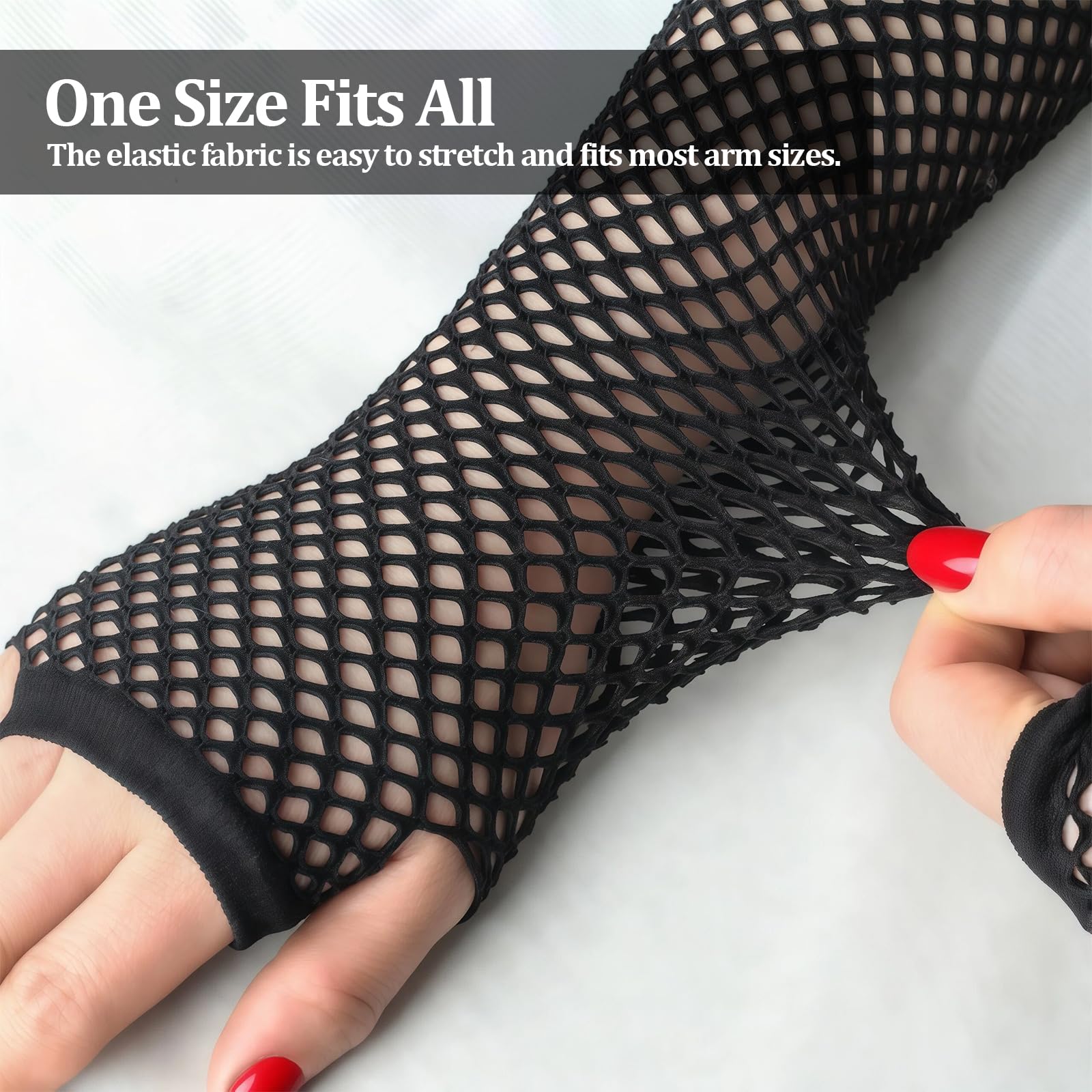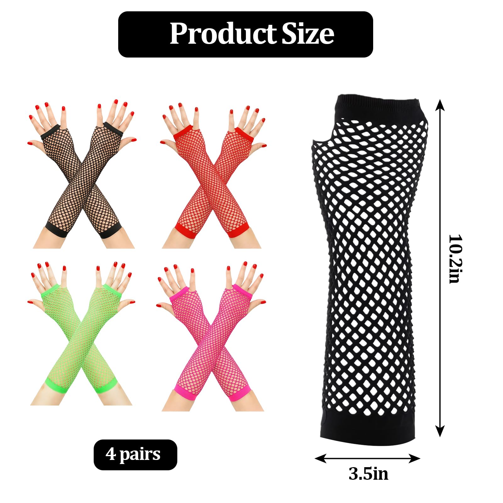 Description Upgrade your style and comfort with our Fingerless Mesh Gloves, designed for practicality and fashion. Made from premium stretchy nylon, these gloves are soft, breathable, and skin-friendly, ensuring a comfortable fit even during extended wear. The elastic fabric stretches up to the elbow, offering a snug yet flexible fit that adapts to your arm length effortlessly. With a classic fingerless fishnet design, these gloves allow maximum freedom of movement, ideal for daily activities or special occasions. Elastic bands at both ends ensure they stay in place without slipping, while maintaining their stylish look. Whether for a themed party or as a bold accessory, these gloves are a versatile wardrobe addition. Each set includes four pairs of gloves in different colors, measuring 10.2 x 3.5 inches each. The lightweight, stretchable material fits most arm sizes comfortably without restricting movement. Share them with friends or keep an extra pair for backup. Perfect for themed parties, band performances, parades, nightclubs, concerts, or casual nights out, these gloves complement diverse makeup and outfit styles. Their timeless fishnet design helps you stand out and express your individuality with confidence. Durable and easy to care for, our fingerless mesh gloves resist fading even after frequent washing. Simply hand wash, gently squeeze out excess water, and air dry in a ventilated space. Add a touch of flair to your outfit with these stylish and long-lasting gloves.