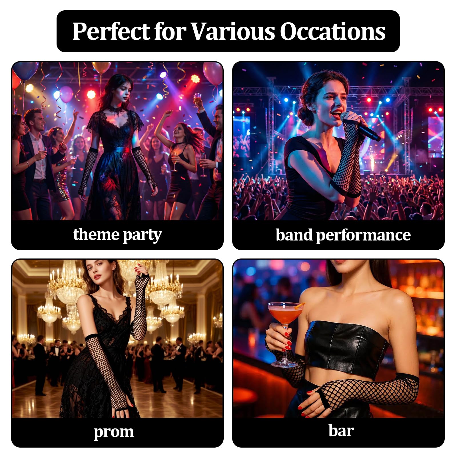 Versatile for Various Occasions: Perfect for themed parties, band performances, holiday parades, nightclubs, concerts, and bars. The stylish fishnet design complements diverse makeup and outfit styles, making you stand out and express your individuality.