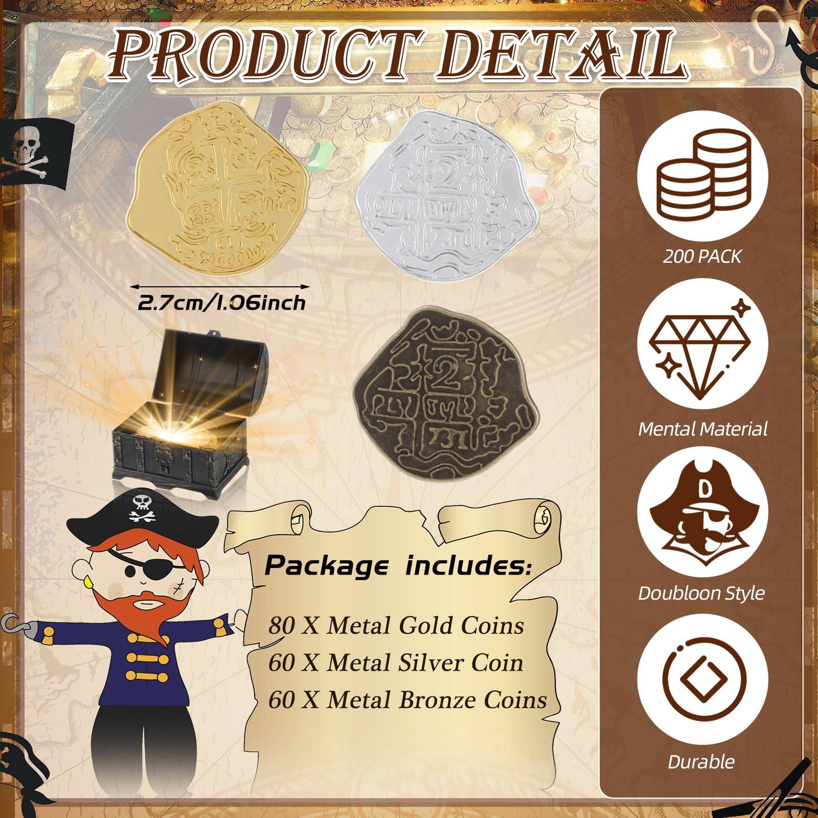 Abundant Metal Pirate Coins: the package contains 200 pieces of metal pirate coins in gold, abundant quantity and classic color can meet your party decoration needs, suitable for sharing with friends