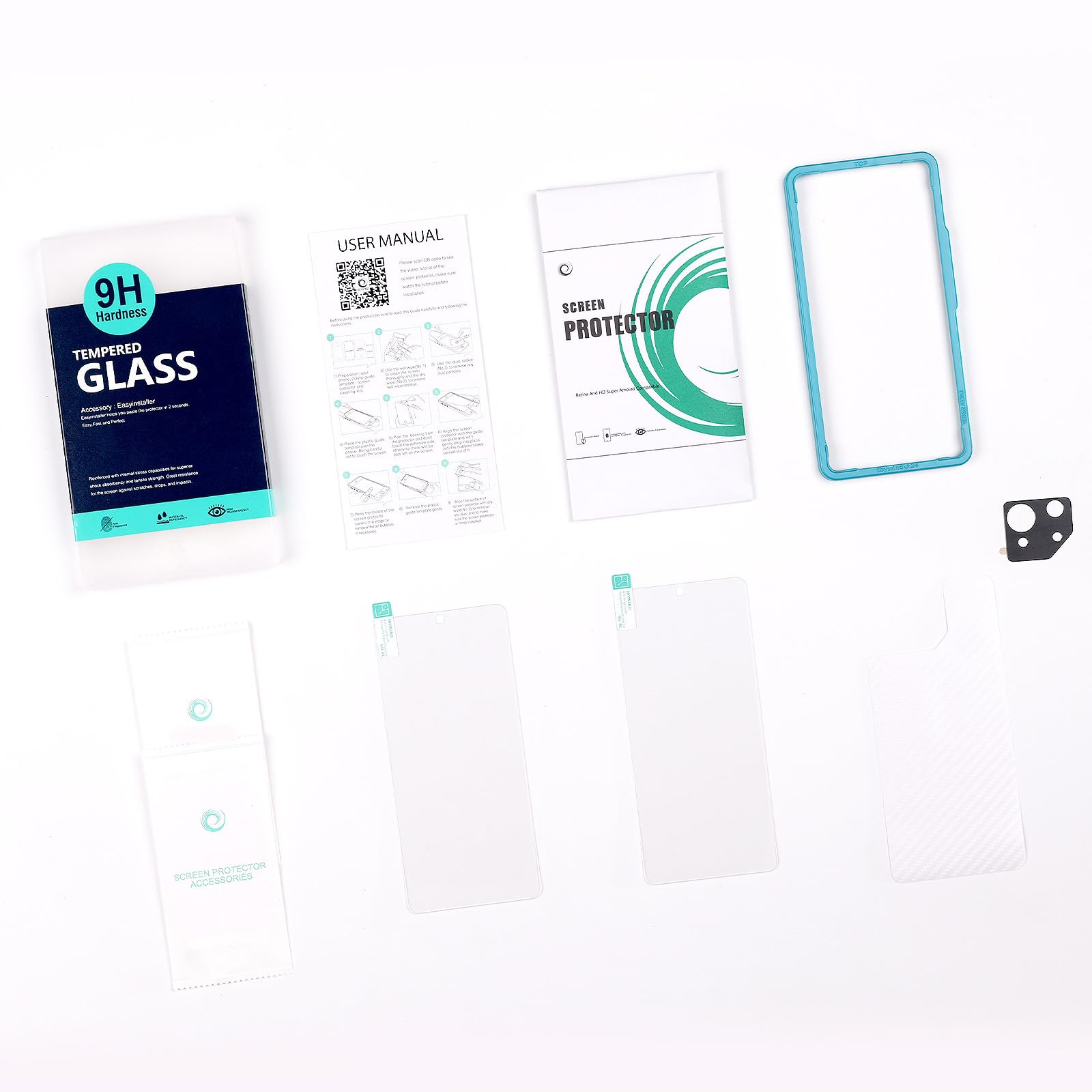 ★[Package Including]2Pcs Tempered Glass screen protector;1Pc Metal Camera Lens Protector("Hollow out" design);1Pc Back Carbon Fiber Skin Protector(transparet color);1Pc Easy Installation Frame; 2packs installation accessory kits,1Pc Installation Instructions