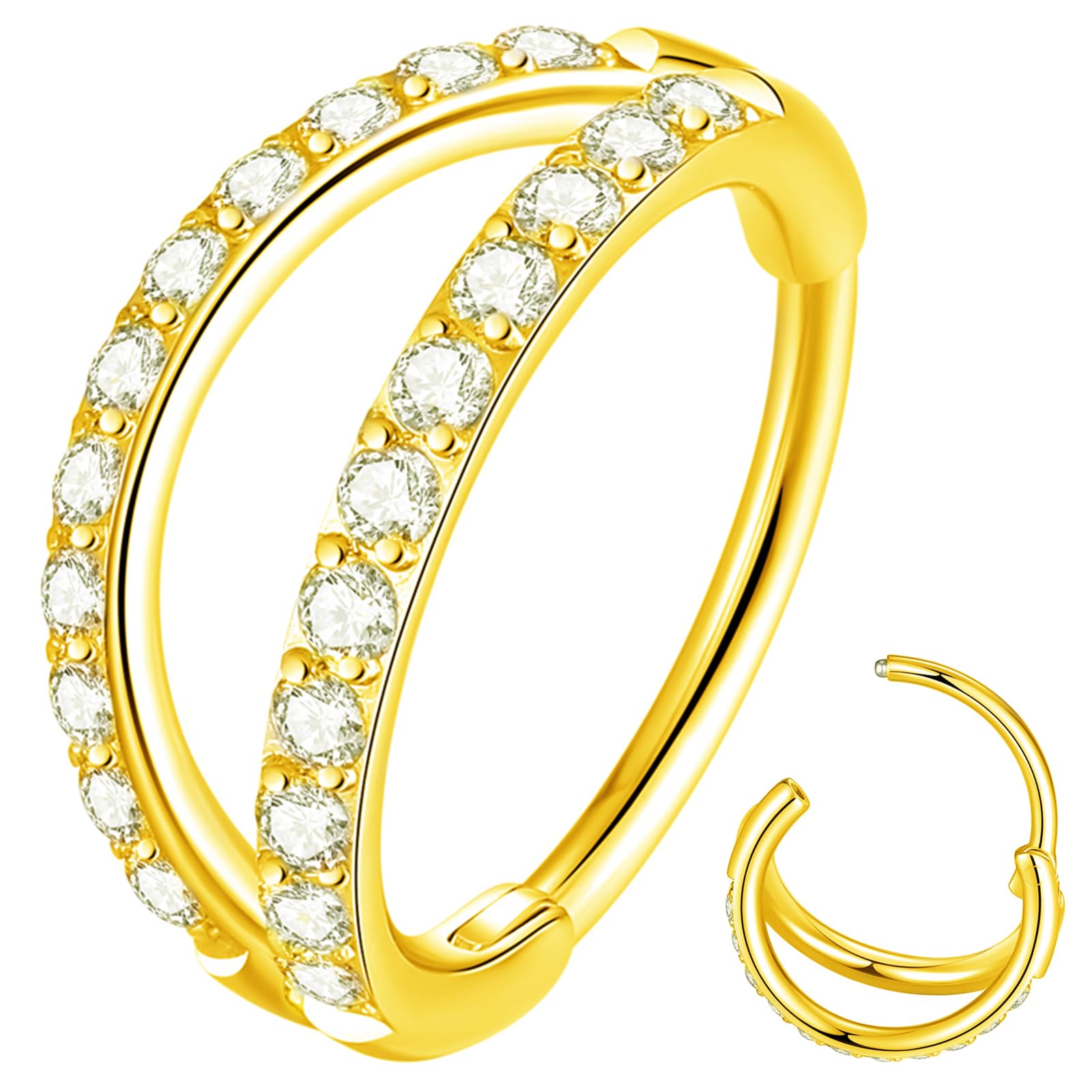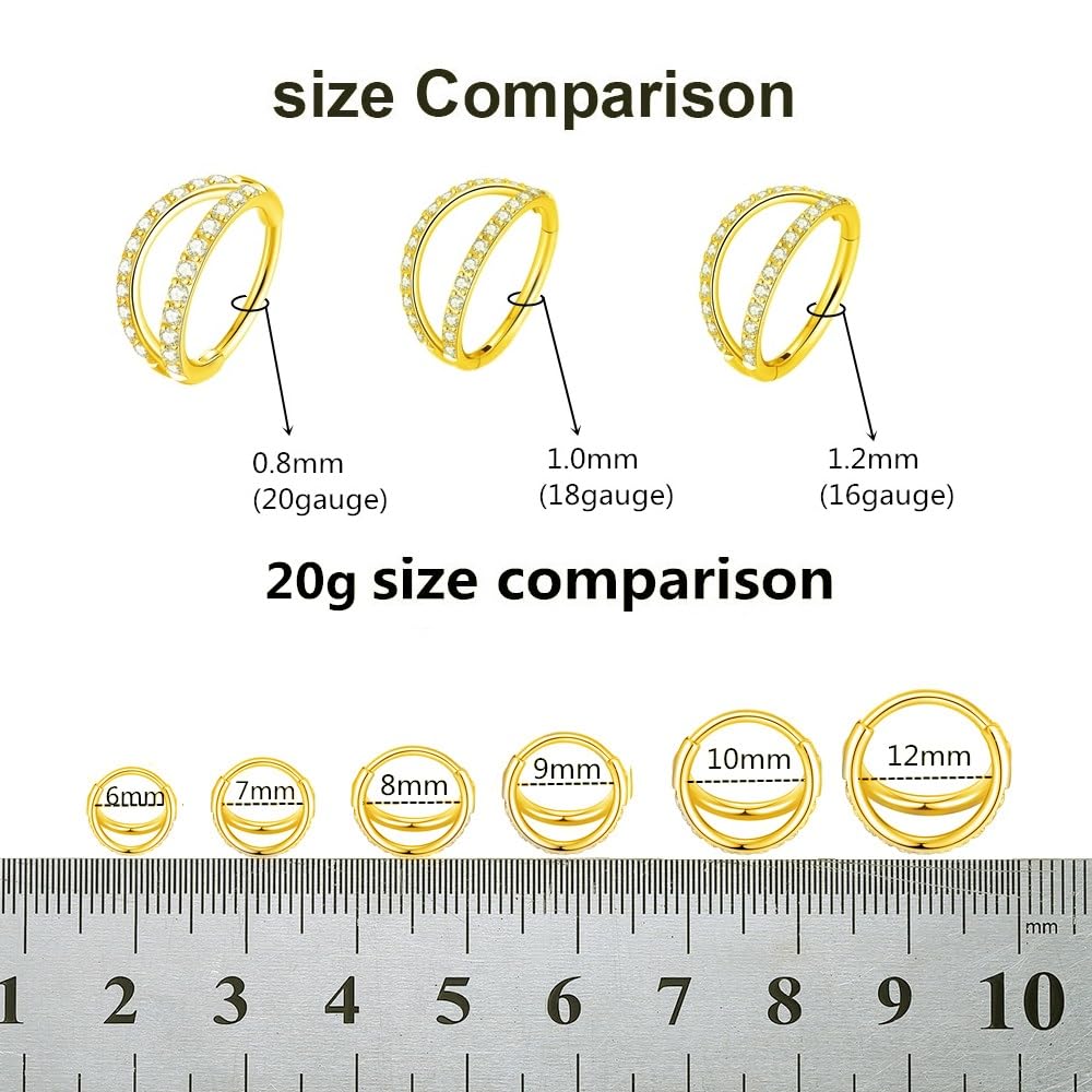 Sold as A Single Piece. Shiny Double Row Clear CZ Hoop Nose Ring/Hoop Earring Size: Bar thickness 20G(0.8mm),Inner diameter 12mm(15/32 inches).This double hoop hinged segment nose ring is a absolute staple piece of jewelry in anyone's choice.we've got you covered with the huge selection of available gauge sizes and diameters to ensure the perfect fit! And it is lightweight and comfortable to wear and won't easy to slip off.