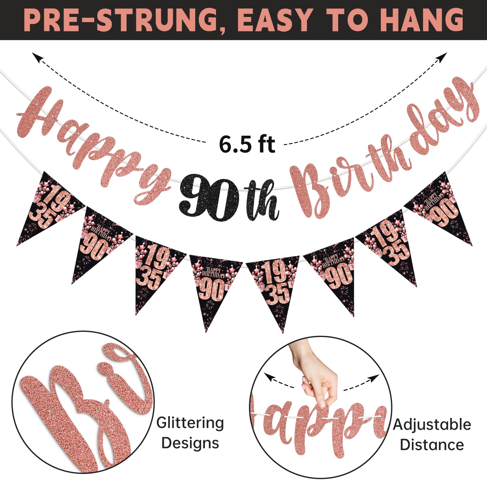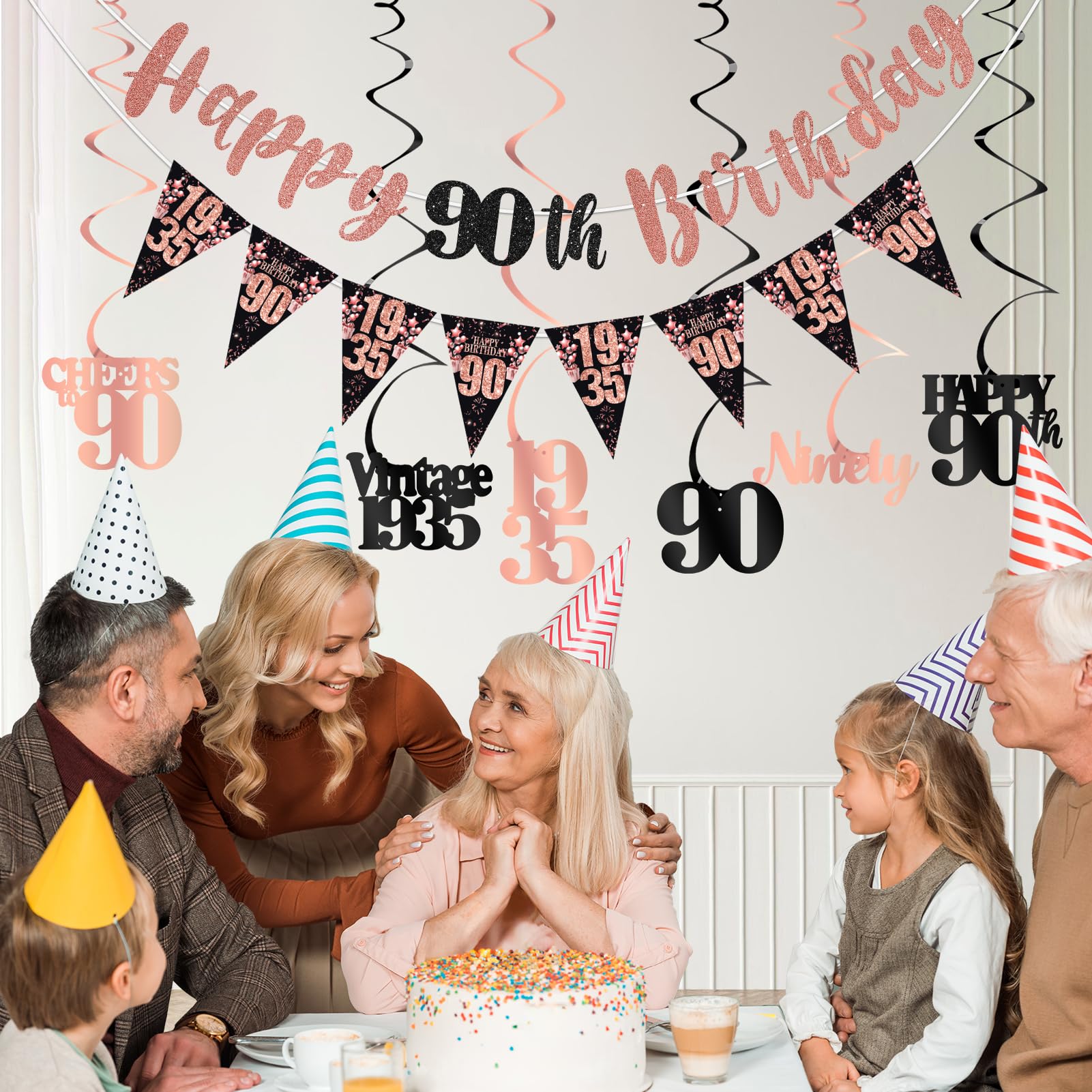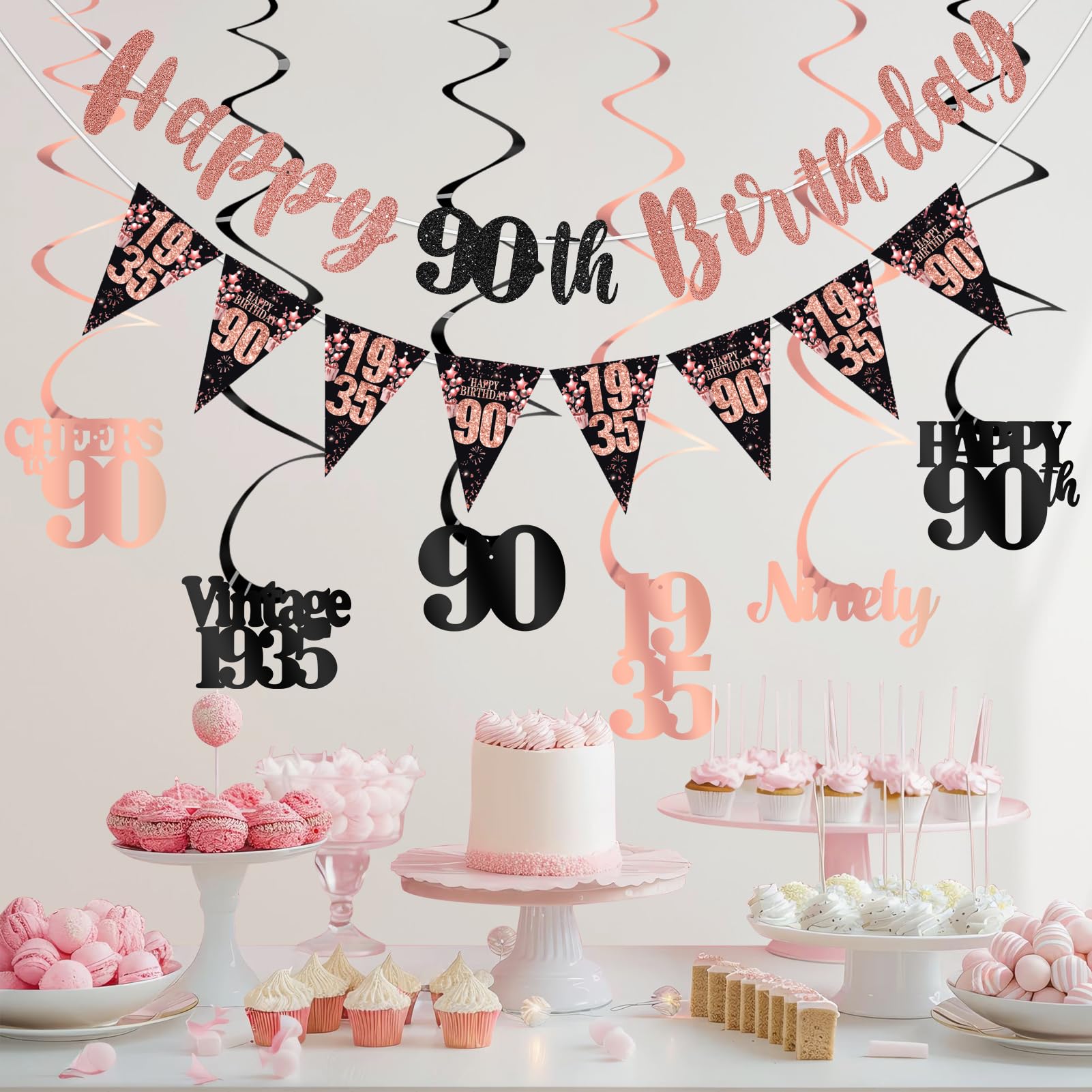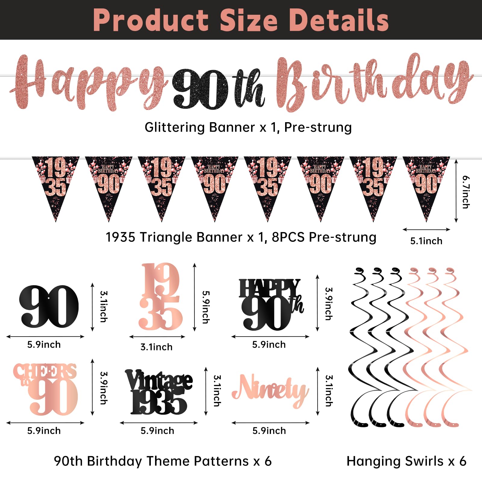 You Will Get: Rose gold 90th birthday decorations kit, including 1pcs "happy 90th birthday" banner, 1pcs 1935 90th birthday triangle banner, 6pcs ninety birthday themed hanging swirls, which are suitable for the 90 th birthday party