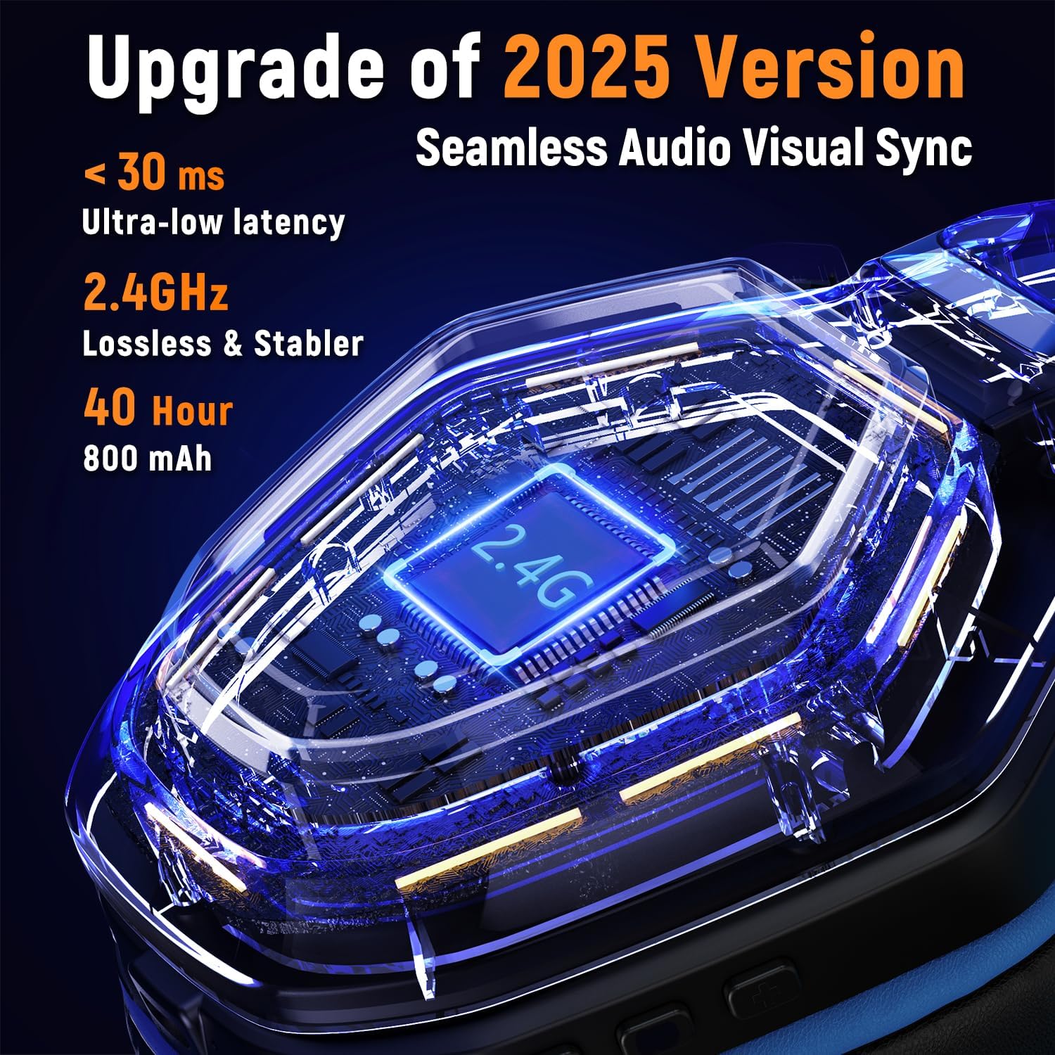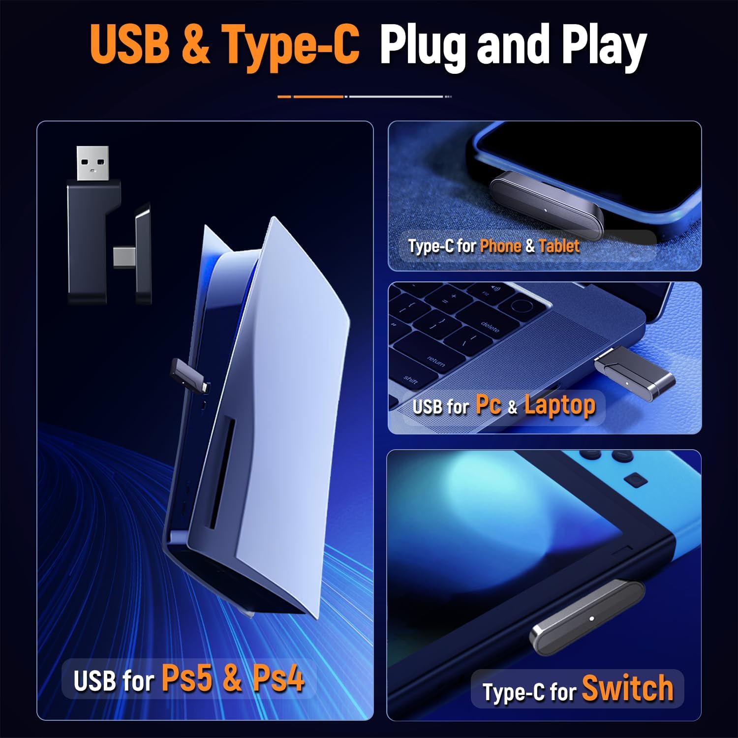 Amazing Stable Connection-Quick Access to Games -- Our gaming headset 2.4GHz transports has USB-A and USB-C ports with less than 30ms delay for ultra-low latency wireless connection. Game Communication-Better Bass and Accuracy -- Letting you hear every critical step, reload, or vocal in The Legend of Zelda, Fortnite, Call of Duty, and RPG with the 50mm driver plus 2.4G lossless wireless transport. You will be amazed by the range, precision and sound quality that the headset reveals in the gaming world. Flexible and Convenient Design-Effortless in Game -- Gaming headset with Mic supports charging and playing at the same time for all-day gaming. The intuitive button layout on the headset is perfect for users to instantly crank or lower volume and mute, quickly answer phone calls. Easy Connection, More Play-Dual Input From 2.4GHz & Bluetooth -- Wireless headset for Ps5 with high performance dual-interface 2.4GHz and Bluetooth 5.3 mode for faster connection speed, wider adaptability, and not easy to disconnect. Wide Compatibility with Gaming Devices -- Wireless gaming headphones 2.4GHz connector connects seamlessly to Ps5, Ps4, PC, Mac, Laptop, Switch. Bluetooth mode is only available for laptop, phone, and switch (Mic function is not supported). 3.5mm audio jack wired mode (music and calls only).