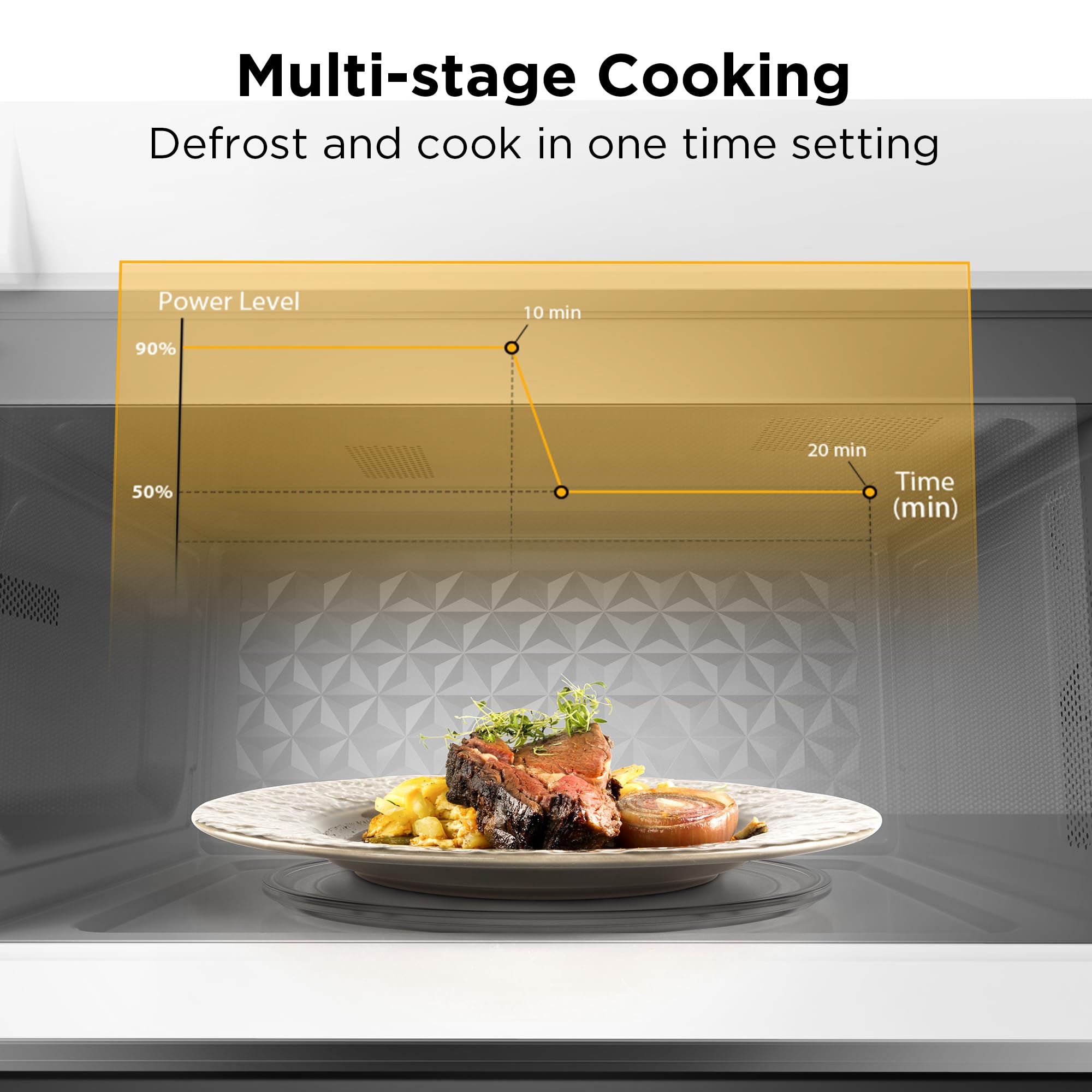 Multi-stage Cooking: Save time by cooking with 90% microwave power for 10 minutes and then cooking with 50% power for 5 minutes in one time setting.