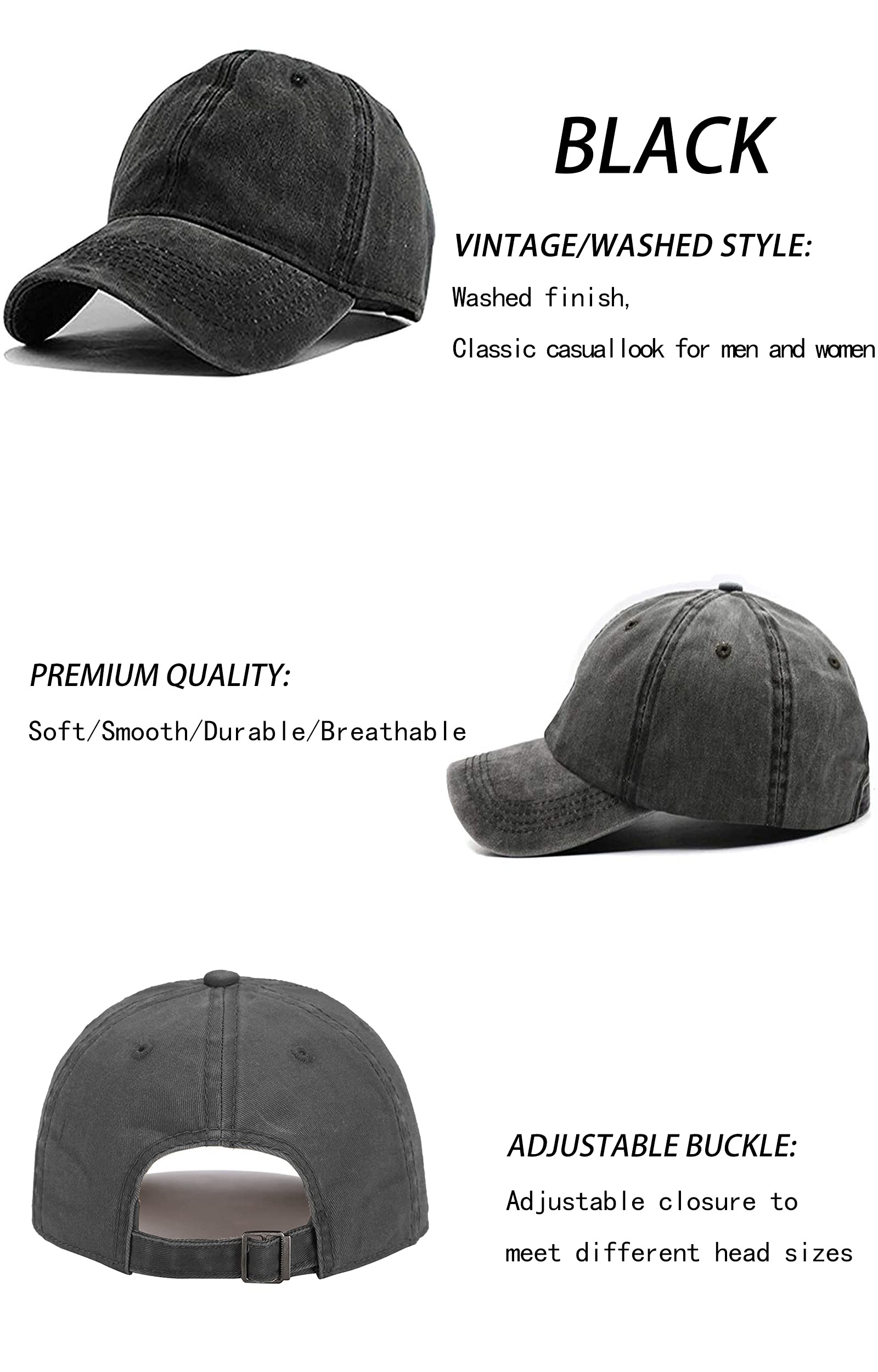 Baseball Cap: Vintage washed style, 100% cotton made, lightweight, durable, smooth, unisex design great fit for most head sizes; height: 12 cm, 4.72 inches