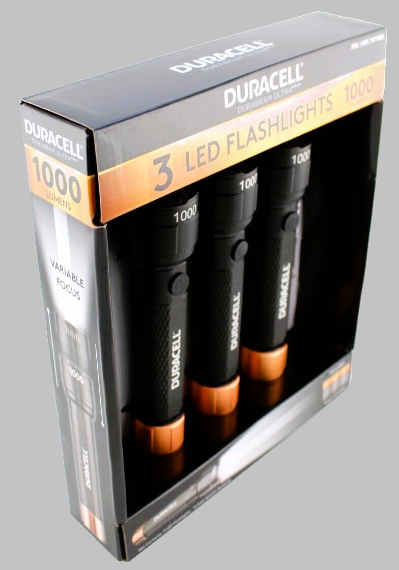 The Duracell 1000 Lumens 4AAA LED Flashlight 3-pack makes the perfect gift. The appearance of the product is simple and elegant. Each flashlight has anti-slip design. It is small enough to fit in a purse, pocket or glove box. The compact size makes it perfect for camping, hiking, auto, safety, walking and emergency situations! *The main material is aluminum with anodizing finishing. The strong housing make this flashlight impact resistant. *1000 lumens High-brightness flashlight, long run time, meet your various needs. *Use AAAx4 batteries (included for all 3 flashlights!) *Slide Variable Focus: zoom from high-intensity spot beam to wide flood beam. *Water resistant– IPX4: It doesn’t matter even a rainy day, this flashlight is water resistant, eliminate your worries. *Light Output: High: 1000 Lumens, Low: 100 Lumens *Beam Distance: High>140 meters, Low>70 meters *3 Modes: High - Off - Middle - Off- Low - Strobe - Off, Zoom Focus *Runtime: High Beam>1.5 Hours, Low Beam >5 Hours *Battery type: 4 AAA Alkaline Batteries/each flashlight (12 AAA in-pack included) *ANSI FL1 Certified. *Ideal for home, car, outdoors and emergencies.
