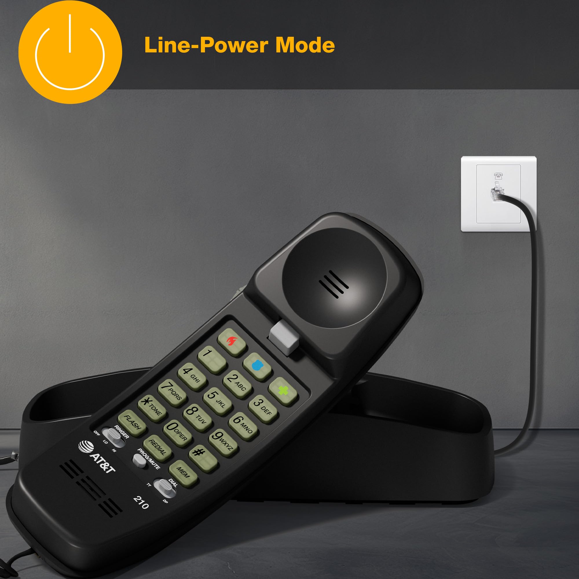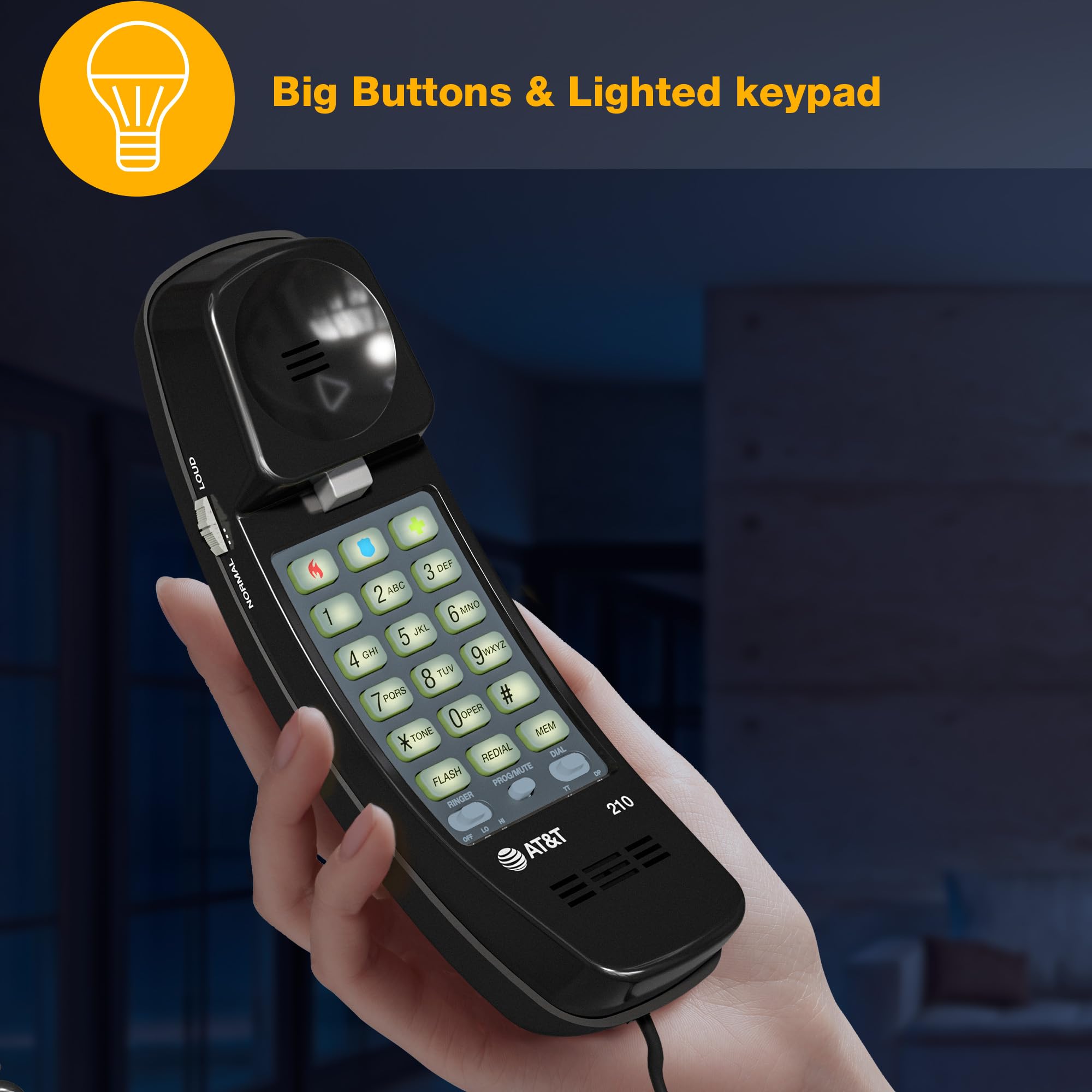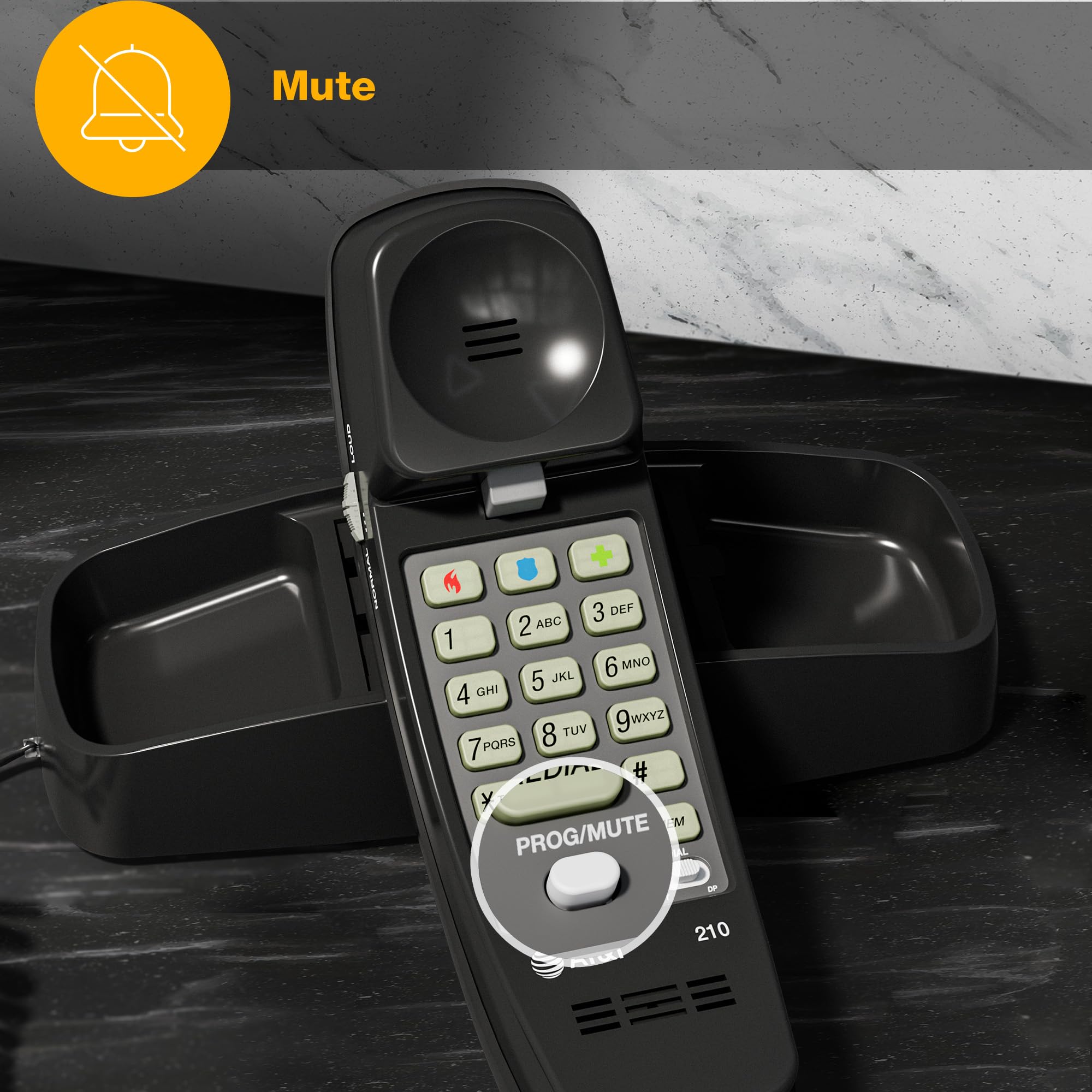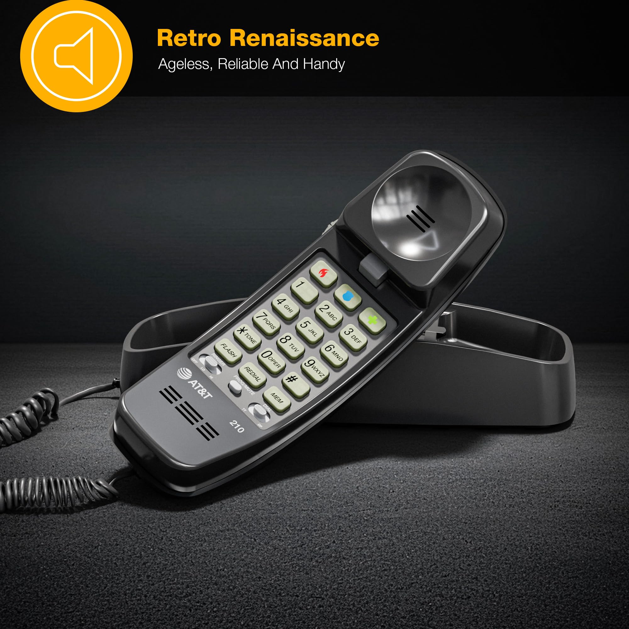Product Description A popular and affordable telephone, the 210M from AT&T is designed for those who don't want hassles or frills, just a basic phone that's reliable and easy to use. Simple corded operation means you never have worry about misplacing a cordless handset, and the phone's sturdy construction means it's designed to last. Amazon.com Amazon.com Product Description A popular and affordable telephone, the 210 from AT&T is designed for those who don't want hassles or frills, just a basic phone that's reliable and easy to use. Simple corded operation means you never have worry about misplacing a cordless handset, and the phone's sturdy construction means it's designed to last. You can place the base on a convenient surface or easily mount it on the wall, saving on counter space. A 13-number memory dial feature lets you store your most frequently called numbers (up to 21 digits)--nine speed dials plus three emergency one-touch dials that are easy to program. A directory card is provided to help you keep track of all your memory dial settings. A redial feature lets you quickly call the last outgoing number (up to 32 digits). Three ringer settings (off, low, and high) and three handset volume levels permit customization. Switchable tone and pulse dialing methods are also provided. The illuminated keypad helps you operate the phone even in darkly lit areas, while a prog/mute button on the handset lets you hear the other party while muting your side of the conversation. An excellent value, the 210 also comes backed with a one-year limited warranty. What's in the Box: Telephone handset, telephone base, 7-foot line cord, coiled handset cord, user's manual, warranty information