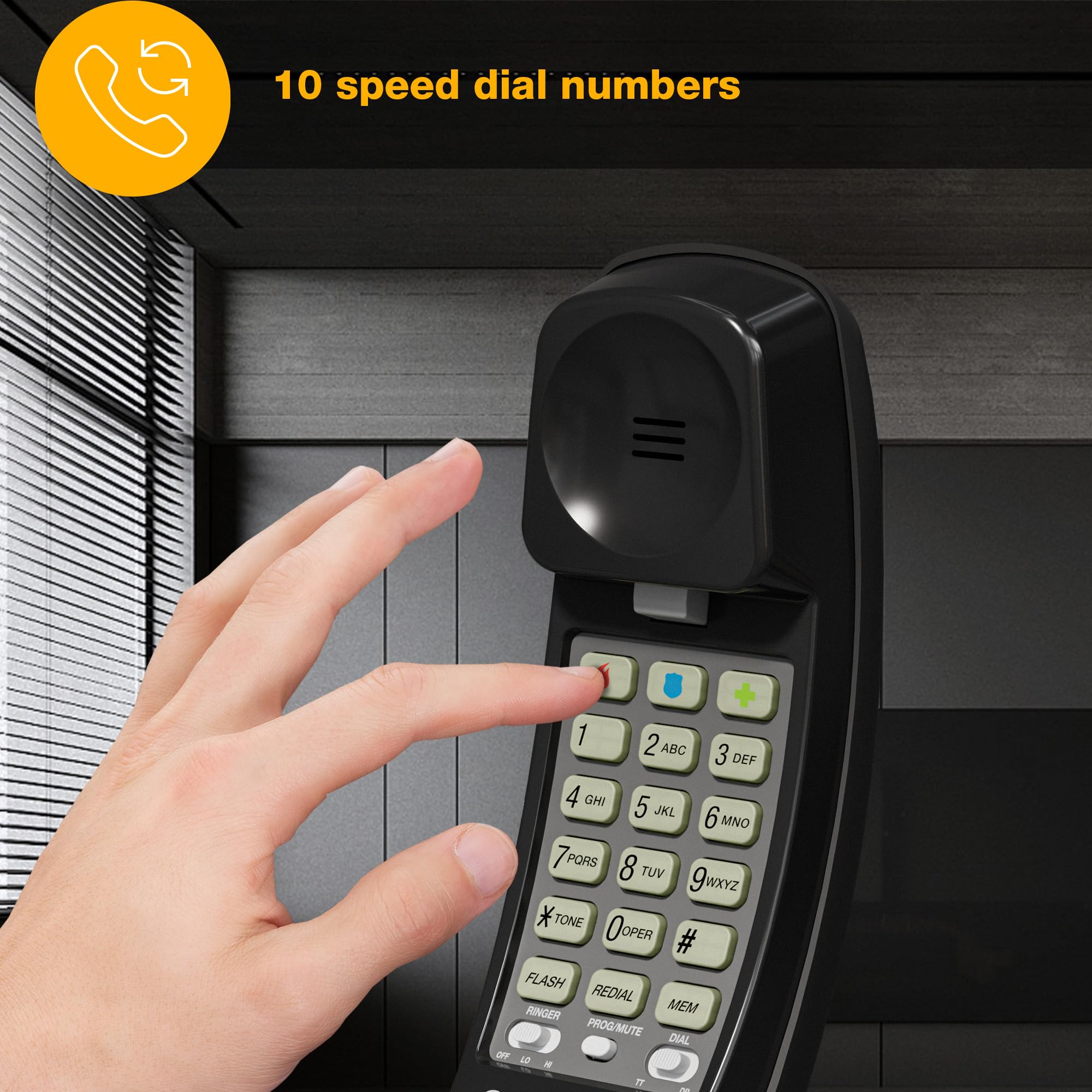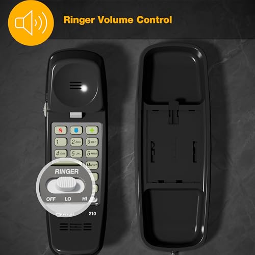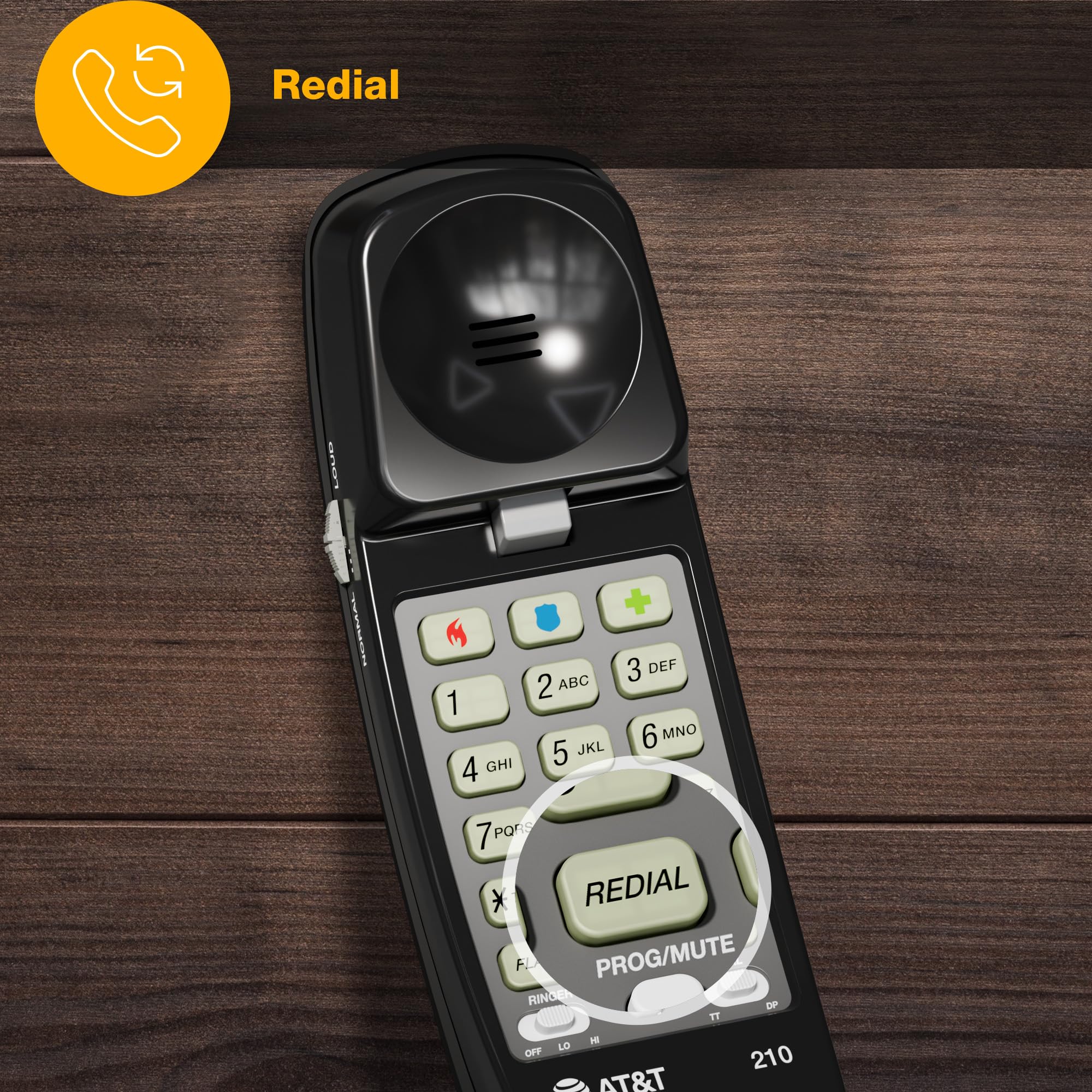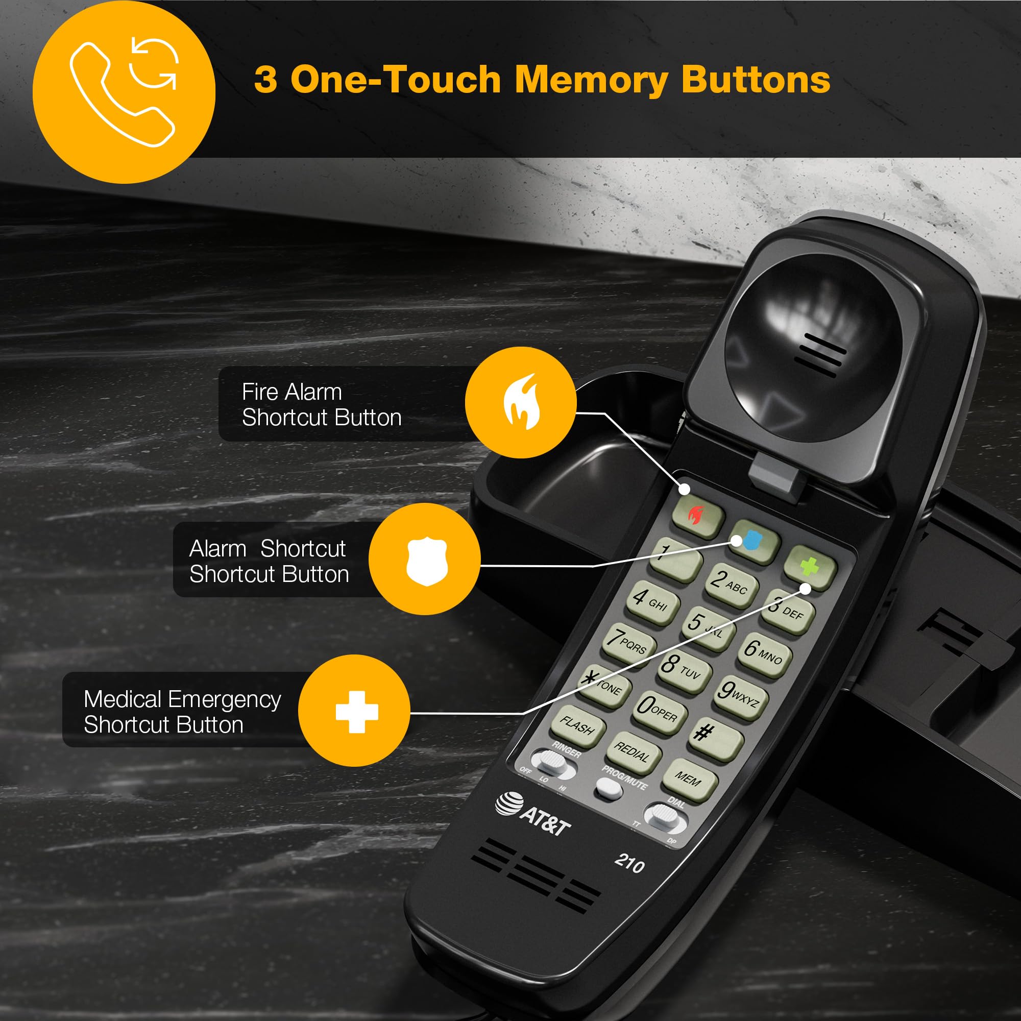 Product Description A popular and affordable telephone, the 210M from AT&T is designed for those who don't want hassles or frills, just a basic phone that's reliable and easy to use. Simple corded operation means you never have worry about misplacing a cordless handset, and the phone's sturdy construction means it's designed to last. Amazon.com Amazon.com Product Description A popular and affordable telephone, the 210 from AT&T is designed for those who don't want hassles or frills, just a basic phone that's reliable and easy to use. Simple corded operation means you never have worry about misplacing a cordless handset, and the phone's sturdy construction means it's designed to last. You can place the base on a convenient surface or easily mount it on the wall, saving on counter space. A 13-number memory dial feature lets you store your most frequently called numbers (up to 21 digits)--nine speed dials plus three emergency one-touch dials that are easy to program. A directory card is provided to help you keep track of all your memory dial settings. A redial feature lets you quickly call the last outgoing number (up to 32 digits). Three ringer settings (off, low, and high) and three handset volume levels permit customization. Switchable tone and pulse dialing methods are also provided. The illuminated keypad helps you operate the phone even in darkly lit areas, while a prog/mute button on the handset lets you hear the other party while muting your side of the conversation. An excellent value, the 210 also comes backed with a one-year limited warranty. What's in the Box: Telephone handset, telephone base, 7-foot line cord, coiled handset cord, user's manual, warranty information