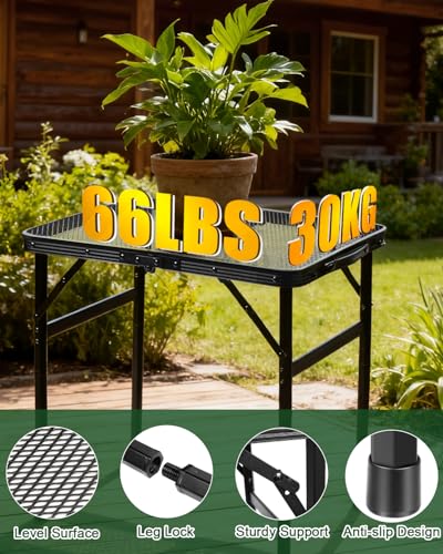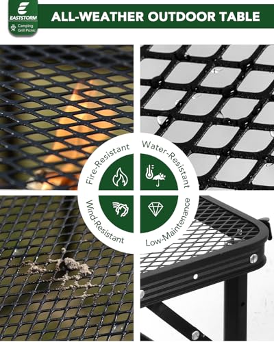 [Robust and Sturdy] The small folding table is made of high-quality aluminum alloy, ensuring its sturdiness and durability. The table top is designed with a metal mesh surface and has been treated with a thickened paint coating, allowing it to withstand prolonged exposure to high temperatures. When stored in the garden, it is resistant to rain and snow, as the limited contact area with the table surface minimizes the risk of staining and rusting.