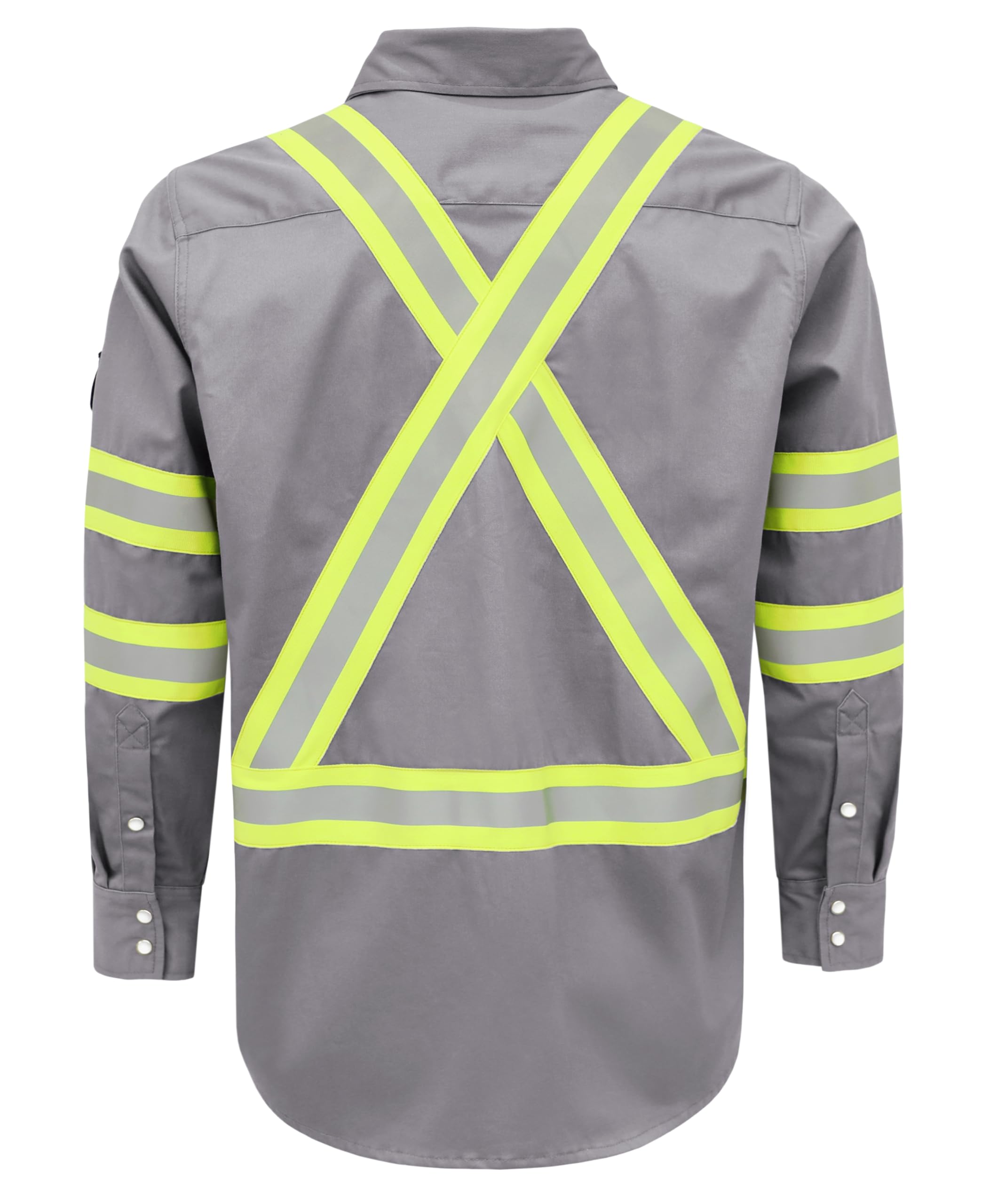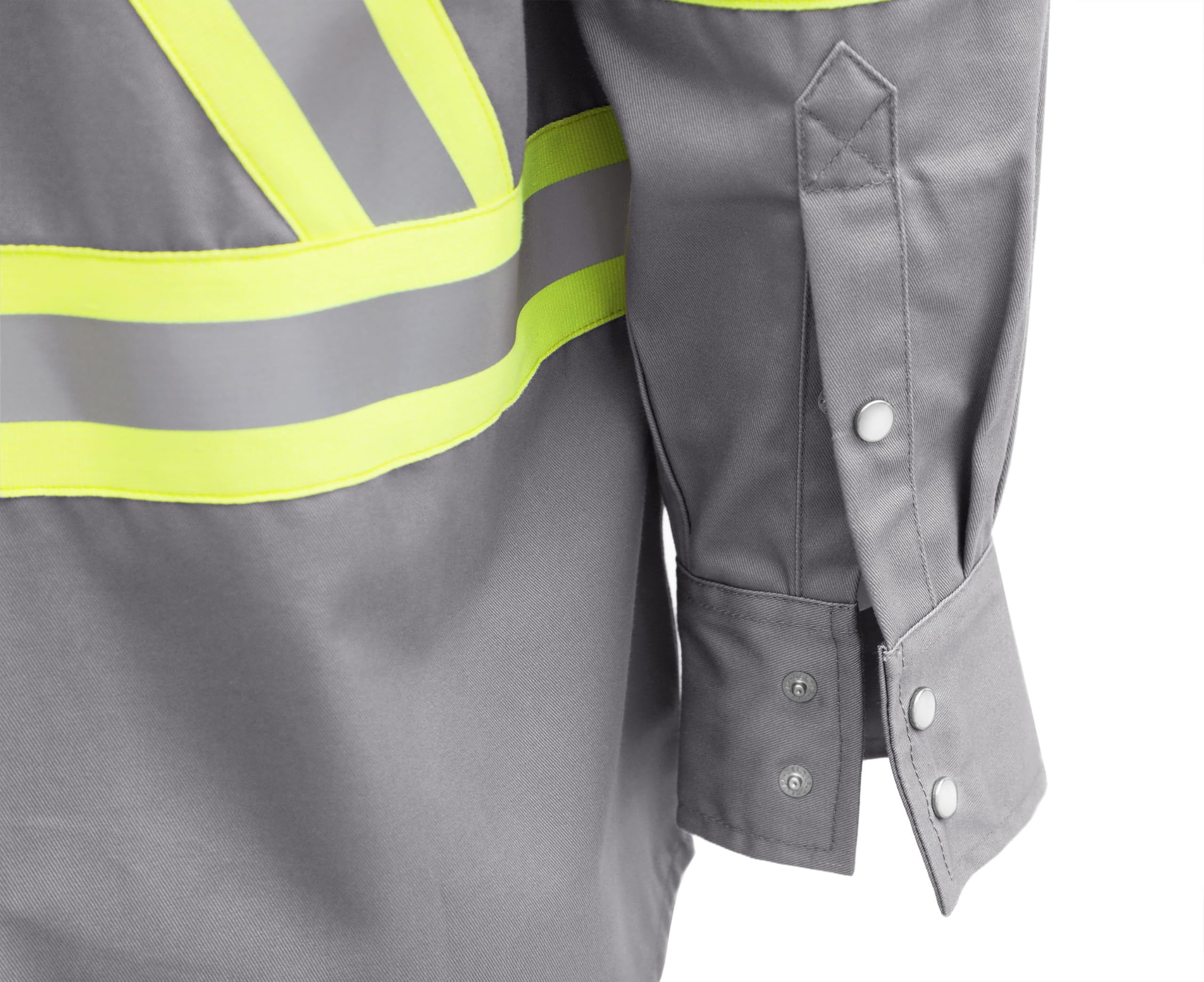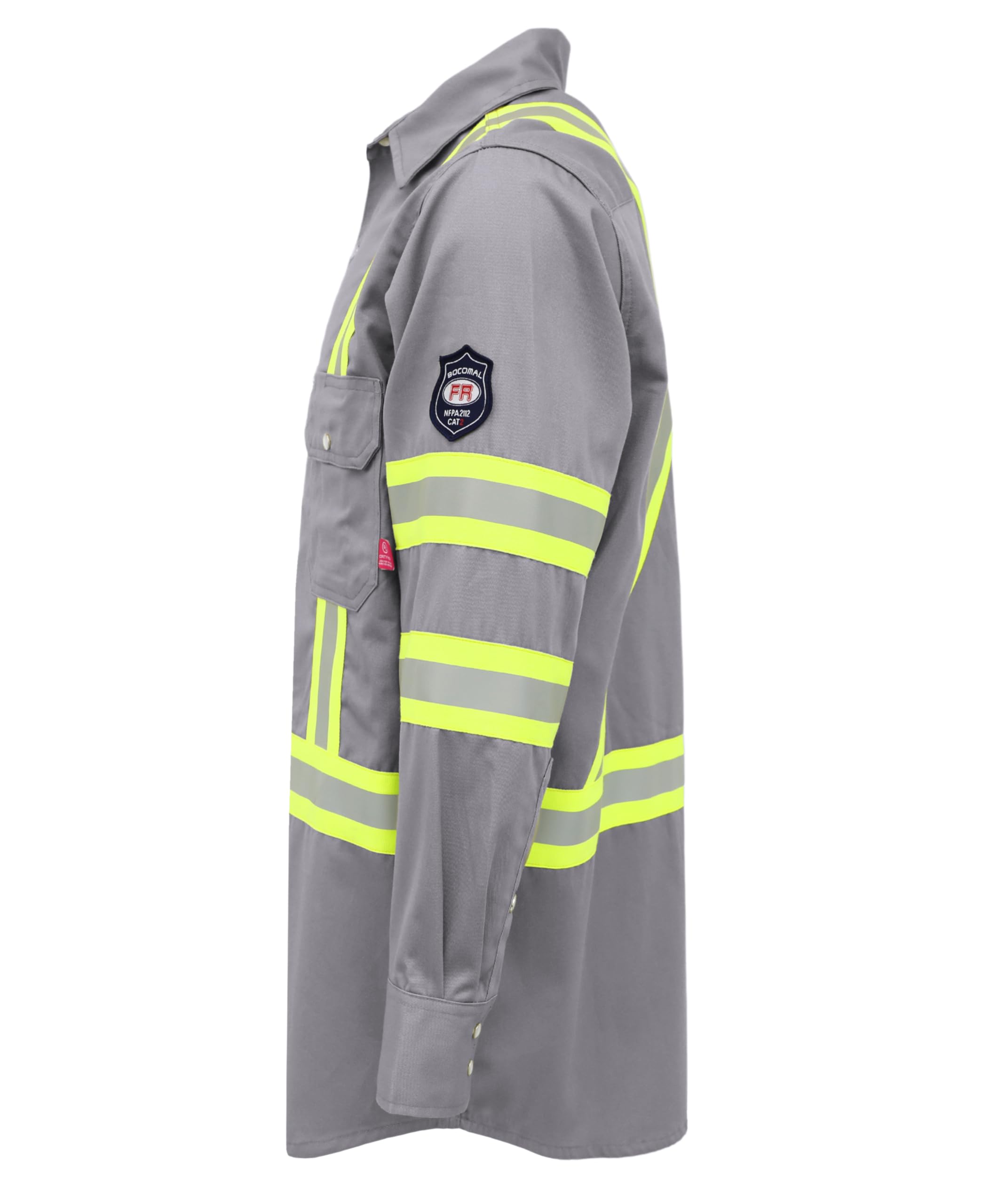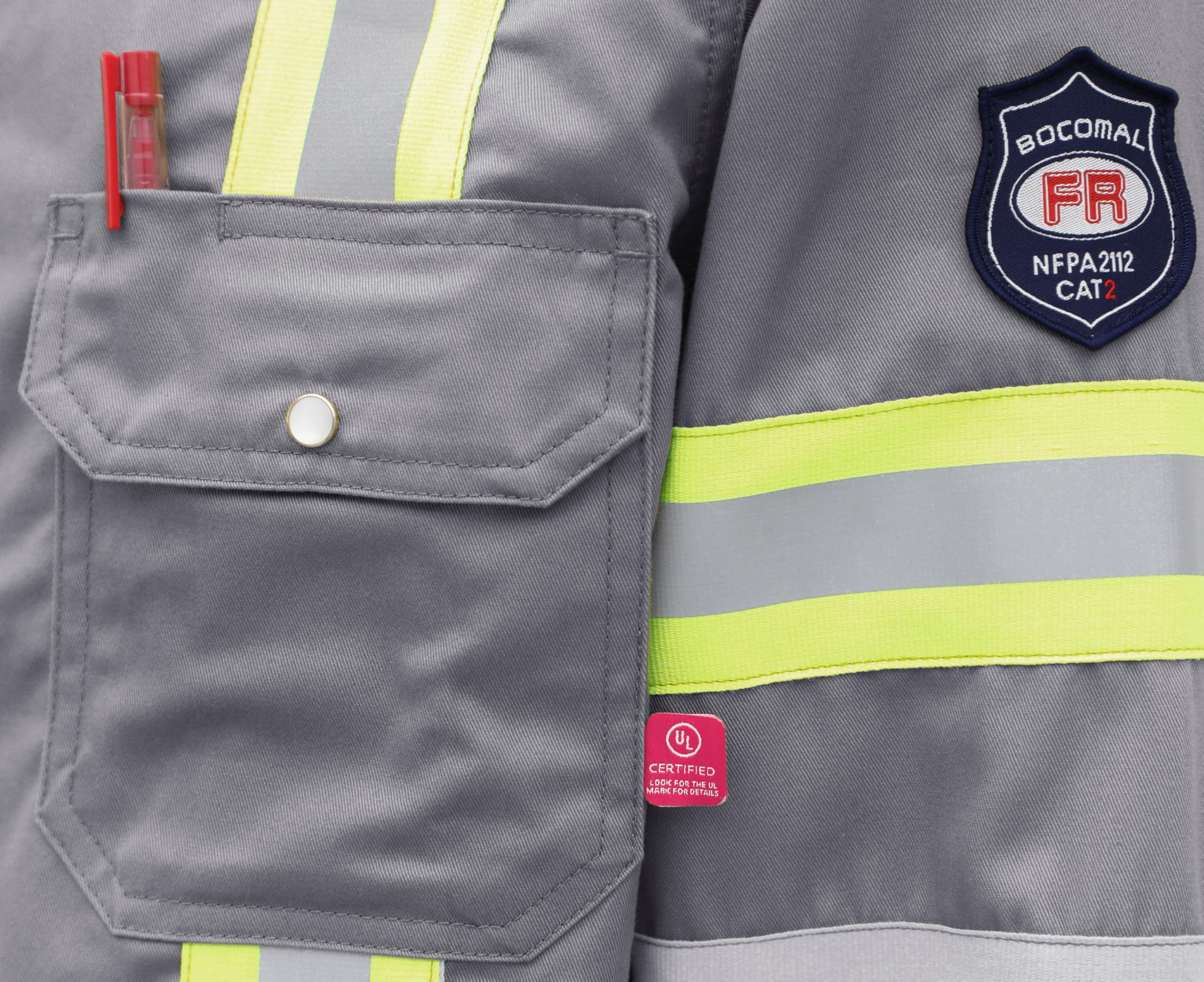 FR MATRIALS:7.5oz cotton twill FR treated,FR buttons,FR aramid sewing threads, 2.4" yellow reflective tape with 1" FR siliver paint-ANSI/ISEA 107-20 Type O CLASS 1.!More area reflection on back and arm.Clear FR tag on arms and more FR info on inside tag about UL certification.We attached a small sample inside package for customers simple FR try