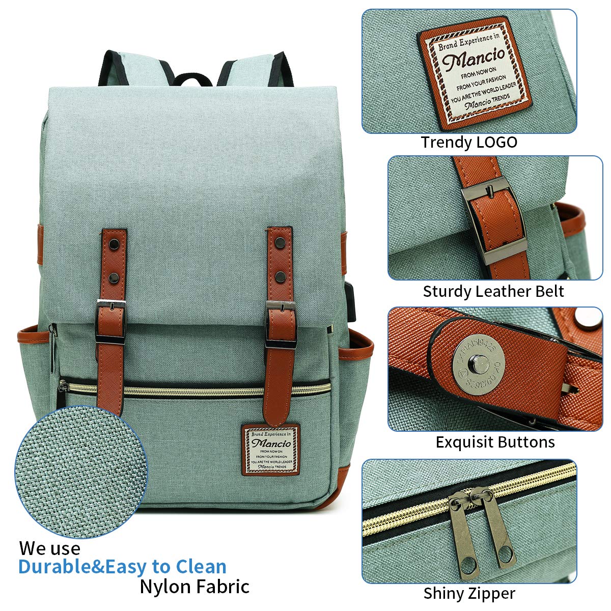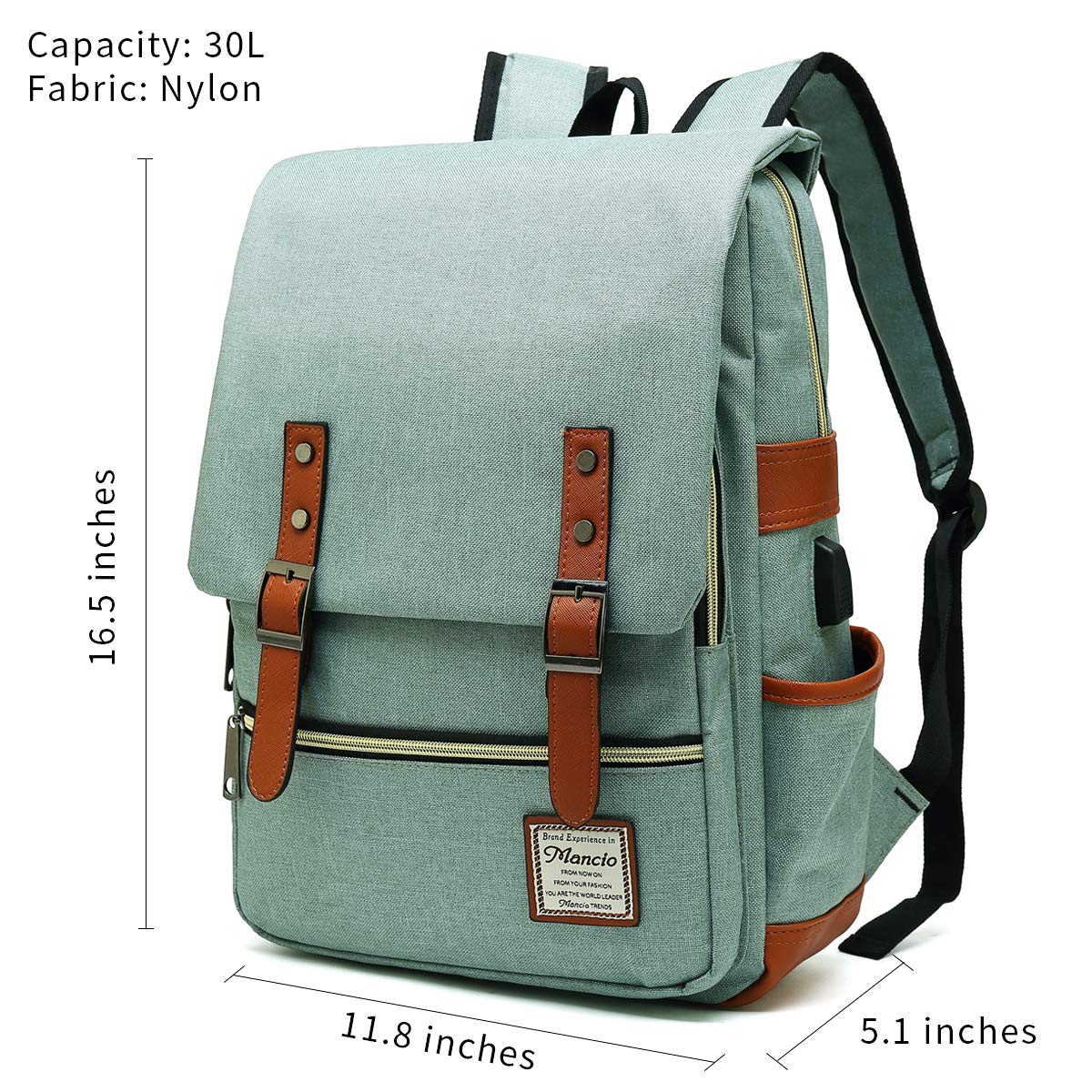 Mancio unique laptop backpack is an spacious vintage versatile bag,and the unisex style suitable for both men and women. Made of high grade tear & water resistant soft oxford materials feel comfortable which is extremely sturdy.Standout unique design with PU leather magnetic-snap belt flap on the front and felicitous PU leather decor make it's wonderful chic backpack. The usb backpack is closed with magnetic buttons and zippers, easy to open and close. The well-padded shoulder straps are comfortable and lightweight for you, which can also be adjusted. A comfortable backpack with durable fabric, also a perfect gift for your family, lover and friends. PRODUCT ATTRIBUTION: Size: 11.8"L x 16.5"H x 5.1"W, fits up to 15.6" laptop Weight: 1.62 LB Color: Green/Grey/Black/Purple PACKAGE INCLUDE: 1 x laptop backpack 1 x usb cable