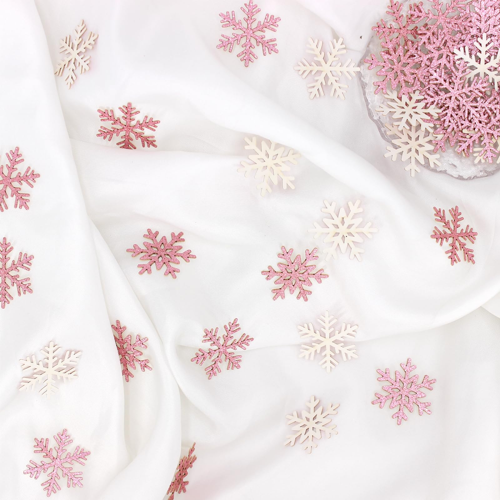 Premium quality,proper size.The small snowflakes for crafts are made from premium glittery paper card and well cut,the color is super shine.The pink snowflake decor size is 1.2inch,perfect for holiday crafts,recommend as table decorations or craft supply.