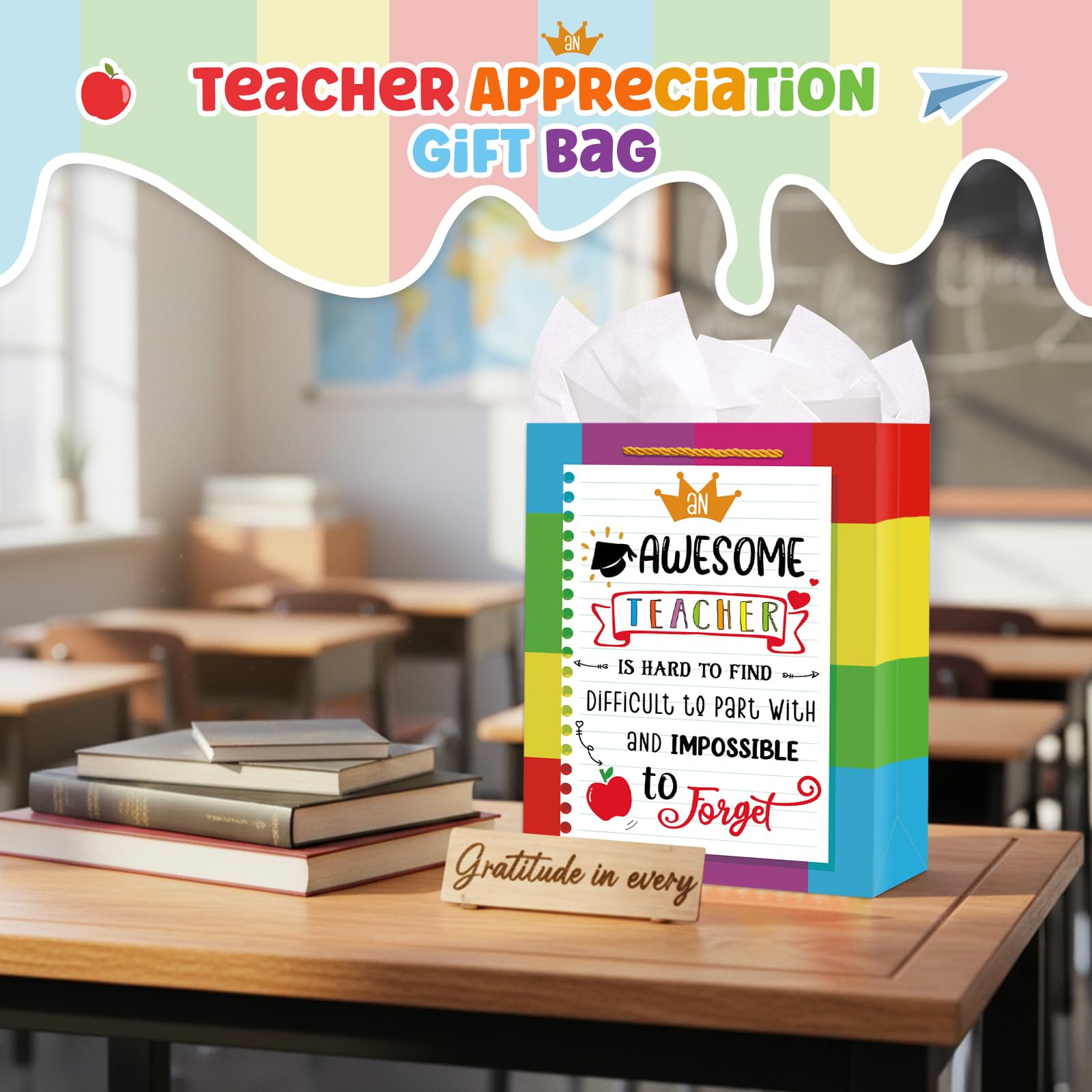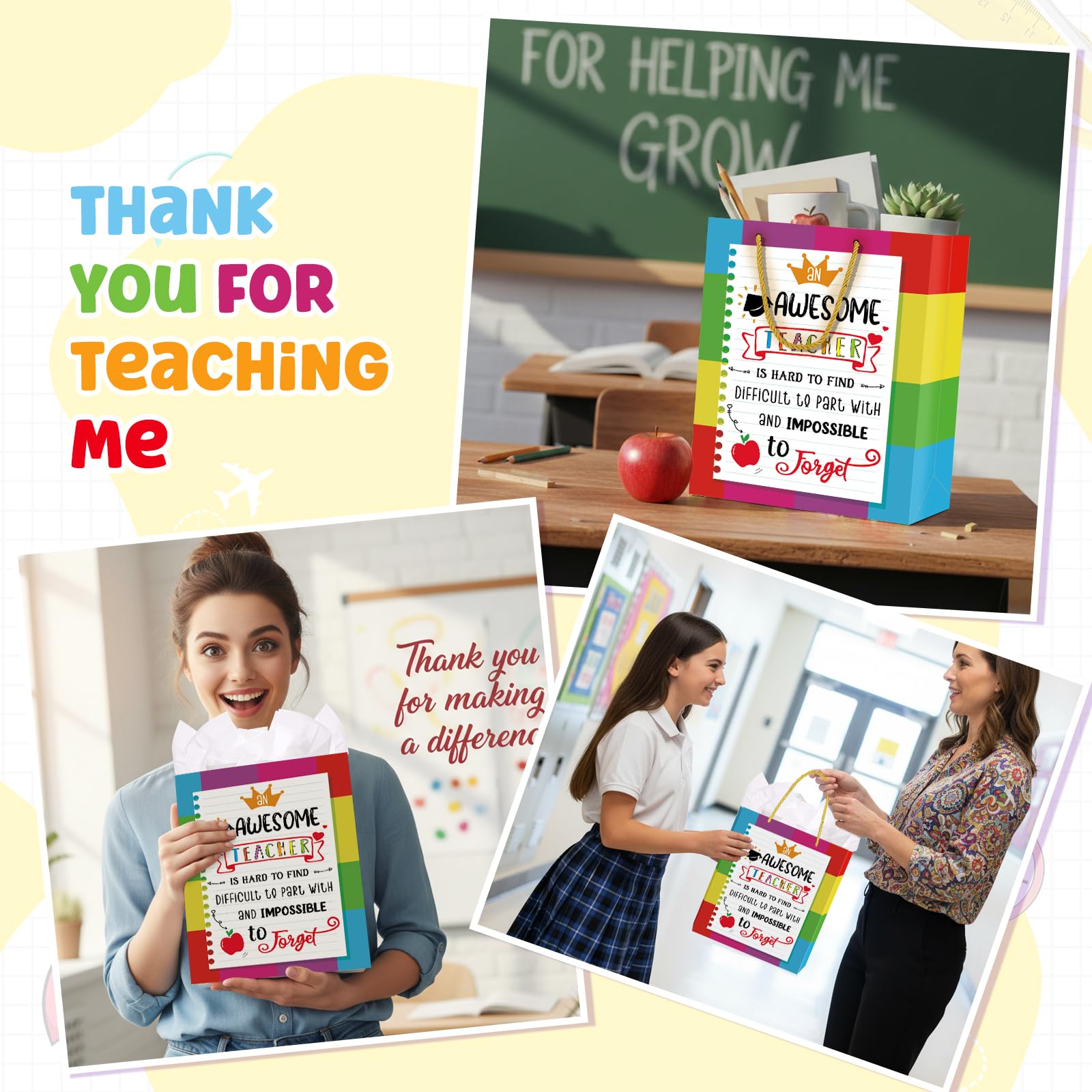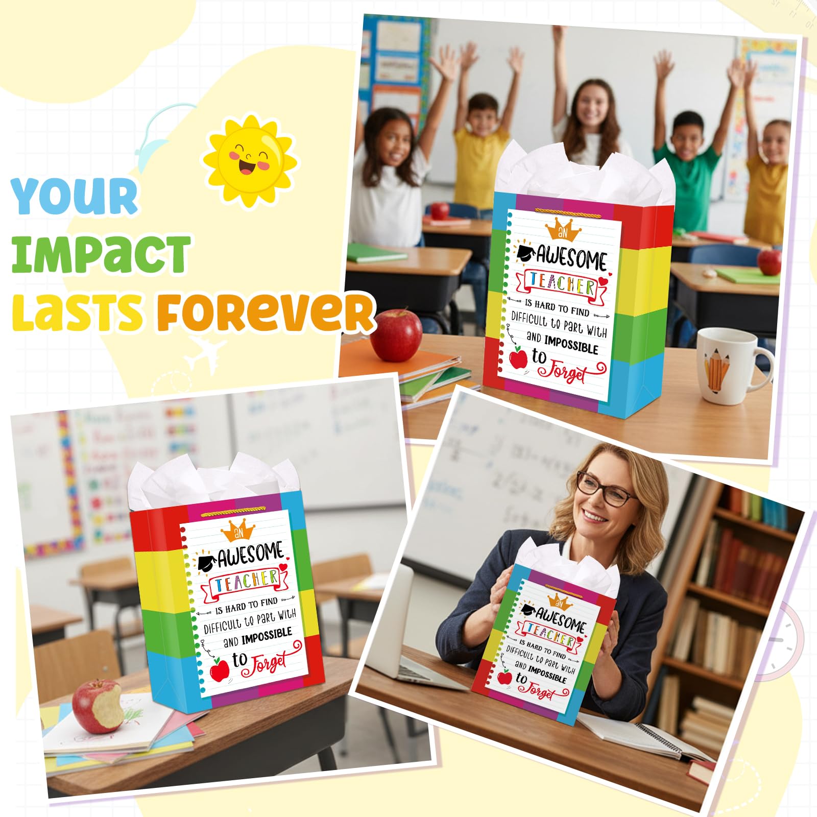 【Thank You Teacher Paper Gift Bags】: End of year teacher gift wrap bags adopt coloful rainbow themed,with graduation cap apple and crown teachers elements attractive patterns design,feature consists of thankful words "An Awesome Teacher is Hard to Find Difficult to Part with and Impssible to Forget".Great teacher appreciation gifts bags thank you teacher gifts to express gratitude for the teacher.