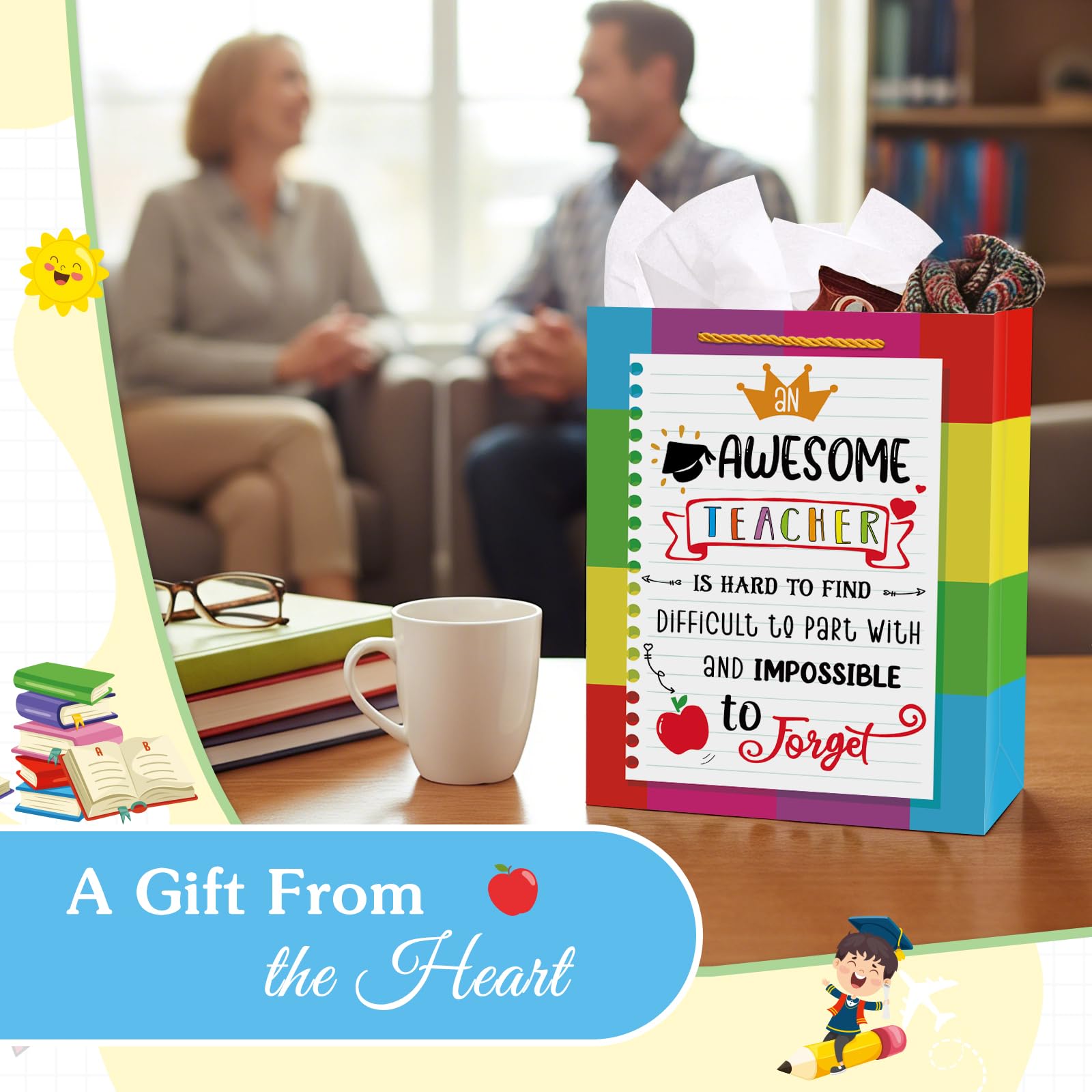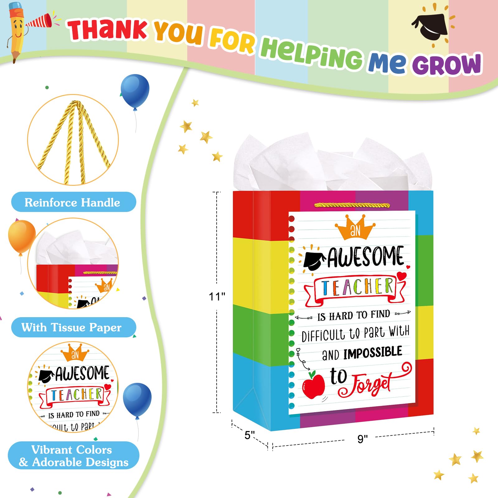 【High-quality Material】: Best teacher gifts end of year teachers gifts bags have a medium size of 11.5"x 9" x 5", the perfect size for you to hold teacher retirement gifts teachers appreciation day graduation gifts for teachers.The teacher gift bags is made of high quality cardboard which is reliable and reusable, sturdy and lightweight, not easy to break, tear or fade,each teacher gift bags come with rope handles.