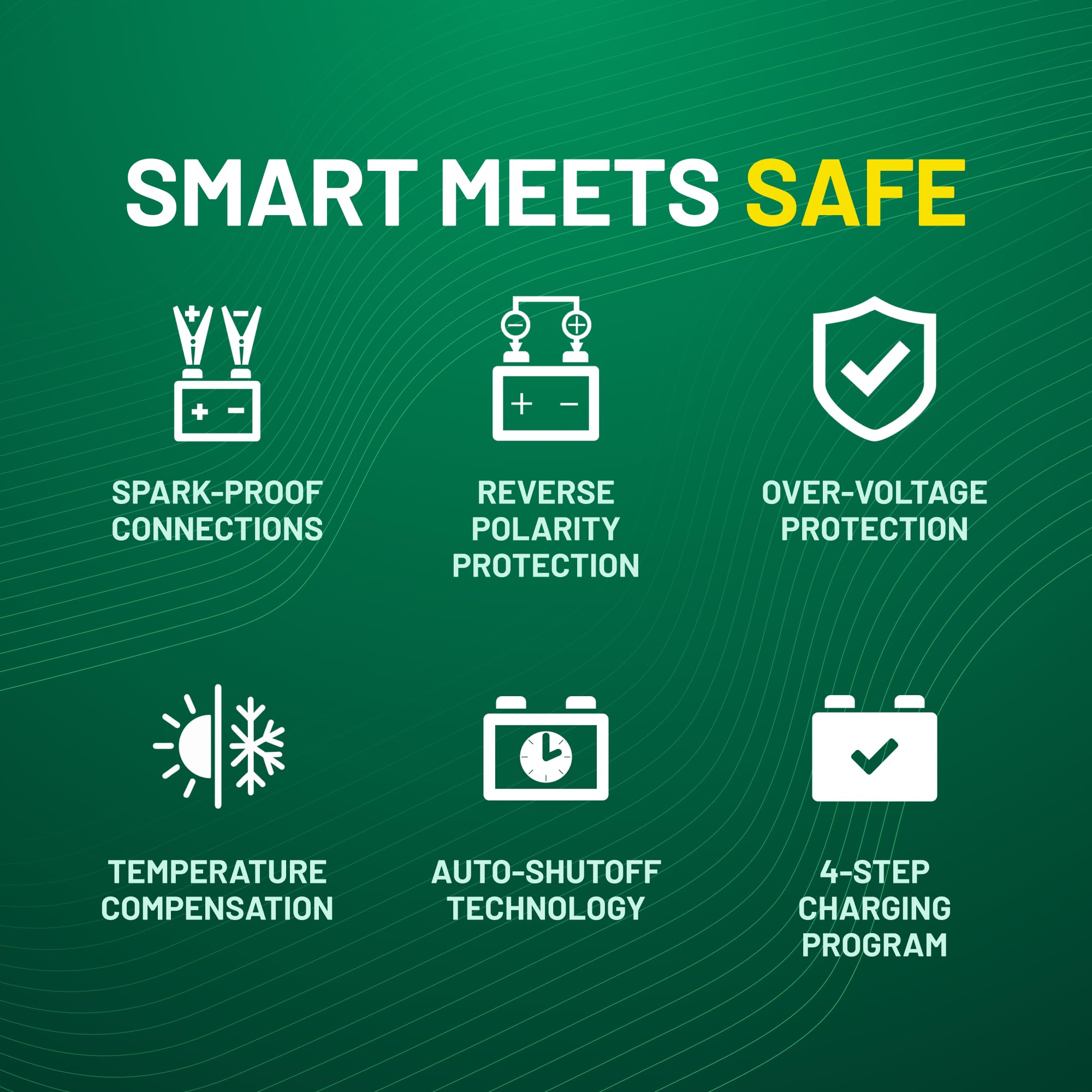 Simple & Safe: Low maintenance, easy-to-use, universal battery charger is just 3.3 x 1.3 x 2.4 inches, 1 lb (charger only). Spark-proof circuitry ensures no-spark connections, and automatic reversed hook-up detection verifies correct connection