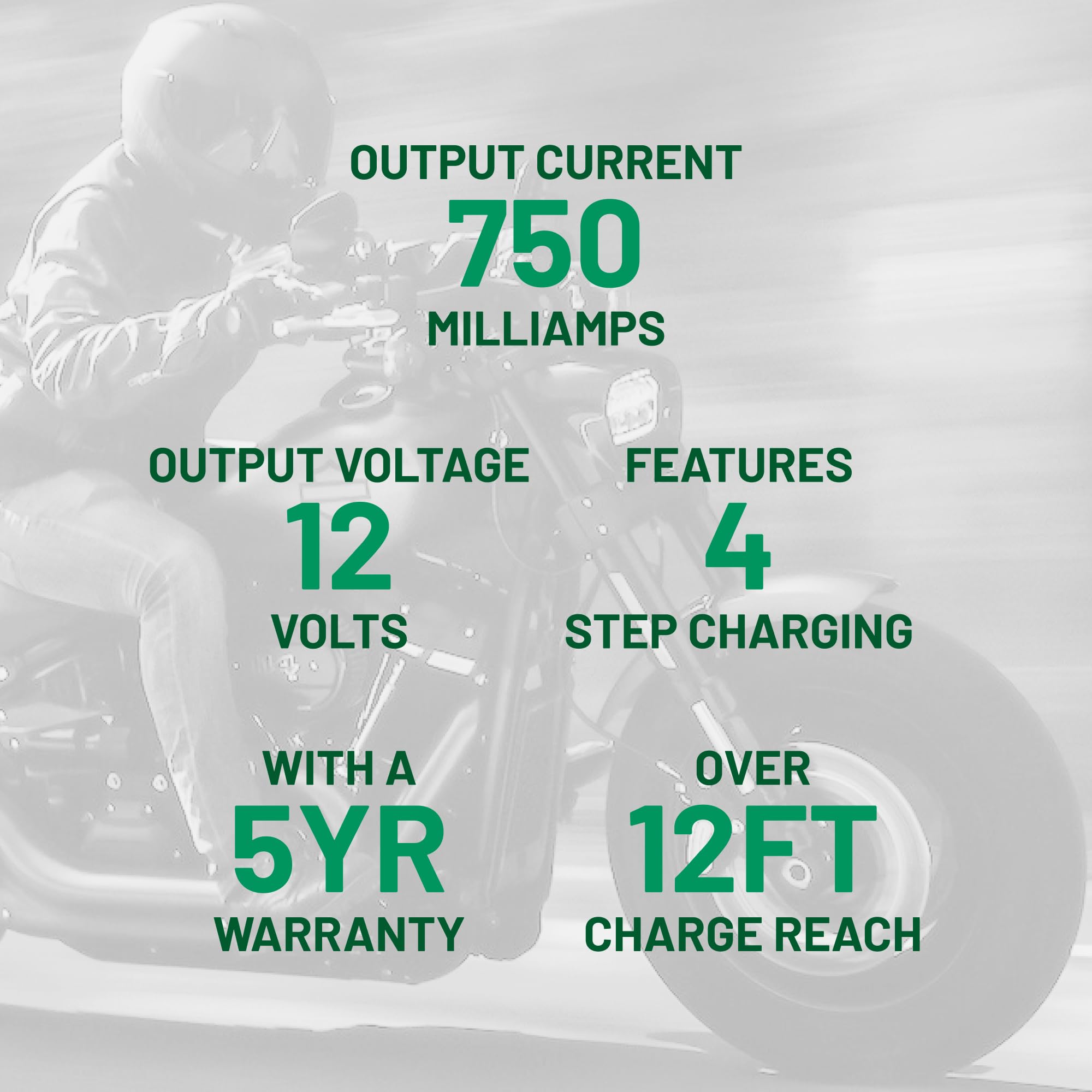 Includes: 12V, 750mA battery charger and battery maintainer with 12-foot output cord, fused-ring terminal harness for hard-to-reach batteries and alligator clip accessory cables, 5-year warranty, and lifetime customer support