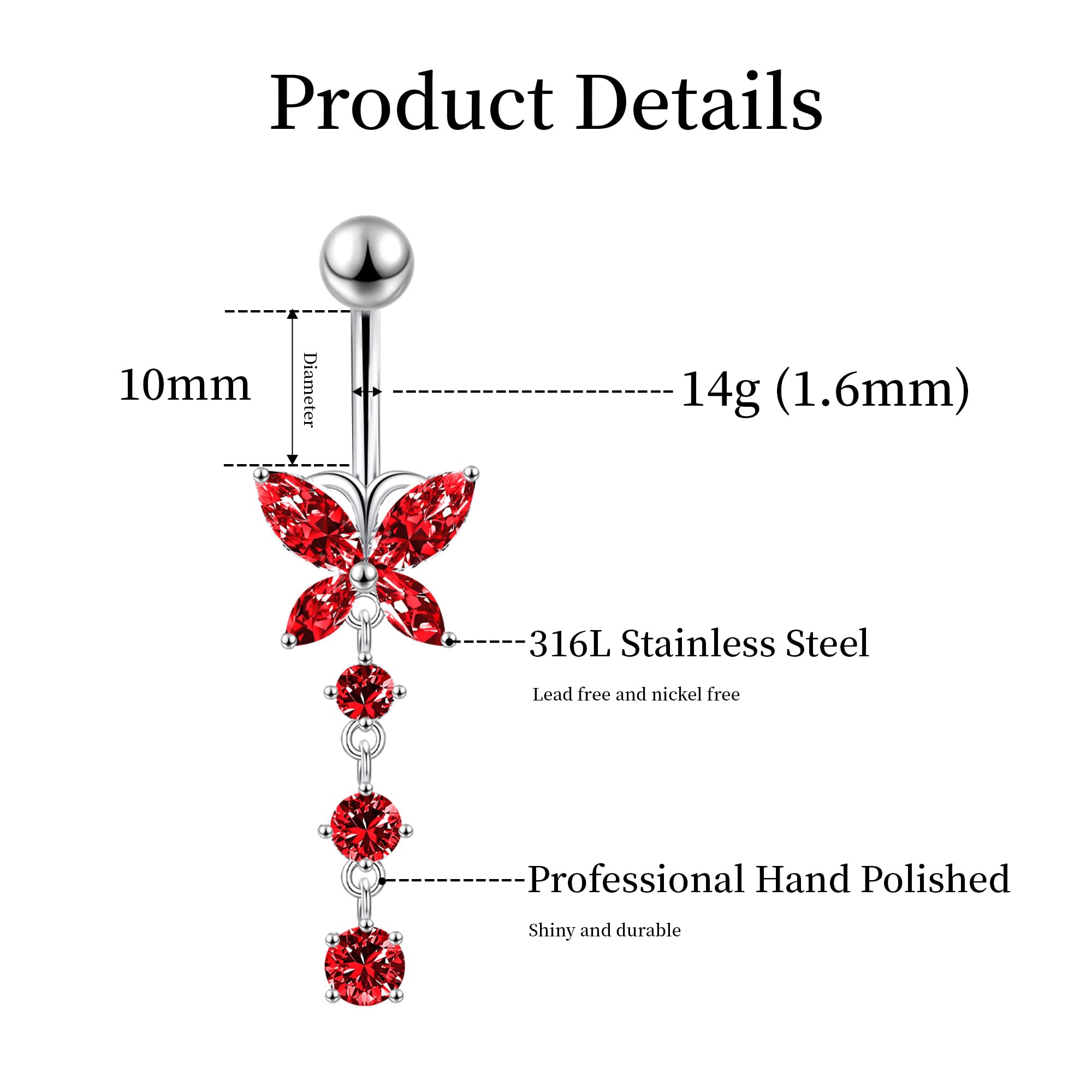 【BELLY RINGS SIZE】: The bar thickness of belly button piercing red: 14G, 10mm barbell length, 20mm-50mm dangle length. Common size of belly button jewelry, easy to screw on and off.