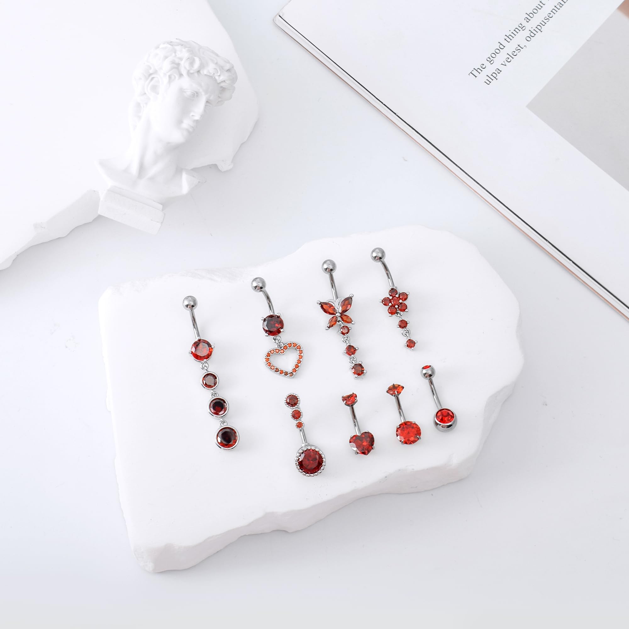 【BELLY RING】: One order includes 8pcs belly button rings: 4pcs short belly piercing and 4pcs long dangle belly button rings, flower, butterfly, heart belly button rings set, multiple style to match your outfit.