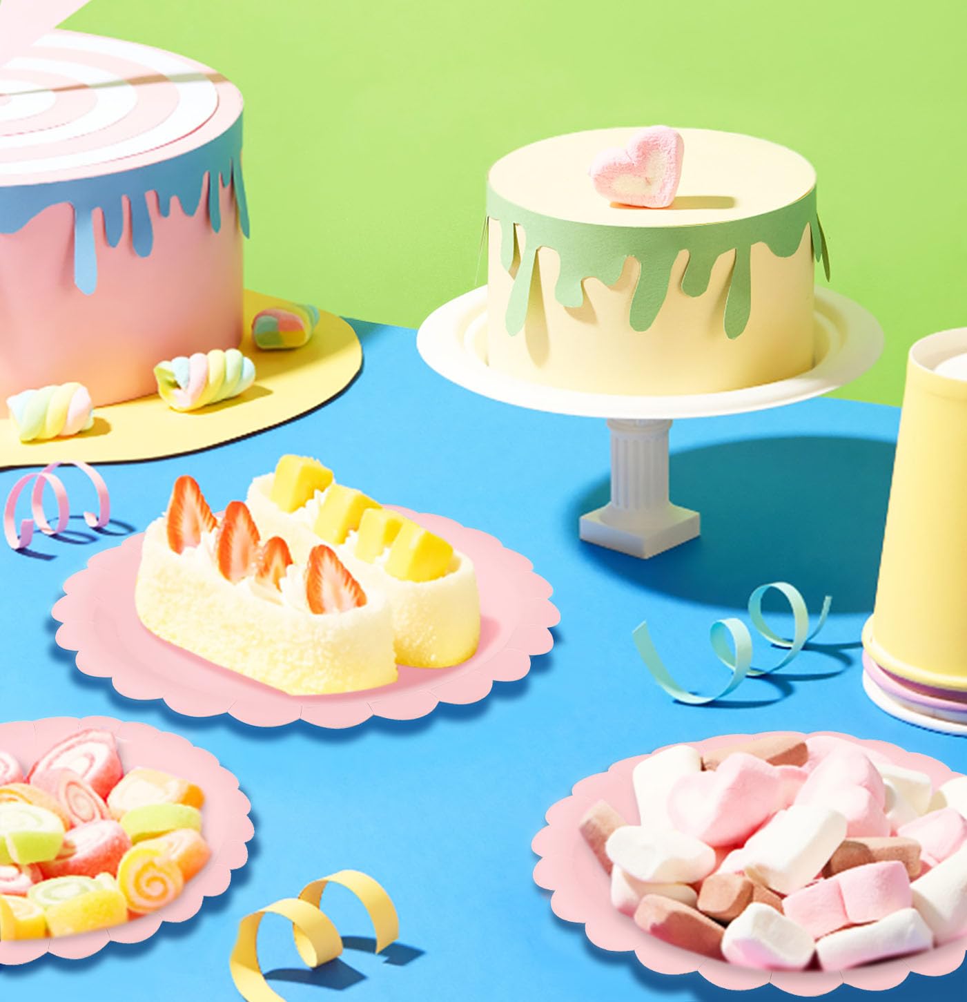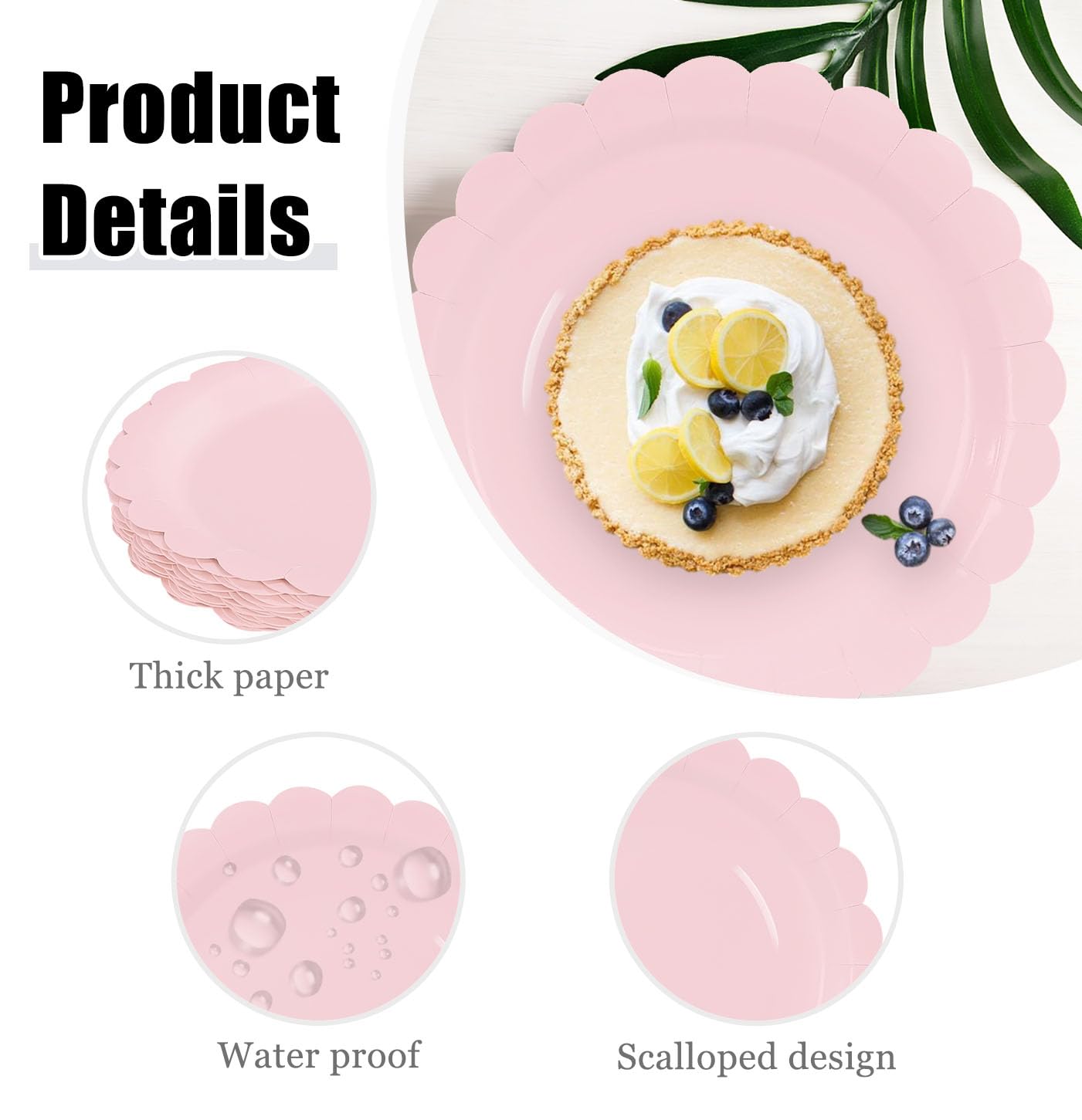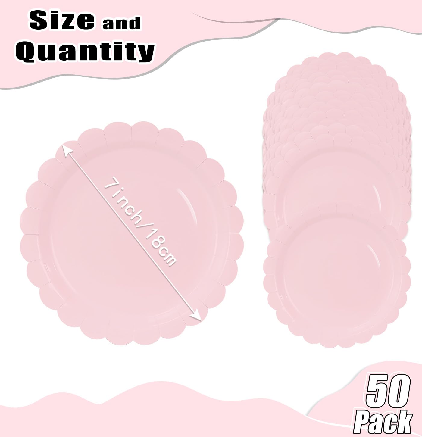 Light pink scalloped plates: You will get 50 pieces 7 inch pink scalloped paper plates, which are made of high-quality materials that are not easy to break, you can place food, dessert or other items on the pink scalloped disposable plates