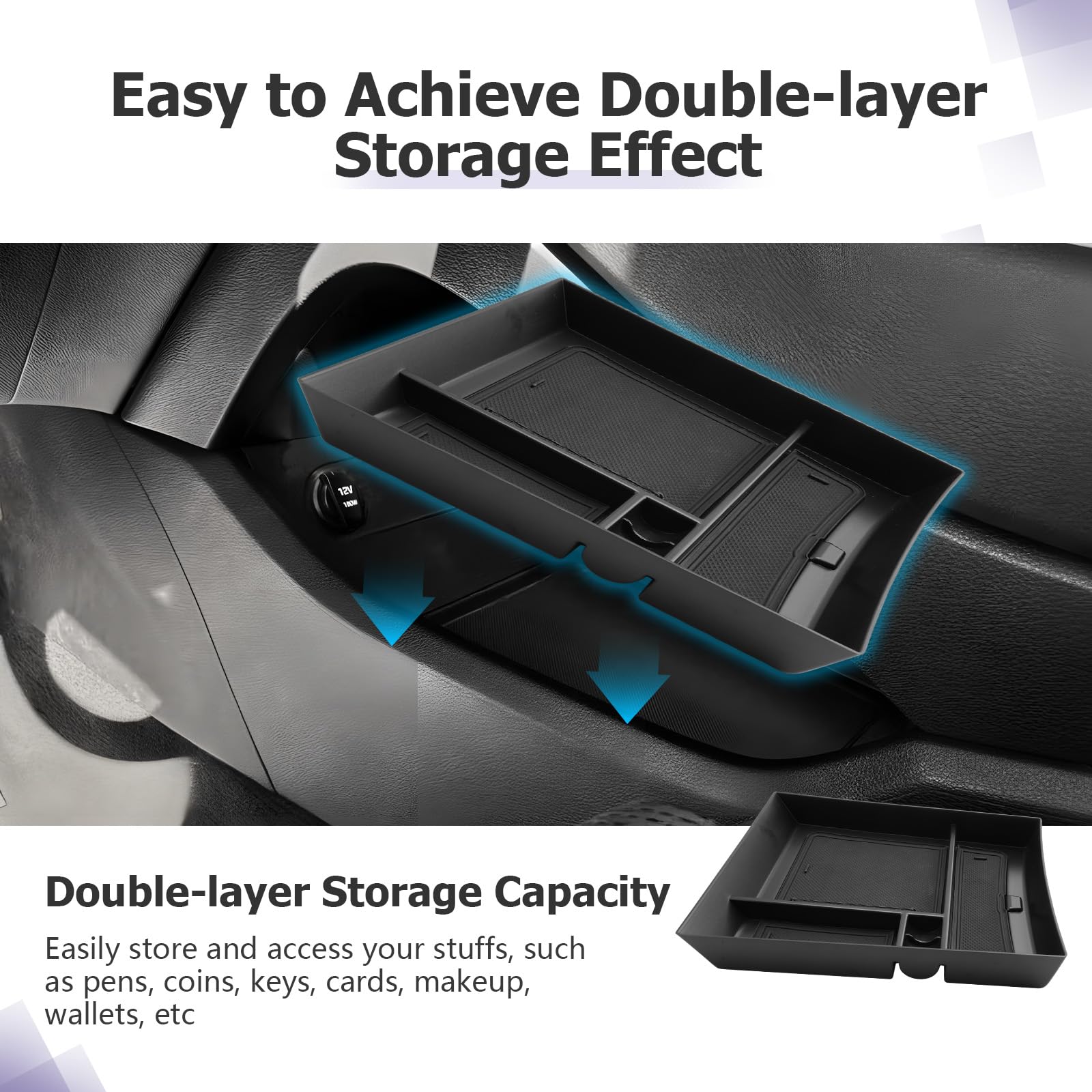 Easy to clean — The Santa Fe accessories 2022,2022 Santa Fe accessories,car armrest glove box 2023 Santa Fe accessories contains a rubber tray bottom liner, which can be placed when picking up keys or other items to reduce collision noise. Santa Fe glove box organizer can also be easily taken out and wiped with a wet wipe for easier cleaning