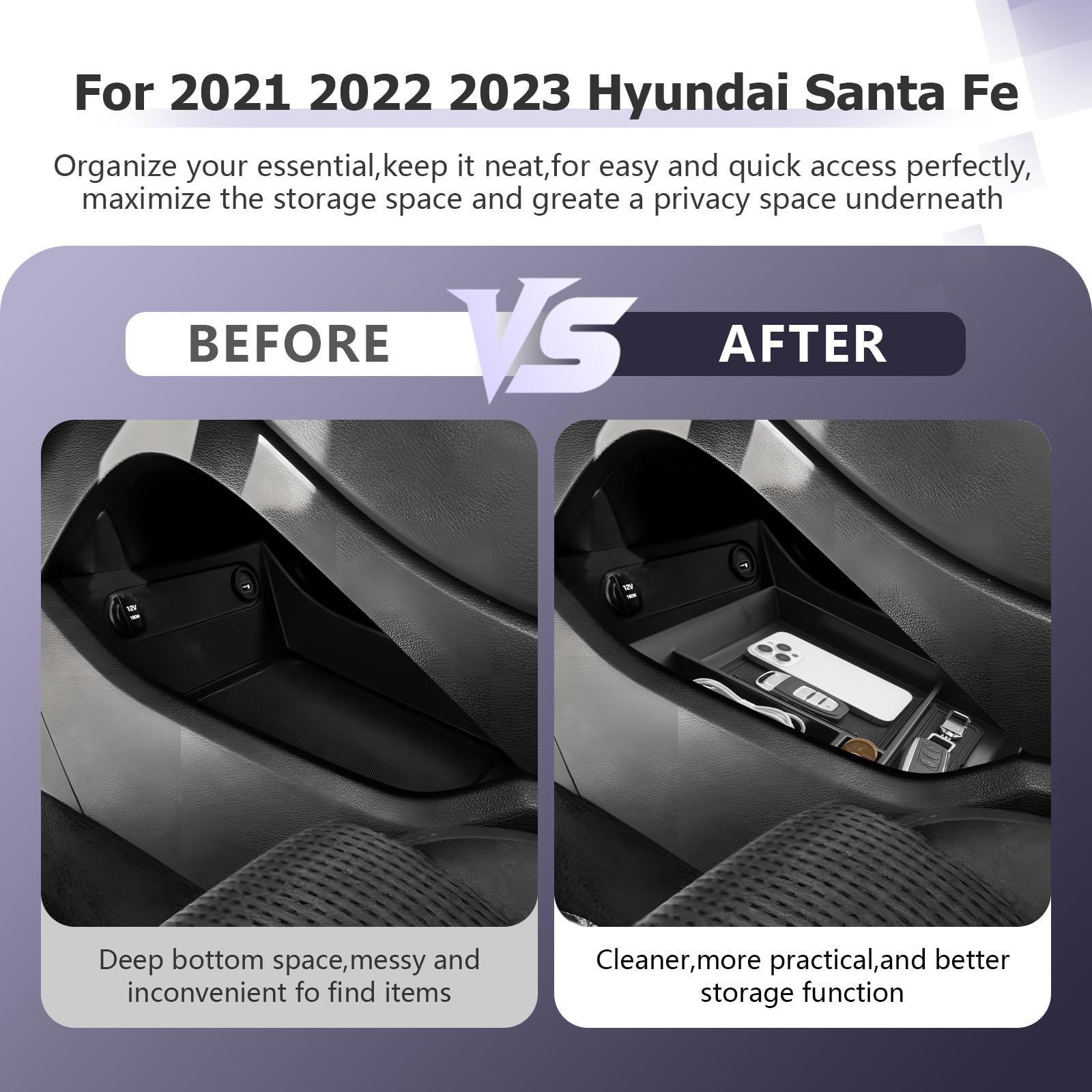 Tool-Free Installation — Easily disassemble the Santa Fe accessories,car center console storage box, and directly insert the Santa Fe armrest console organizer into the center console, without modification, no cutting/tools. The Santa Fe center console organizer overall texture structure can be well integrated with the shift console, without abrupt display