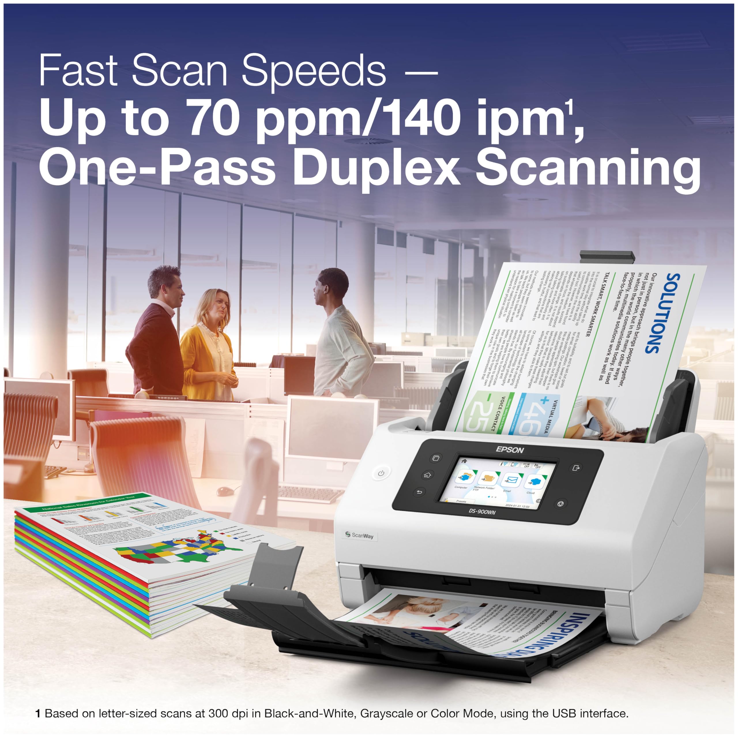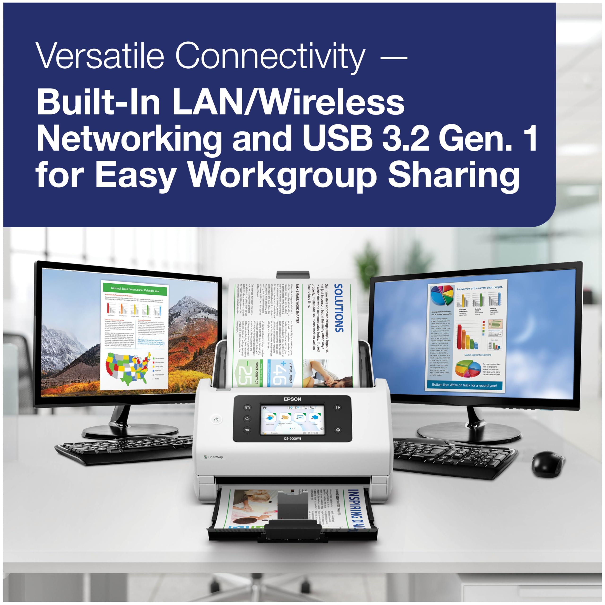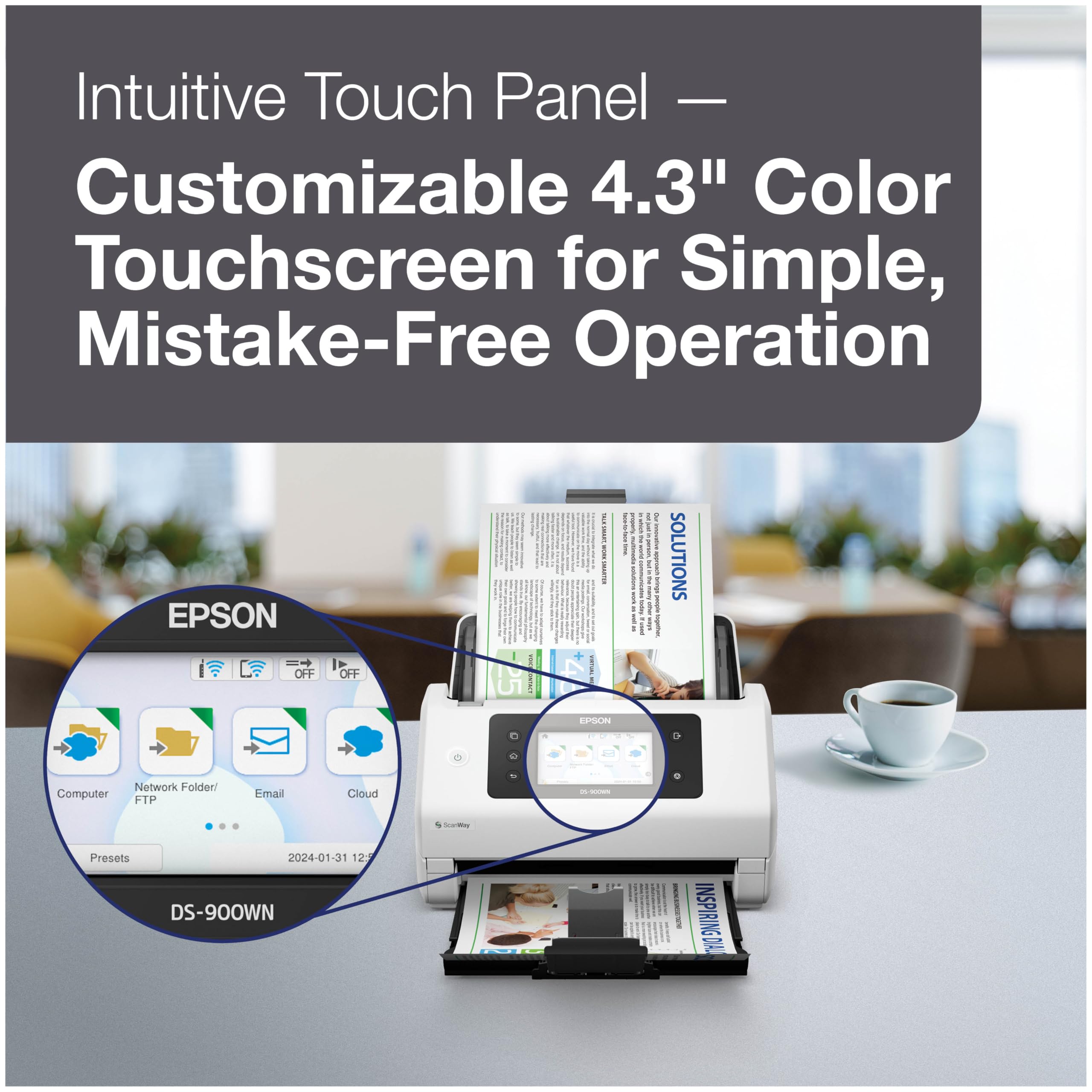 The DS-900WN is designed to be the perfect edge device for pulling digitized scan data into your document management solutions. EdgeLink scanners from Epson have built-in integrations with supported third-party software platforms. This allows end users to access their applications directly through the scanner’s large 4.3" color touchscreen. For smaller businesses and organizations, Epson’s powerful Document Capture Pro software is included, with features such as scanning to searchable PDF files. With accurate, high-quality scans at speeds up to 70 ppm/140 ipm (1) and a 100-page Auto Document Feeder (ADF), the DS-900WN is engineered to bring speed, reliability and ease of use to your workflows. The scanner also supports ScanWay PC-free scanning, allowing you to scan to a USB flash drive (2), email (3), network folders (3) or popular cloud services (4) without the need to install any software. For implementations needing advanced administration, Epson offers a robust suite of optional solutions for the scanner that facilitate centralized management, reporting, and server-based capture and authentication (including Active Directory). Make document management work for you with the exceptional DS-900WN. 1. Based on letter-sized scans at 300 dpi in Black-and-White, Grayscale or Color Mode, using the USB interface. | 2. USB device maximum capacity of 2TB (formatted in FAT, FAT32 or exFAT). Devices with security settings (such as password or encryption) or those requiring a dedicated driver cannot be used. | 3. Network connection is required. | 4. Epson Connect account and activation required. Internet connection is required. | 5. Peak daily duty cycle is the highest recommended number of scanned sheets per day. For best results, do not exceed the peak daily duty cycle. Calculations based on maximum scanning speed and an assumed daily use time. Scan speed varies depending on network conditions.