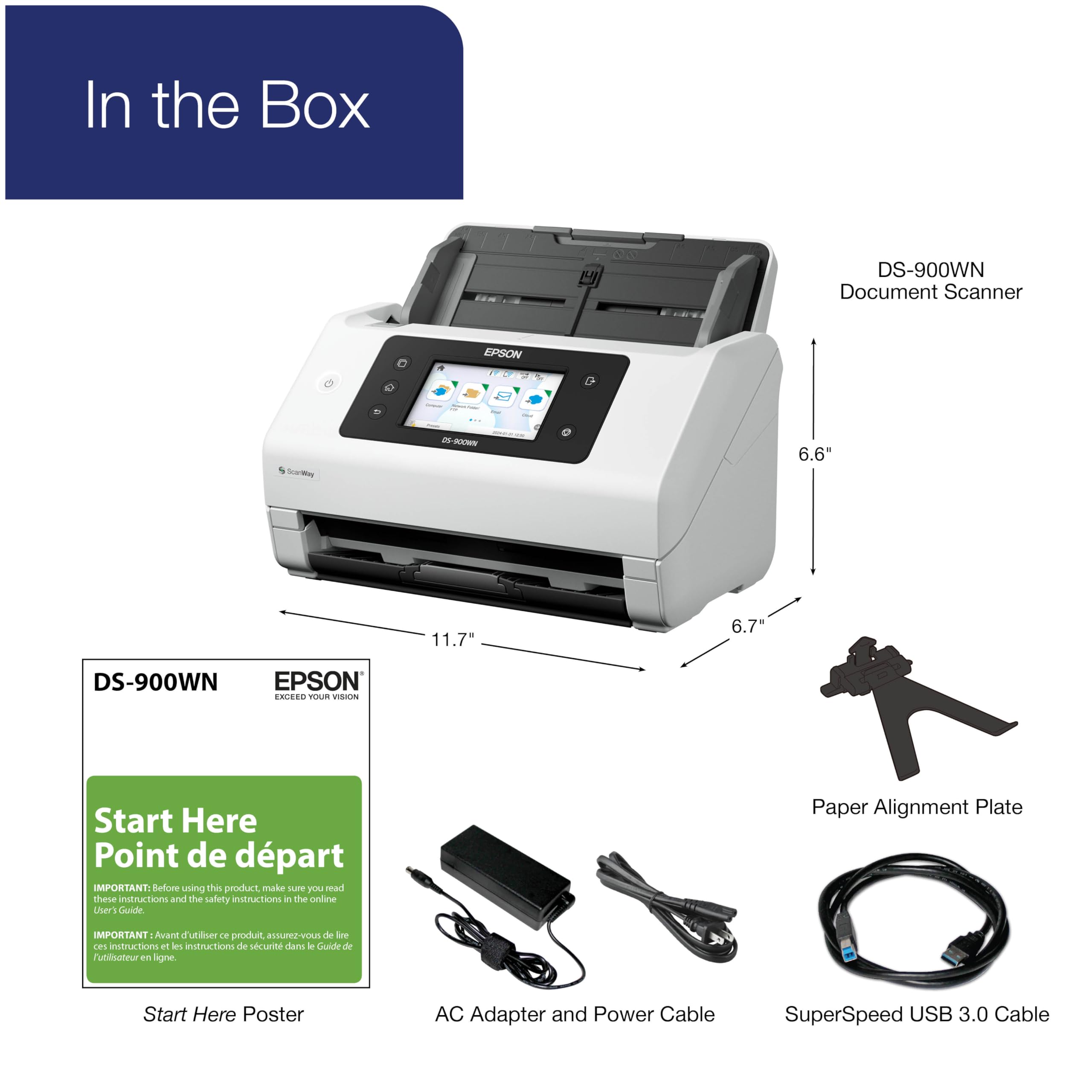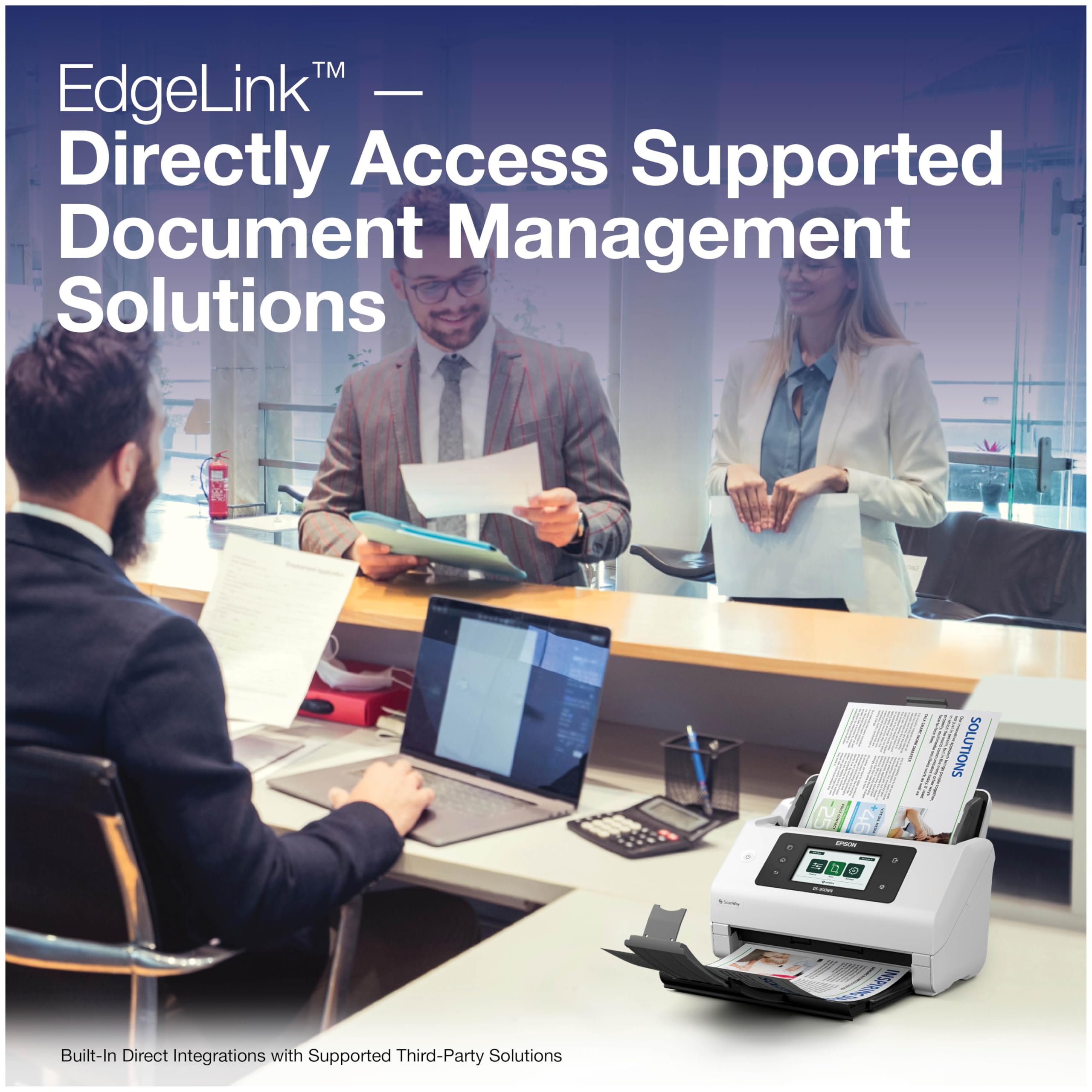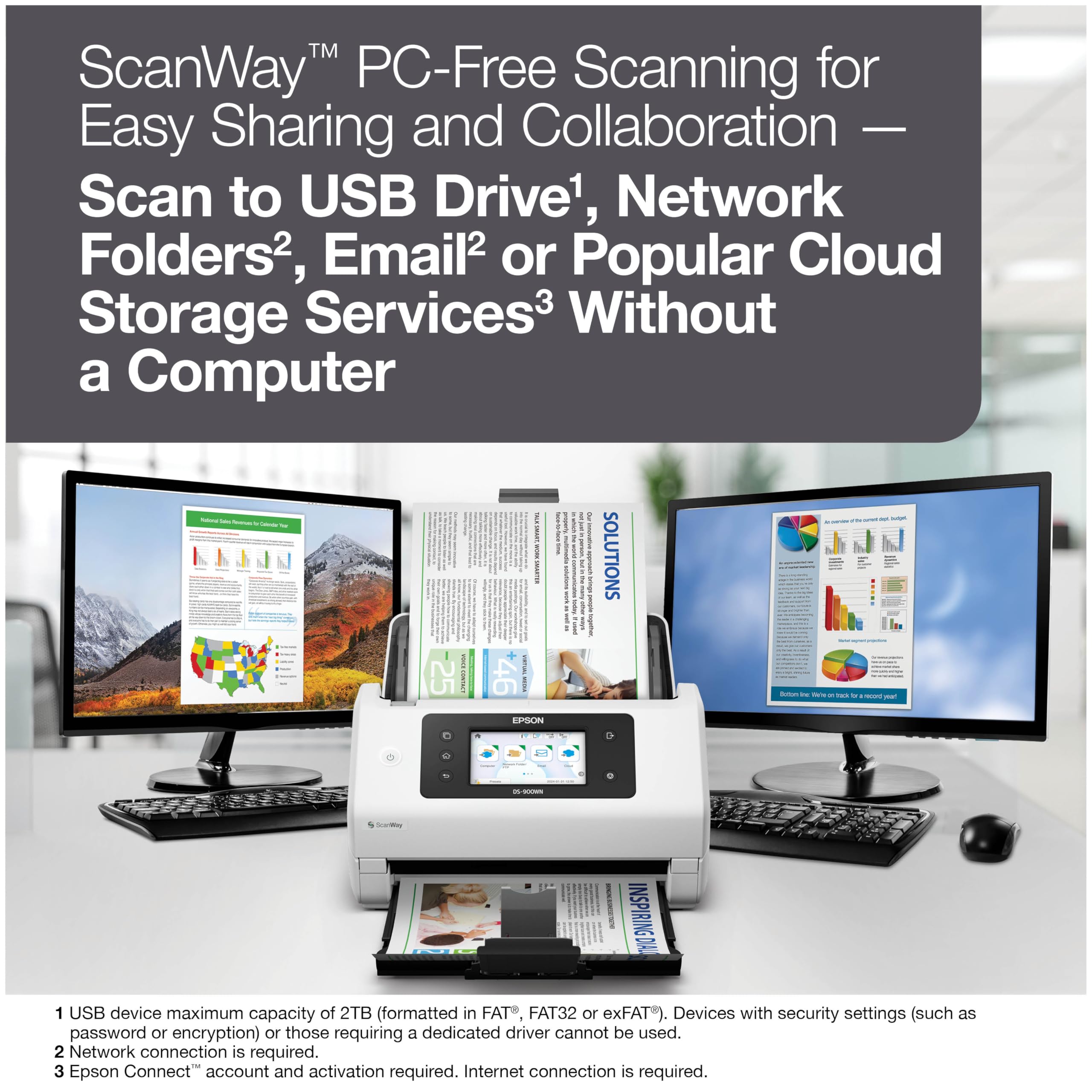 The DS-900WN is designed to be the perfect edge device for pulling digitized scan data into your document management solutions. EdgeLink scanners from Epson have built-in integrations with supported third-party software platforms. This allows end users to access their applications directly through the scanner’s large 4.3" color touchscreen. For smaller businesses and organizations, Epson’s powerful Document Capture Pro software is included, with features such as scanning to searchable PDF files. With accurate, high-quality scans at speeds up to 70 ppm/140 ipm (1) and a 100-page Auto Document Feeder (ADF), the DS-900WN is engineered to bring speed, reliability and ease of use to your workflows. The scanner also supports ScanWay PC-free scanning, allowing you to scan to a USB flash drive (2), email (3), network folders (3) or popular cloud services (4) without the need to install any software. For implementations needing advanced administration, Epson offers a robust suite of optional solutions for the scanner that facilitate centralized management, reporting, and server-based capture and authentication (including Active Directory). Make document management work for you with the exceptional DS-900WN. 1. Based on letter-sized scans at 300 dpi in Black-and-White, Grayscale or Color Mode, using the USB interface. | 2. USB device maximum capacity of 2TB (formatted in FAT, FAT32 or exFAT). Devices with security settings (such as password or encryption) or those requiring a dedicated driver cannot be used. | 3. Network connection is required. | 4. Epson Connect account and activation required. Internet connection is required. | 5. Peak daily duty cycle is the highest recommended number of scanned sheets per day. For best results, do not exceed the peak daily duty cycle. Calculations based on maximum scanning speed and an assumed daily use time. Scan speed varies depending on network conditions.