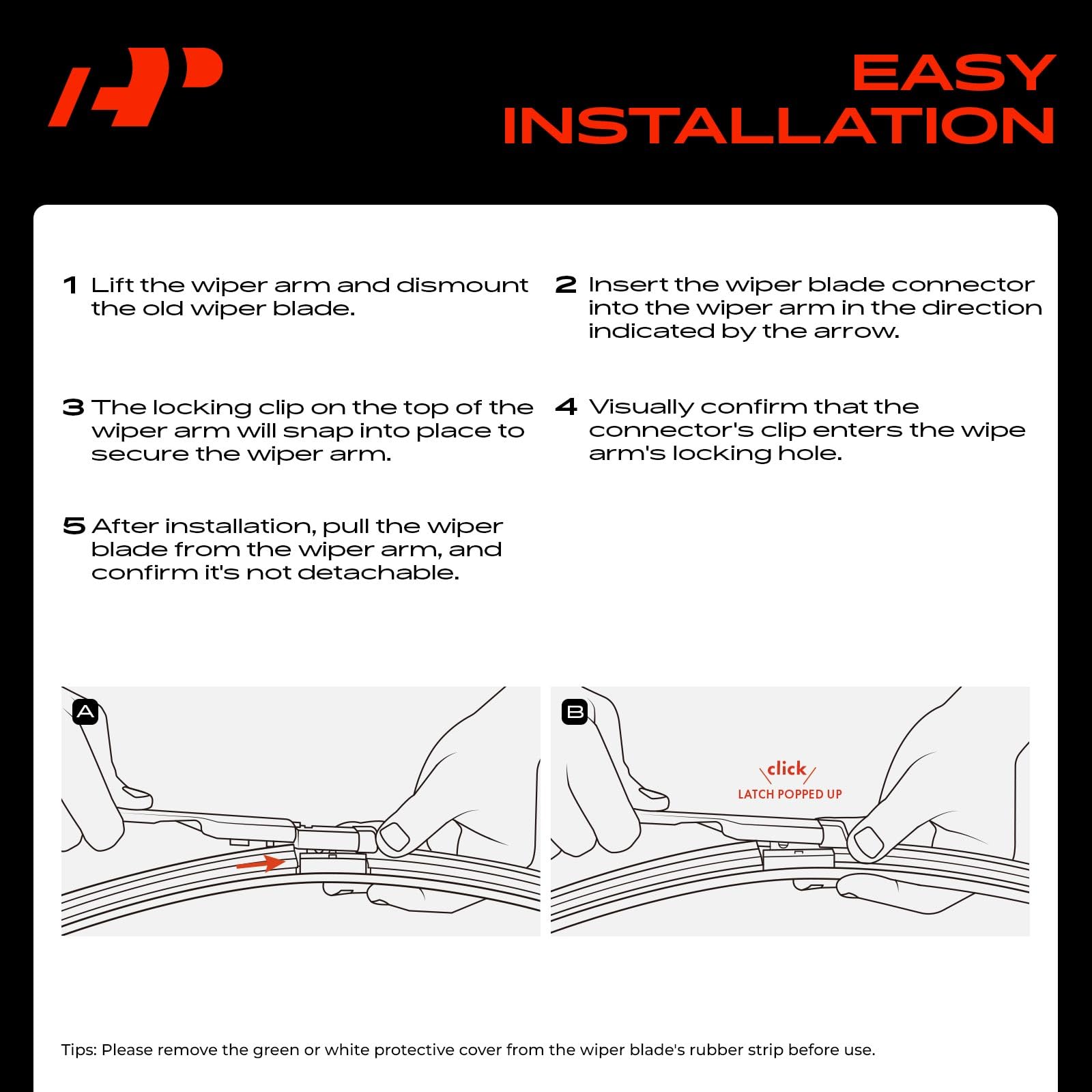 [Installation Guideline]: Easy installation. Compatible with A-Premium CR-V Wiper Blades. The adapter comes pre-installed, so simply locate the corresponding method in the manual based on your wiper mounting and adapter types. The wiper blade protector must be removed before use. Use the included towel for windshield protection during installation