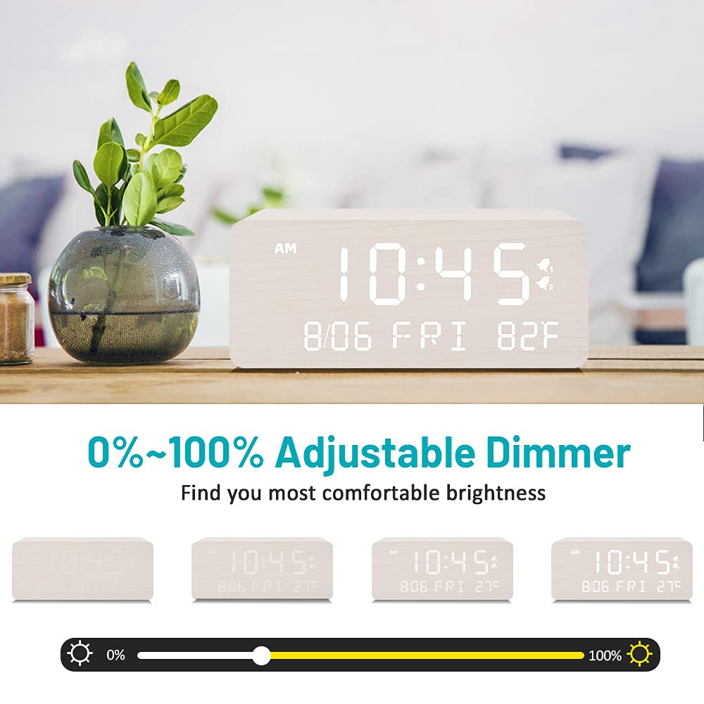 ⏰【5 Level Brightness Adjustable alarm clock】- Compared with the alarm clocks on the market that only have three levels of brightness adjustment, this wooden alarm clock is upgraded to 5-level dimming. Customers can adjust the brightness to 5 percentile(0, 20%, 40%, 60%, 80%, 100%), which solves the problem of too bright display at night and helps you fall asleep better.
