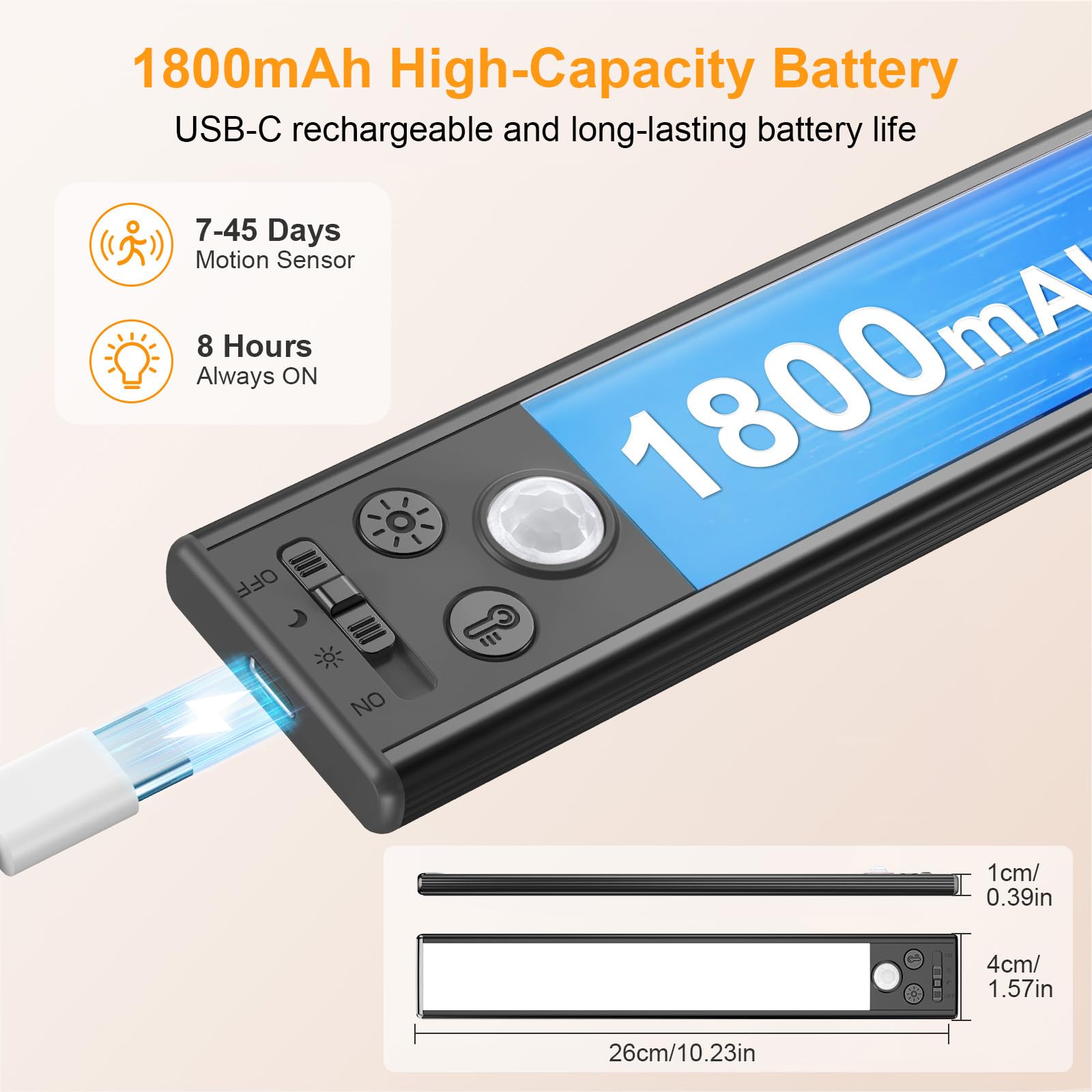 USB-C Rechargeable & Long-lasting: Built-in 1800mAh high-capacity battery, it offers up to 8 hrs in high brightness mode and lasts 45 days in sensor mode. It can be easily recharged by the type-C cable, no need to charge frenquently. It's the perfect choice for upgrading your home lighting! (2 USB-C cables included)