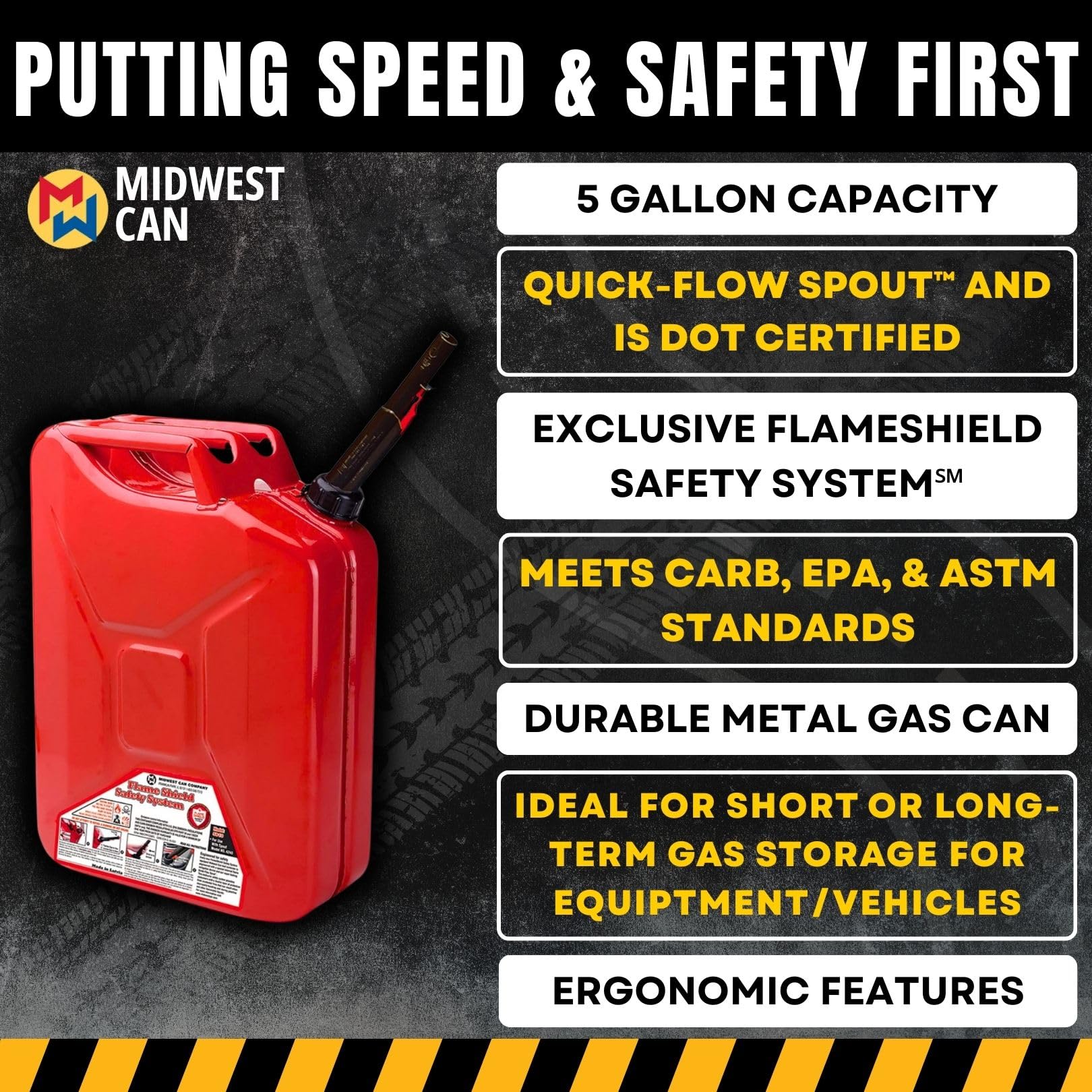 Features superior design with EPA/CARB compliant spout. Use for filling a lawn mower, snow blower or ATV. Quick flow spout provides safe fuel storage & easy pouring where you want when you want. Wide base & lower center of gravity reduces the chance of a can tipping over. Spouts close automatically with an air tight seal. Cans have a flame mitigation device to provide an extra layer of safety. Spout assembly included. Capacity: 5 gallon Color: Red Superior design with EPA/CARB compliant spout Use for filling a lawn mower, snow blower or ATV Quick flow spout provides safe fuel storage & easy pouring where you want when you want Wide base & lower center of gravity reduces the chance of a can tipping over Made of durable HDPE Spouts close automatically with an air tight seal Cans have a flame mitigation device to provide an extra layer of safety Spout assembly included.Midwest Can has always been committed to product innovation across their entire line of offerings.