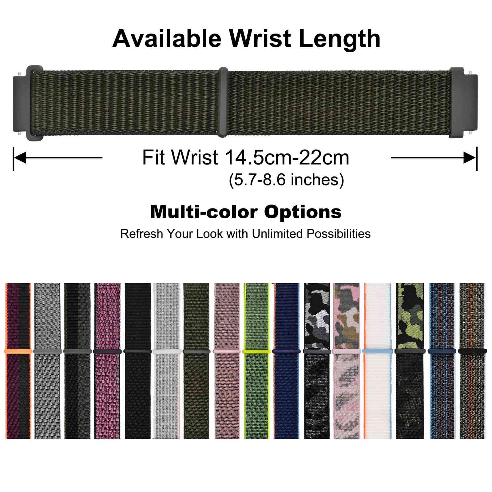 Band Width (Size): Standard 16mm, 18mm, 19mm, 20mm, 21mm, 22mm, 24mm. This watch band is compatible with all watches (including smart watches) with above band width. To determine the right size, use a ruler measure the interior distance between the two lugs on the watch case.
