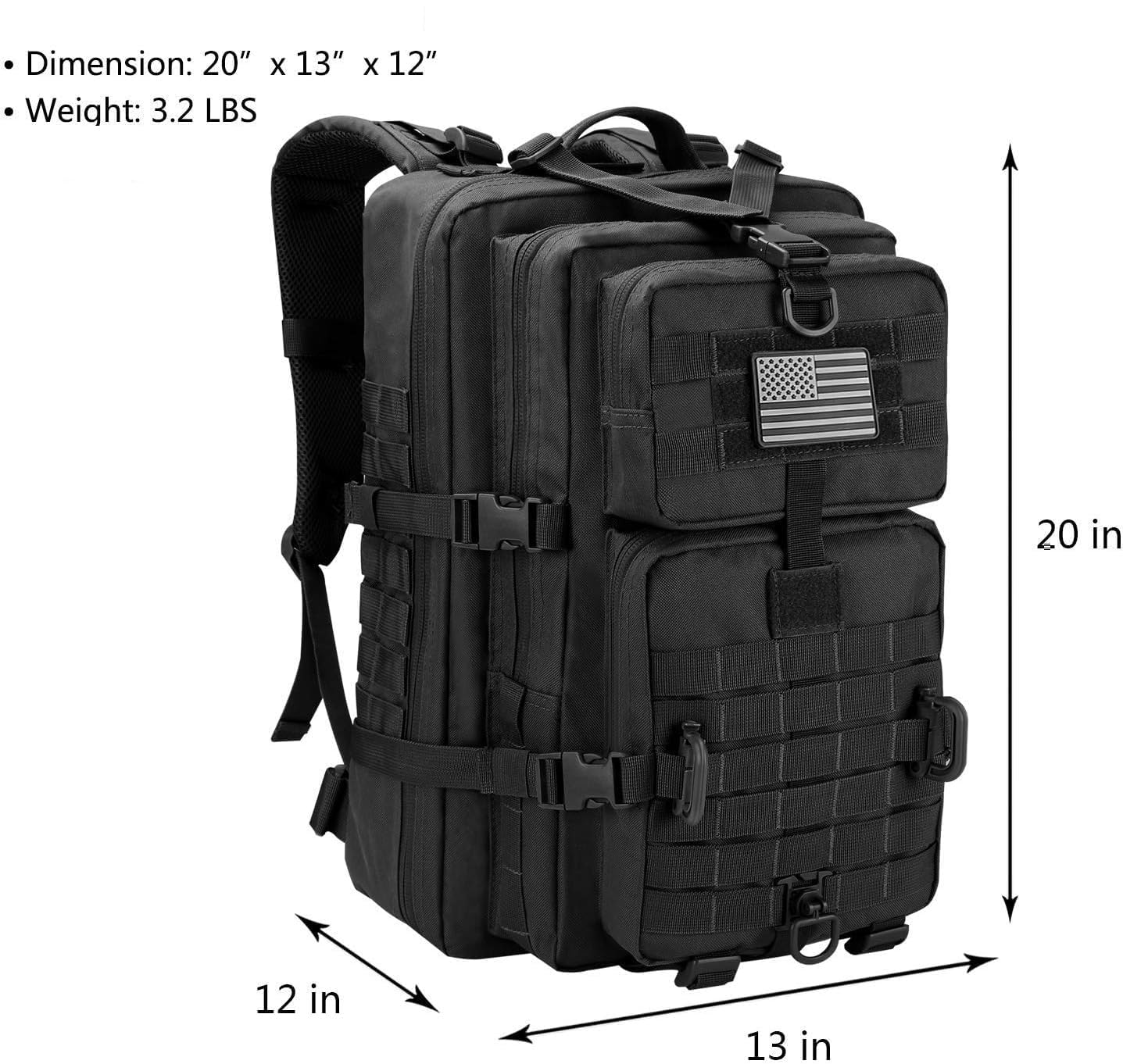 LARGE CAPACITY - Military tactical backpack size approx.:12"*20"*13" / 30*50*33CM (W*H*D) This 40L tactical military assault backpack is made of quality and water-resistant High Density fabric, works great with 3L hydration bladder(hydration bladder do not include)