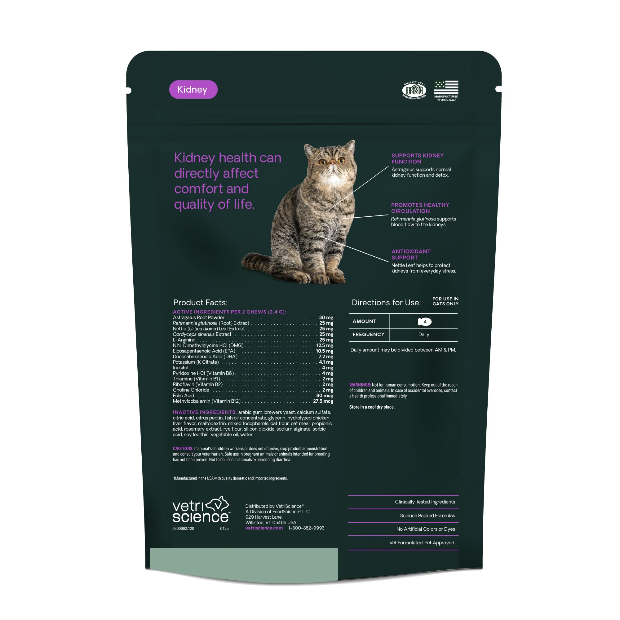 Support your cat's kidney function and healthy levels with VetriScience Kidney Health (new name, same great Renal Essentials formula), a vet-formulated kidney support supplement for cats designed to promote optimal kidney function and overall canine renal health. Perfect for senior pets, cats who struggle with adequate hydration, or those needing additional kidney care, these kidney chews for cats combine antioxidants, adaptogens, herbs, and omega fatty acids to help boost renal circulation, filtration, and waste elimination. This comprehensive kidney supplement for cats is trusted by veterinarians and formulated to help maintain renal health, proper mineral balance, and normal fluid retention, making it one of the best supplements for cat kidney health. Ingredients like Rehmannia glutinosa, known as "the kidney's own food," support kidney function in cats and promote blood flow through the renal system. Astragalus root, Cordyceps sinensis, and DMG help support detoxification, immune health, and healthy renal circulation. Nettle seed extract provides antioxidant benefits, supporting kidney cell health and repair, while B vitamins boost energy and metabolic processes that are critical for renal health. Omega-3s EPA and DHA encourage a healthy inflammatory response, further safeguarding kidney function. Whether you’re looking for cat renal vitamins, daily canine kidney support, or effective kidney chews for cats, Kidney Health helps provide easy cat kidney care. Kidney Health chews have been tested for palatability, with a tempting flavor that even sensitive cats will enjoy. Give as a treat, or break or crush to mix into food for picky pets. Our dog and cat supplements are certified by the National Animal Supplement Council (NASC), routinely undergo third-party testing, and contain no hidden ingredients, artificial dyes, or synthetic colors or preservatives.
