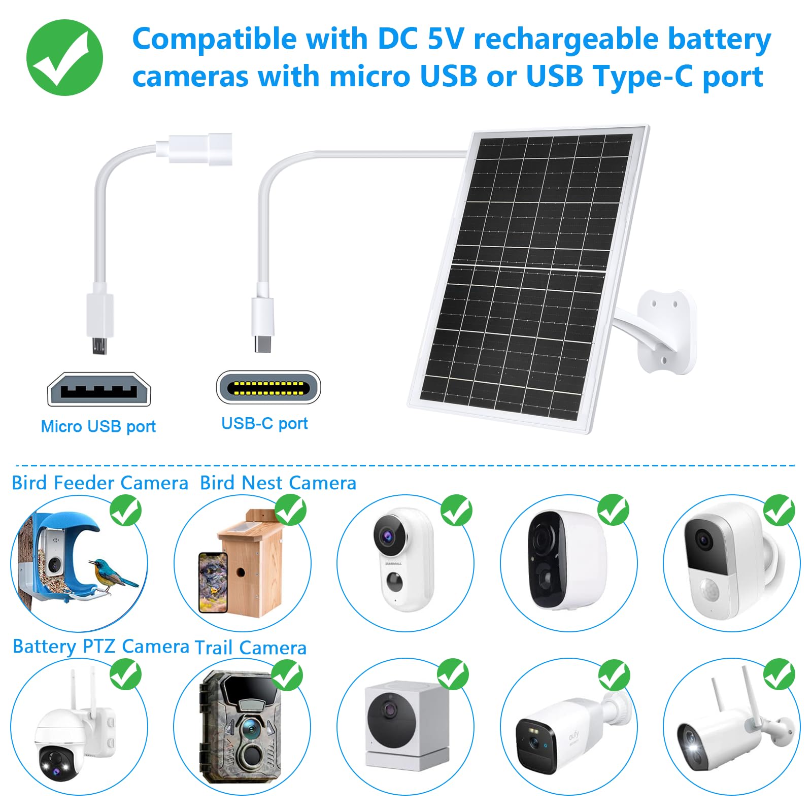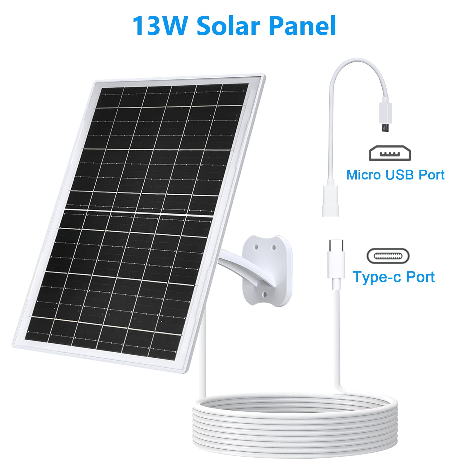 Universal Compatibility – This 13W solar panel charger is designed to power a wide range of 5V outdoor security cameras. With USB-C, Micro USB, and DC 5.5x2.1mm connectors, it supports more devices than standard panels, making it a versatile and convenient power solution for various outdoor electronics.