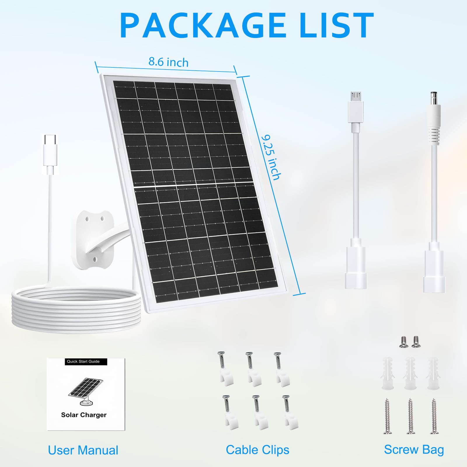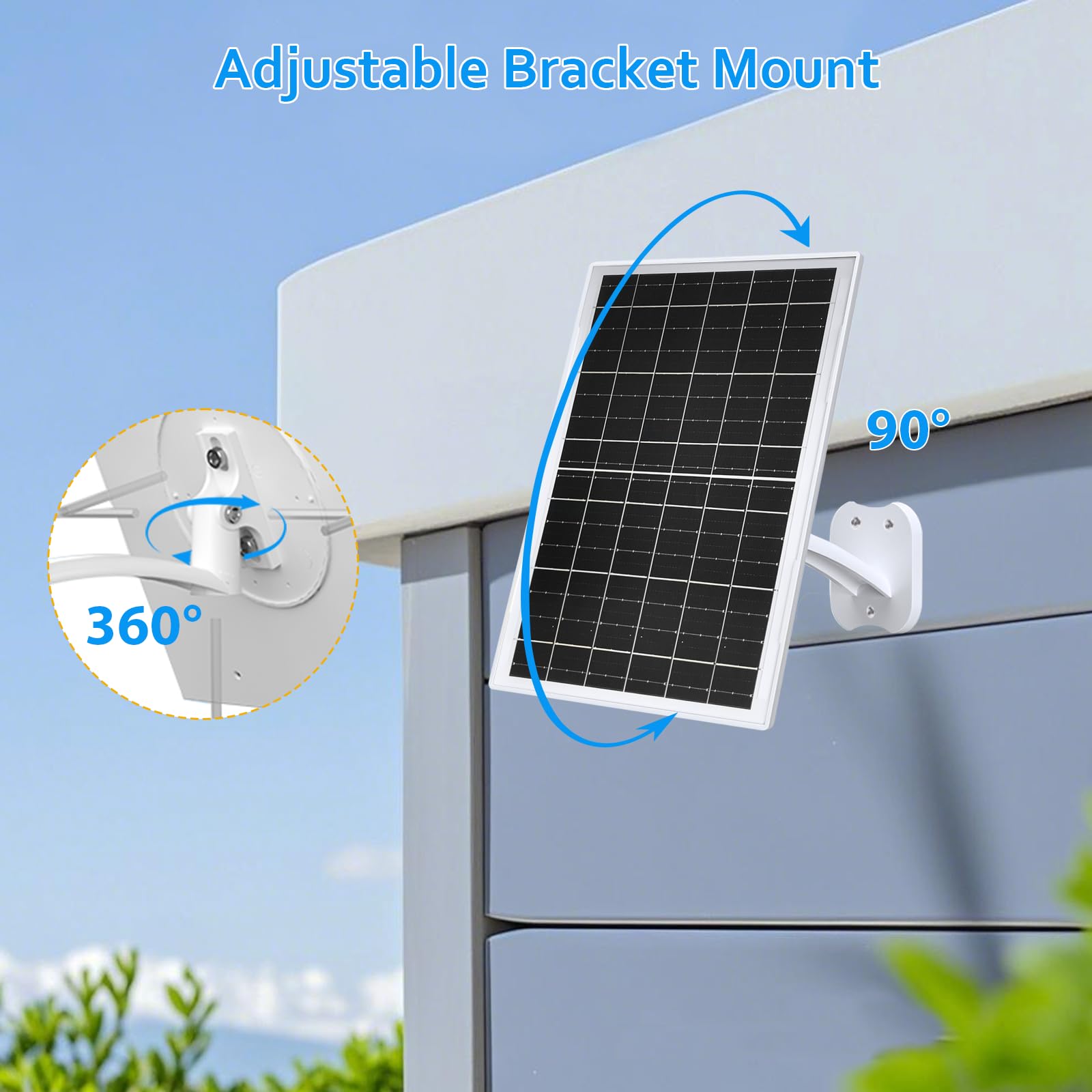 Flexible Installation – Equipped with a 360° adjustable mount and 90° tilt design, the solar panel for camera can be positioned for optimal sun exposure. The included 10-foot charging cable allows easy placement on rooftops, walls, fences, or any outdoor surface that gets good sunlight.