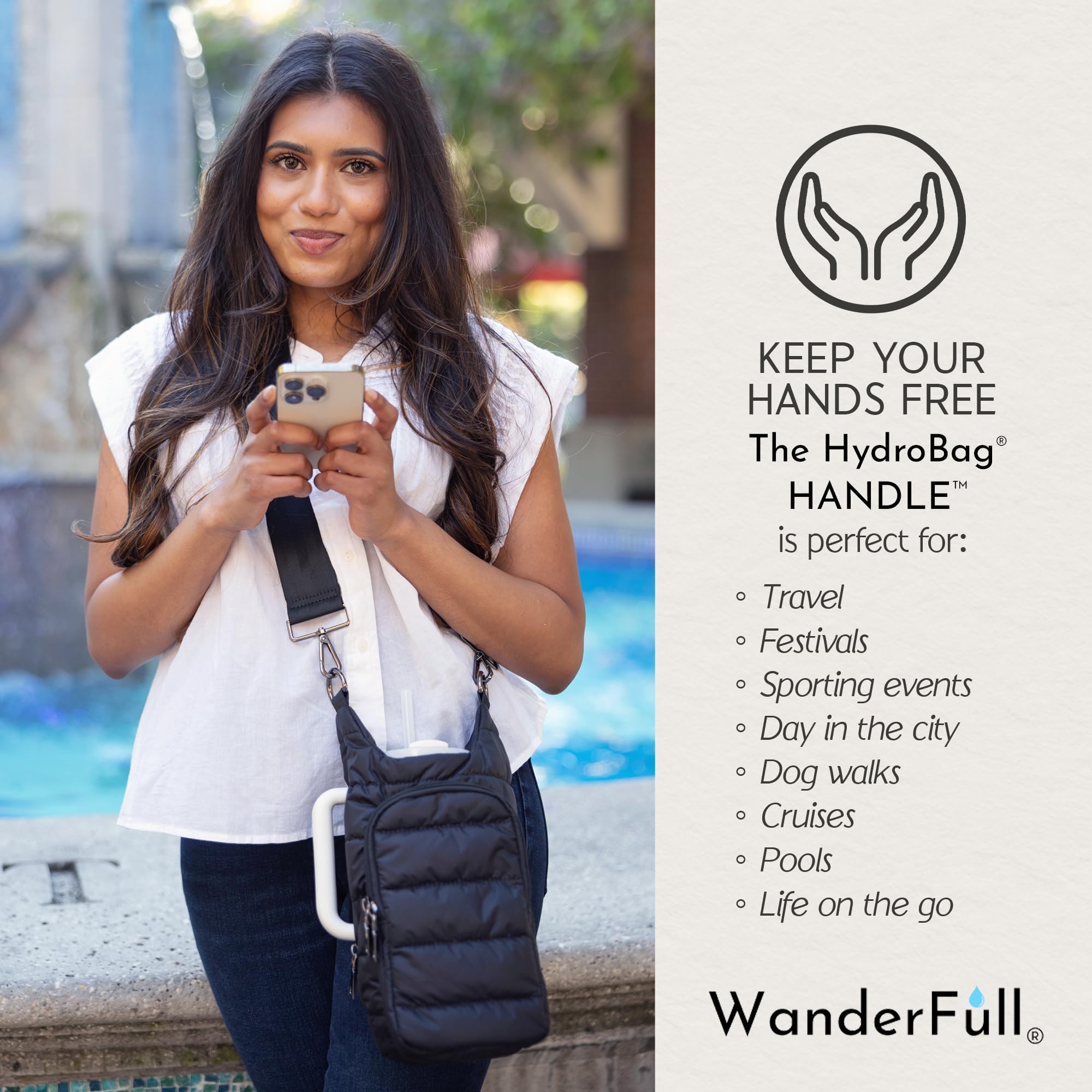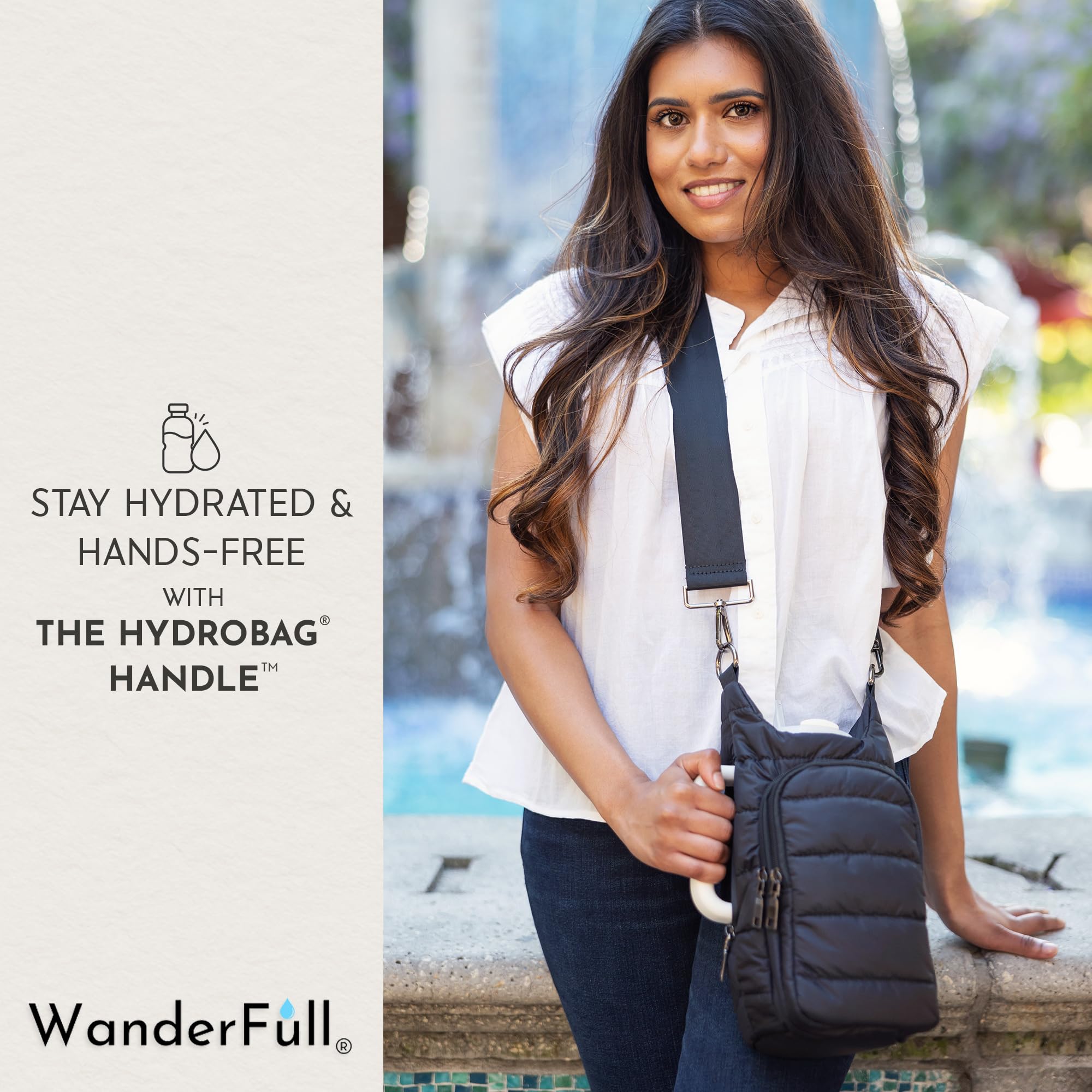 STAY HANDS-FREE & HYDRATED: Carry your bottle effortlessly with the patented WanderFull HydroBag HANDLE. Ideal for sightseeing, festivals, sports events, traveling, or walking the dog. Water bottle not included.