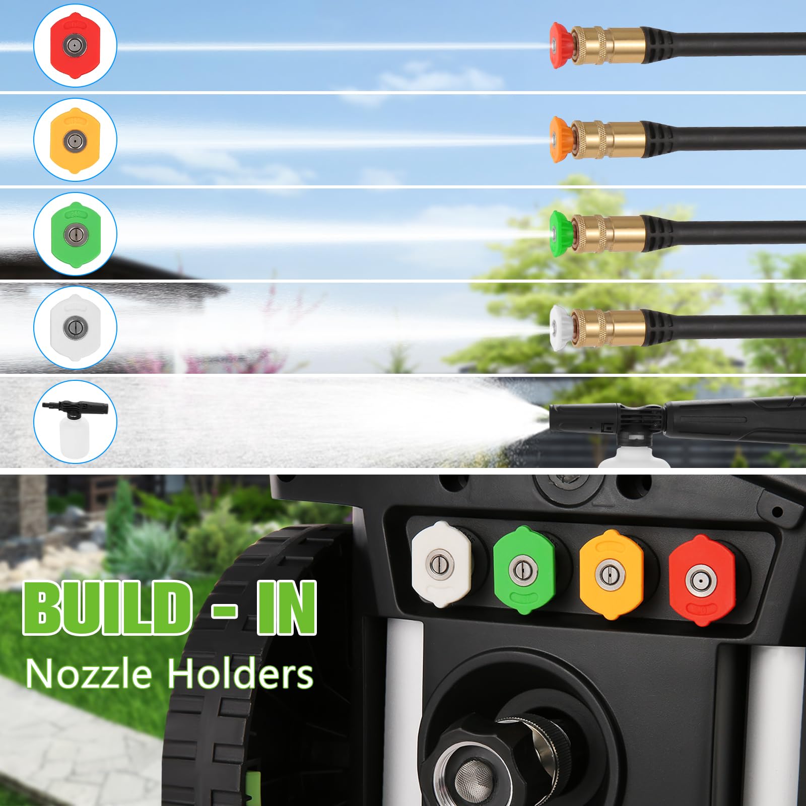 【4 Nozzles & Foam Cannon】The power Cleaner is equipped with four quick-connect metal spray nozzles (water-pressure strength:0°>15°> 25°> 40°) and a foam cannon. 4 metal nozzles allowing you to adjust the spray pattern to suit various cleaning tasks - from delicate surfaces to heavy-duty cleaning jobs. The 500ml detergent bottle can be filled with chemicals such as bleach, the cleaner will not pass through the pump, so you don't have to worry about cleaning the patio pressure washer.