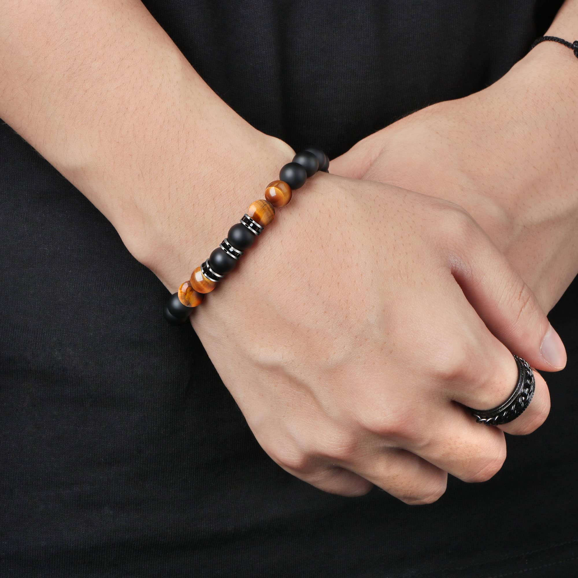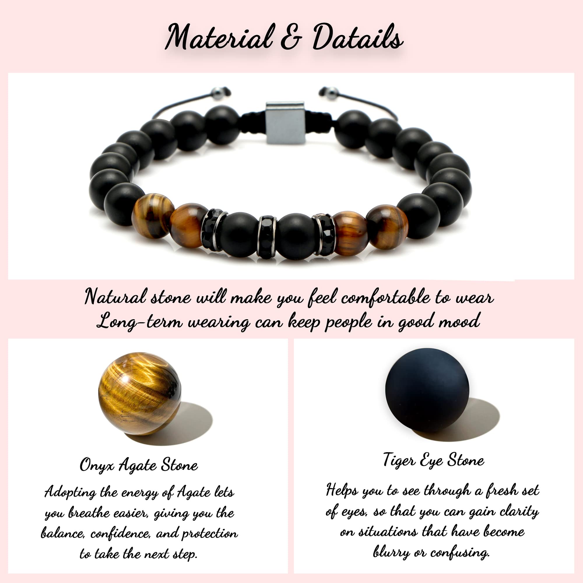 🎁 Materials: 8mm tiger eye stone and black matte agate stone, and feature an adjustable cord, no metal, it can be worn with sensitive skin, suitable for both men. The strong string is comfortable for daily use.