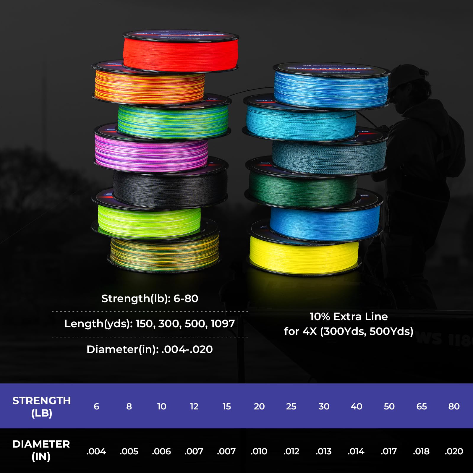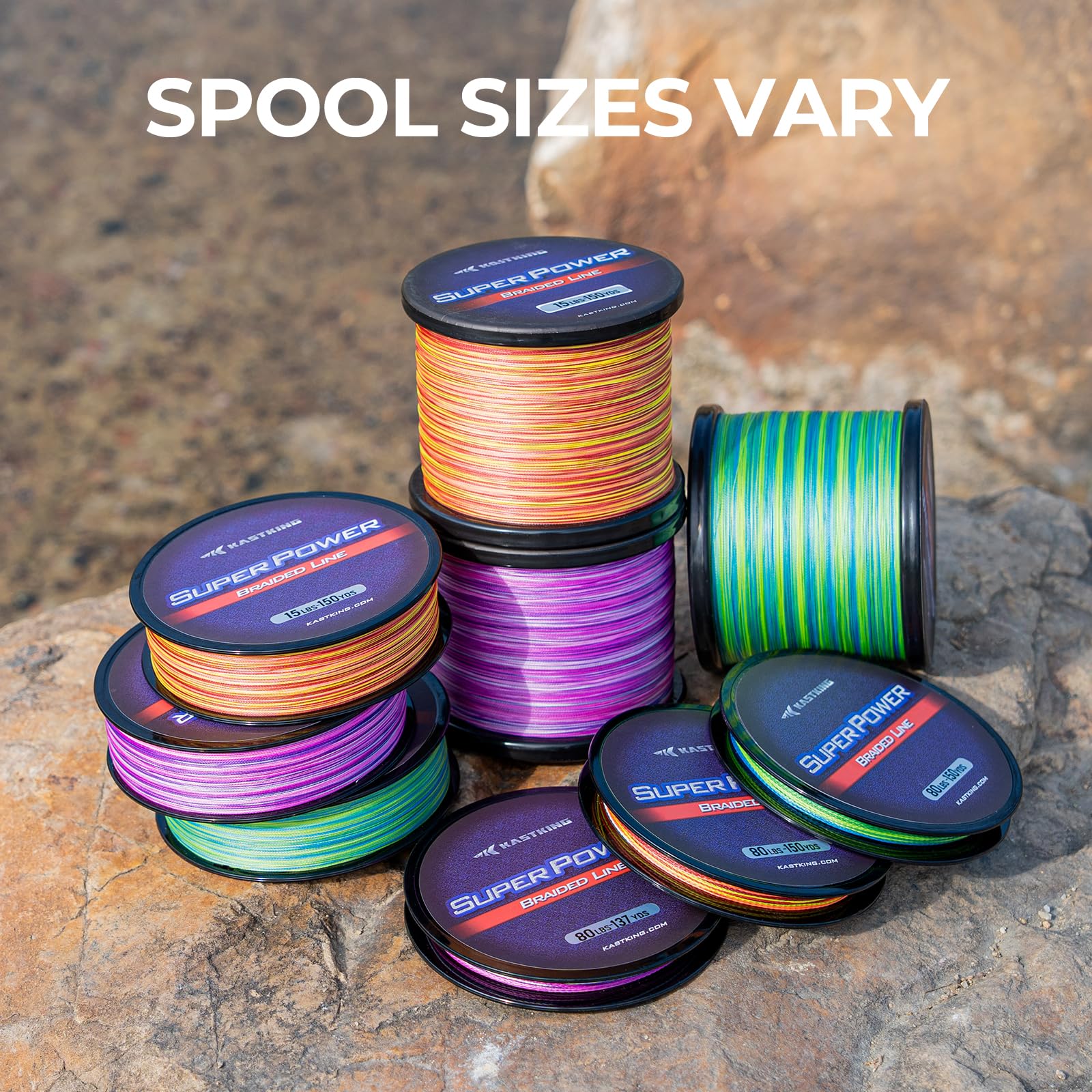 Wide Assortment of Colors & Strengths – SuperPower braided fishing line is available in 9 colors (Moss Green, Gray, Yellow, Blue, Multi-Color, Blue Camo, Sky Blue, Grass Camo, and Camo) and strengths from 6lb to 150lb, in spool lengths ranging from 150 to 1097 yards, ensuring a perfect match for various fishing conditions.