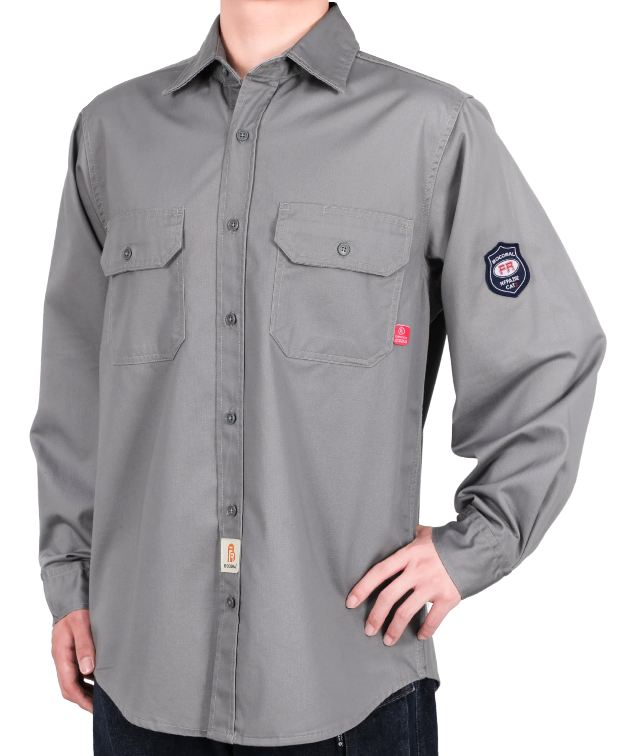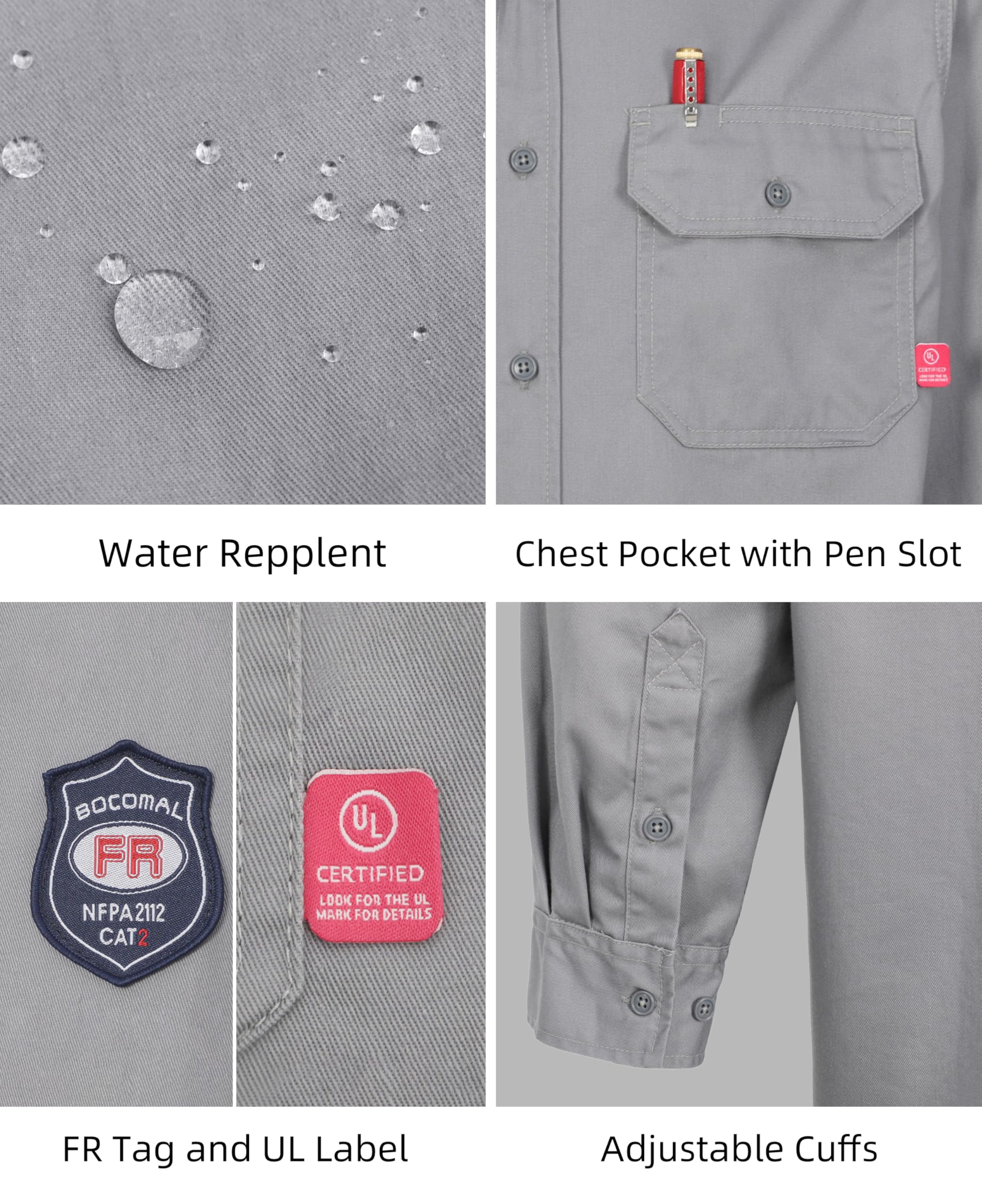 FR MATRIALS LIGHT WEIGHT:Light Water/Rain Repellent and Oil/Stain Resistant 6.25oz Cotton Twill FR Treated,FR Buttons,FR Sewing Threads!Clear FR Tag on arms and bottom front.More FR info On Neck Tag about UL Certification.We Attached A Small Sample Inside Package For Customers Simple FR Try