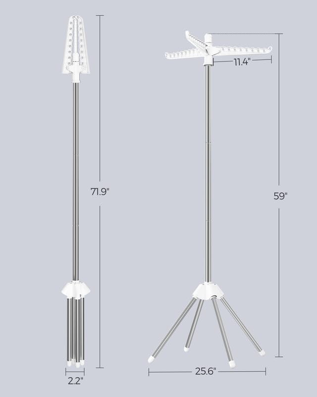 [Foldable & Space-Saving] Standing at 25.6"D x 25.6"W x 59"H during use, this clothes drying rack takes up little space, perfect for small spaces. Fold the arms and legs into a small size of 2.2"D x 2.2"W x 71.9"H, it will stay out of the way after use