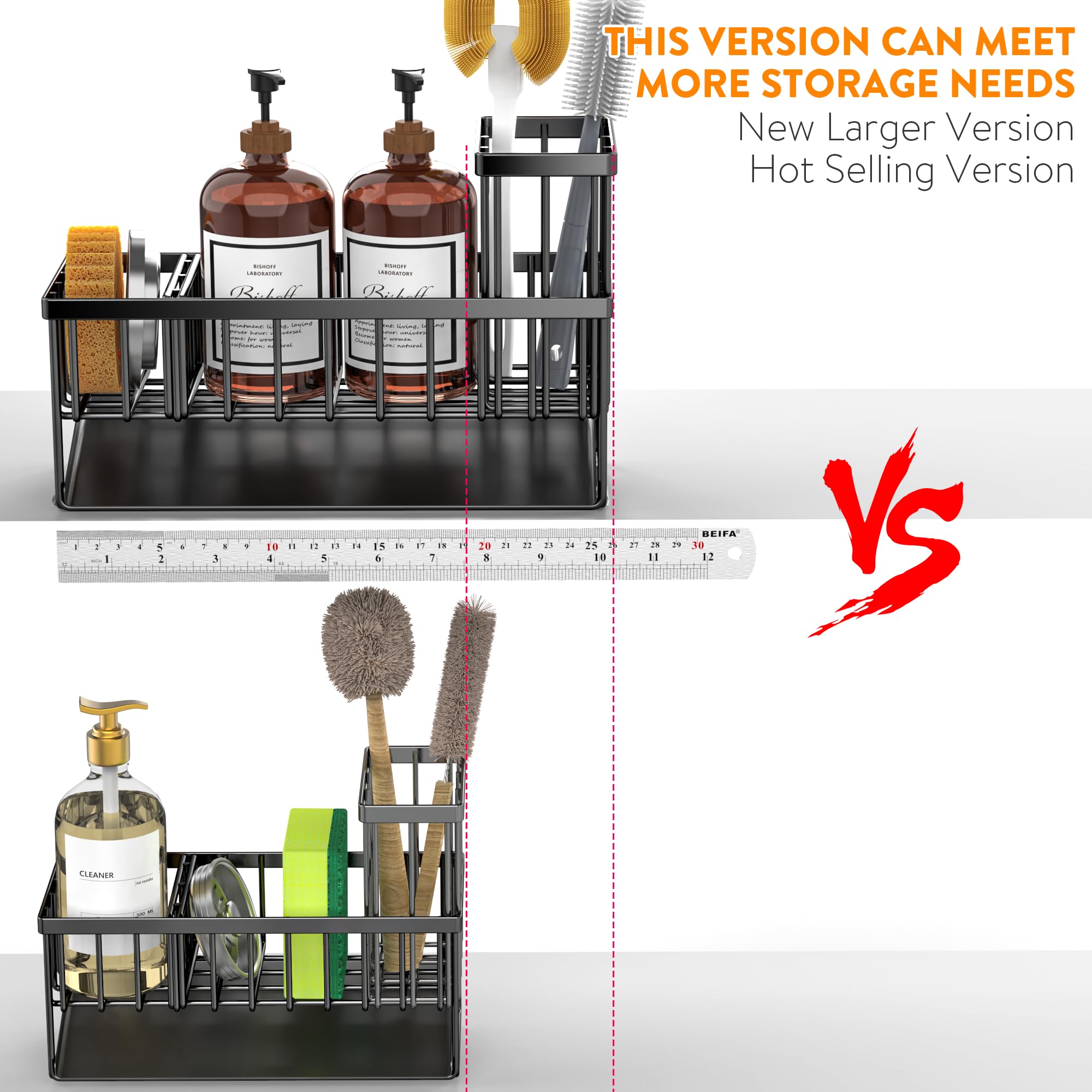 【EXTENDED AND LARGER CAPACITY】Cisily sponge holder has upgraded size. The size is only 10.62 inches * 3.97 inches * 6.37 inches, which can accommodate detergent bottles, sponge balls and sink plugs. Cisily sink organizer is additionally upgraded with a brush holder, which can hold up to 4 large and small brushes, perfectly saving countertop space.