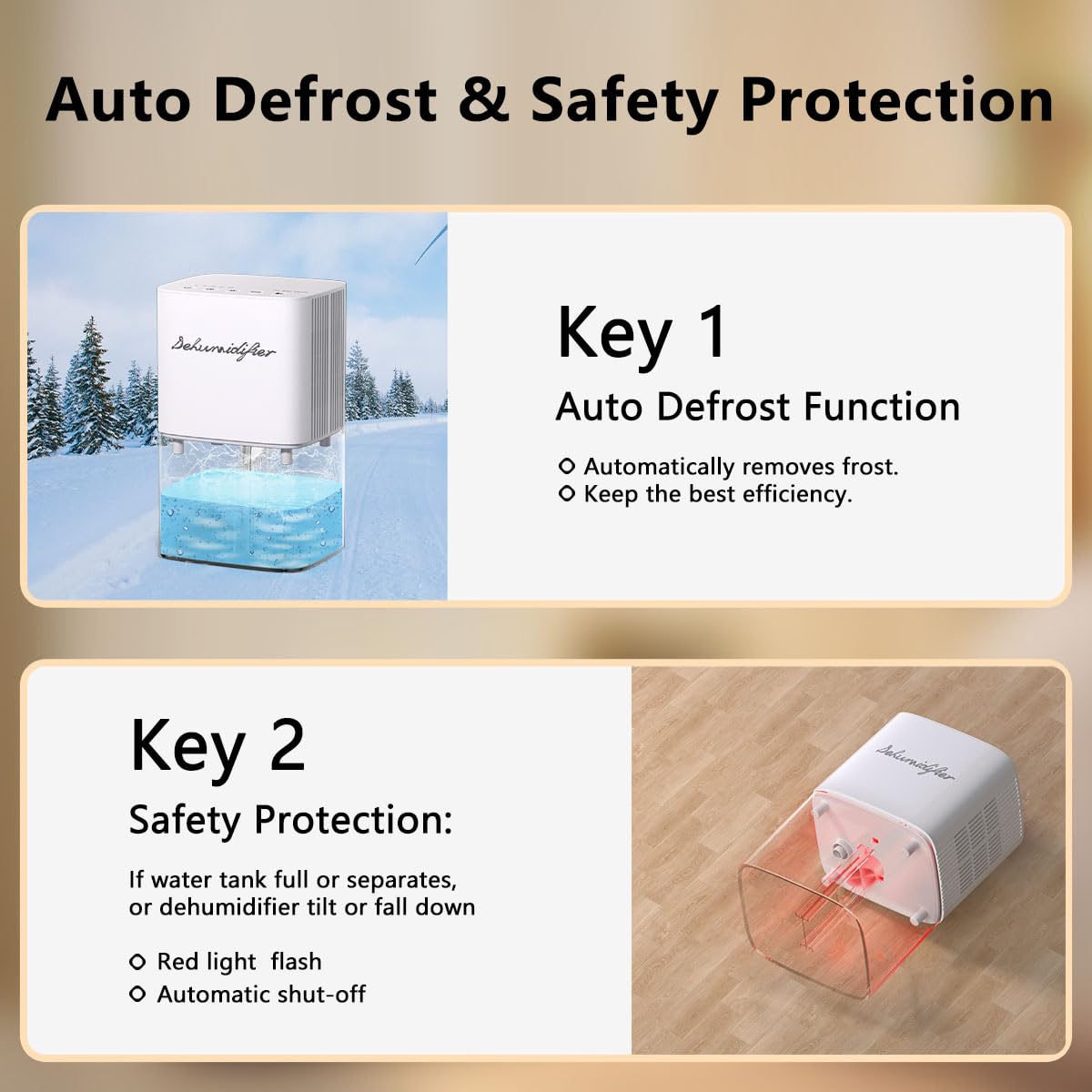 ๐ Defrosting and Safety Protection: Our dehumidifier is equipped with a defrost technology. It automatically removes frost from the semiconductor to make sure it works well. And with auto shut off protection, if water tank is full or separated, or the dehumidifier tilt or fall down, it will flash a red light to remind you and stop operation timely.
