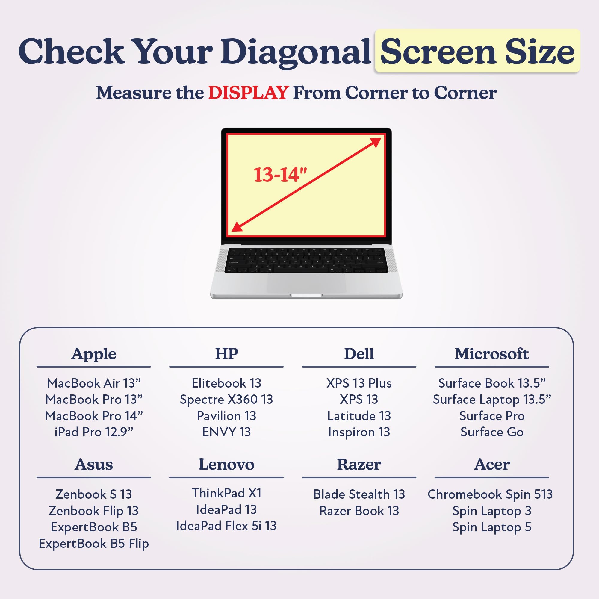 COMPATIBLE WITH: ALL 13-13.3 inch and MOST 14 inch laptops. MacBook Pro 14 inch bag; MacBook Pro 13 inch, MacBook Air 13 inch Sleeve Case; HP Spectre 13/ENVY 13; Dell XPS 13/Latitude 13; Lenovo ThinkPad X1 13/Chromebook 14; Surface Pro/Surface Laptop