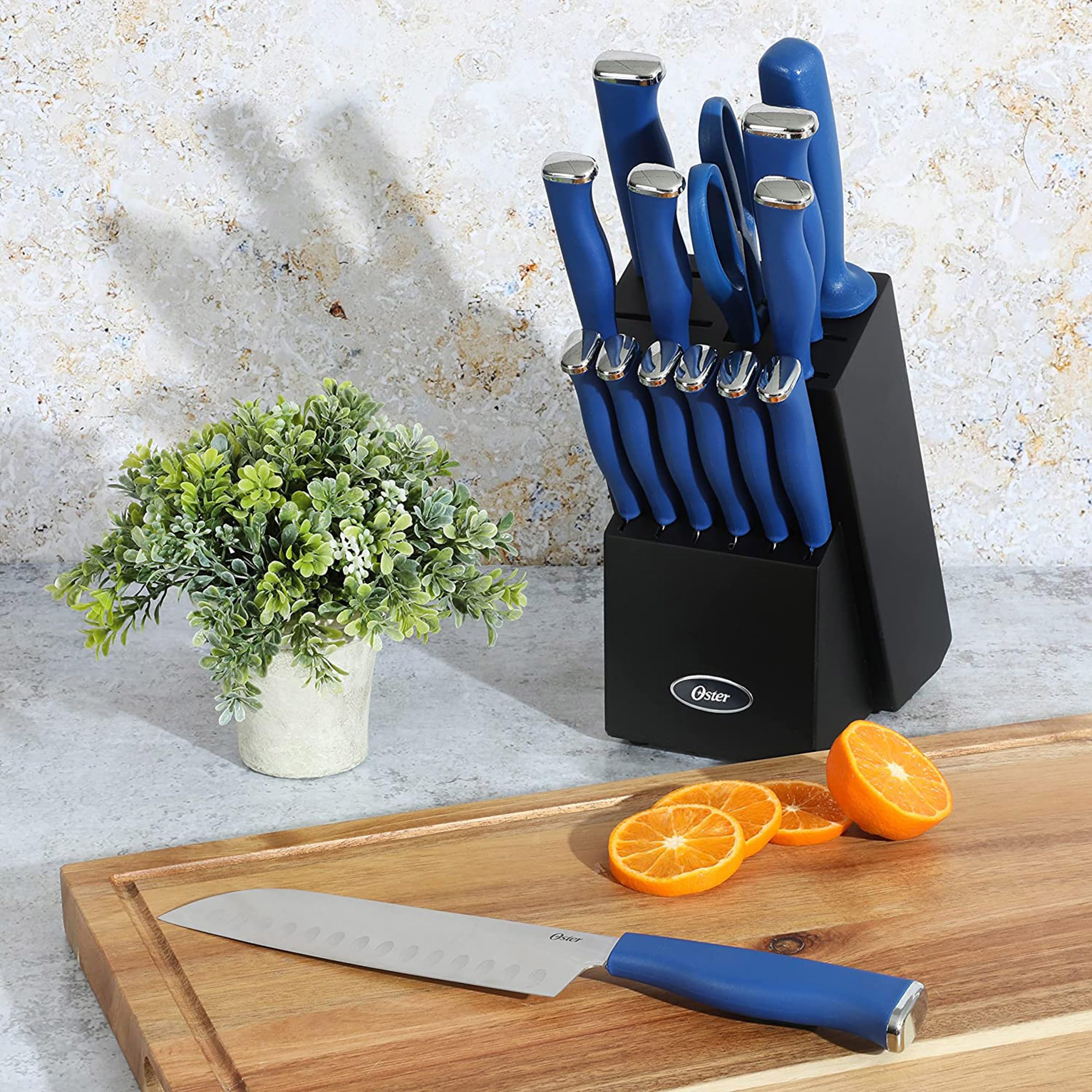 All the knives you need in one sturdy storage block! The Oster Langmore 15-piece Stainless Steel Knife Set is an everyday food prep companion that offers high-carbon stainless steel blades with full tang construction. Each knife maintains a sharp edge, designed to deliver ease of use and even cuts of meat, fruits or vegetables. The soft-touch handles provide a comfortable grip to reduce fatigue and support your hand when cutting through meat or filleting fish. Available in a variety of colors, the handles add a burst of color to any style of kitchen. The heavy and sturdy wood block sits beautifully on the countertop to provide easy access to the kitchen knives. When not in use, store the knives back in the wood block for safety. Hand wash only. Use a soft, damp cloth to clean the wood storage block.