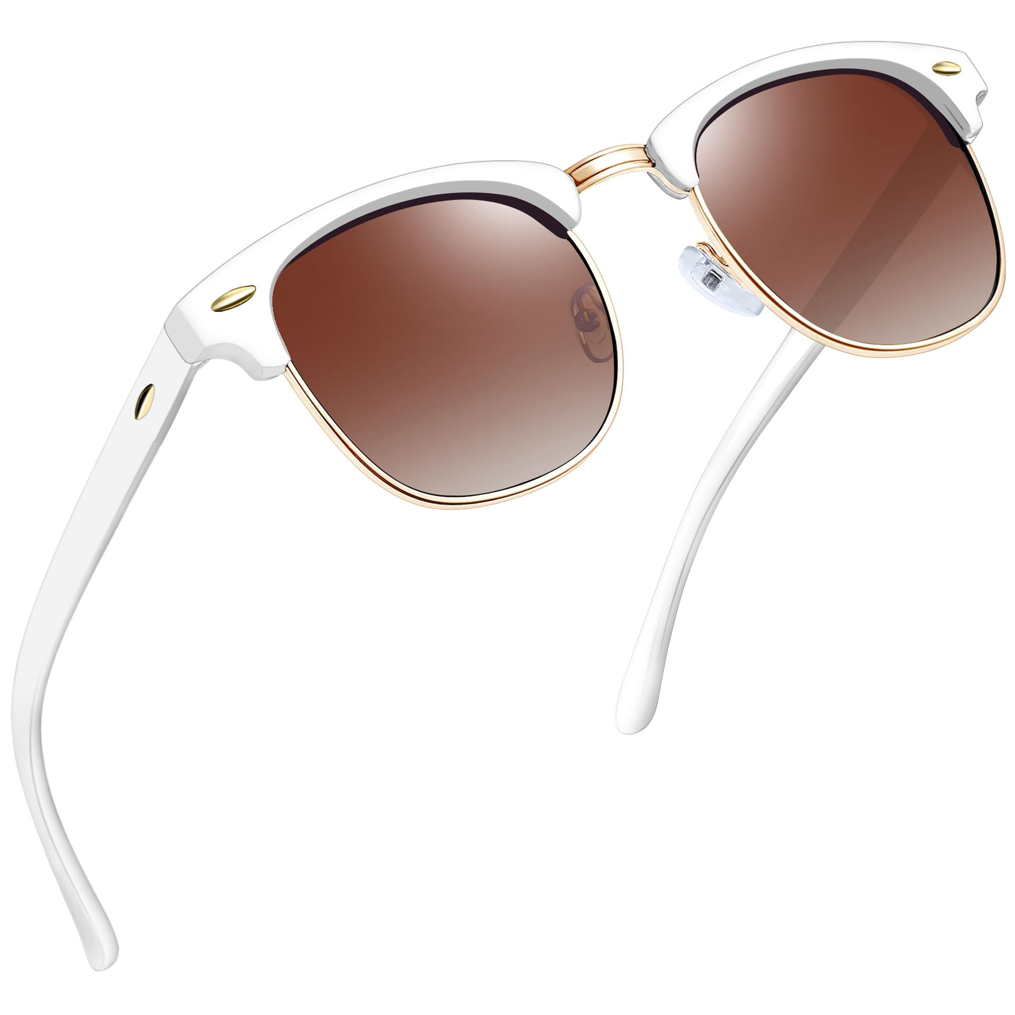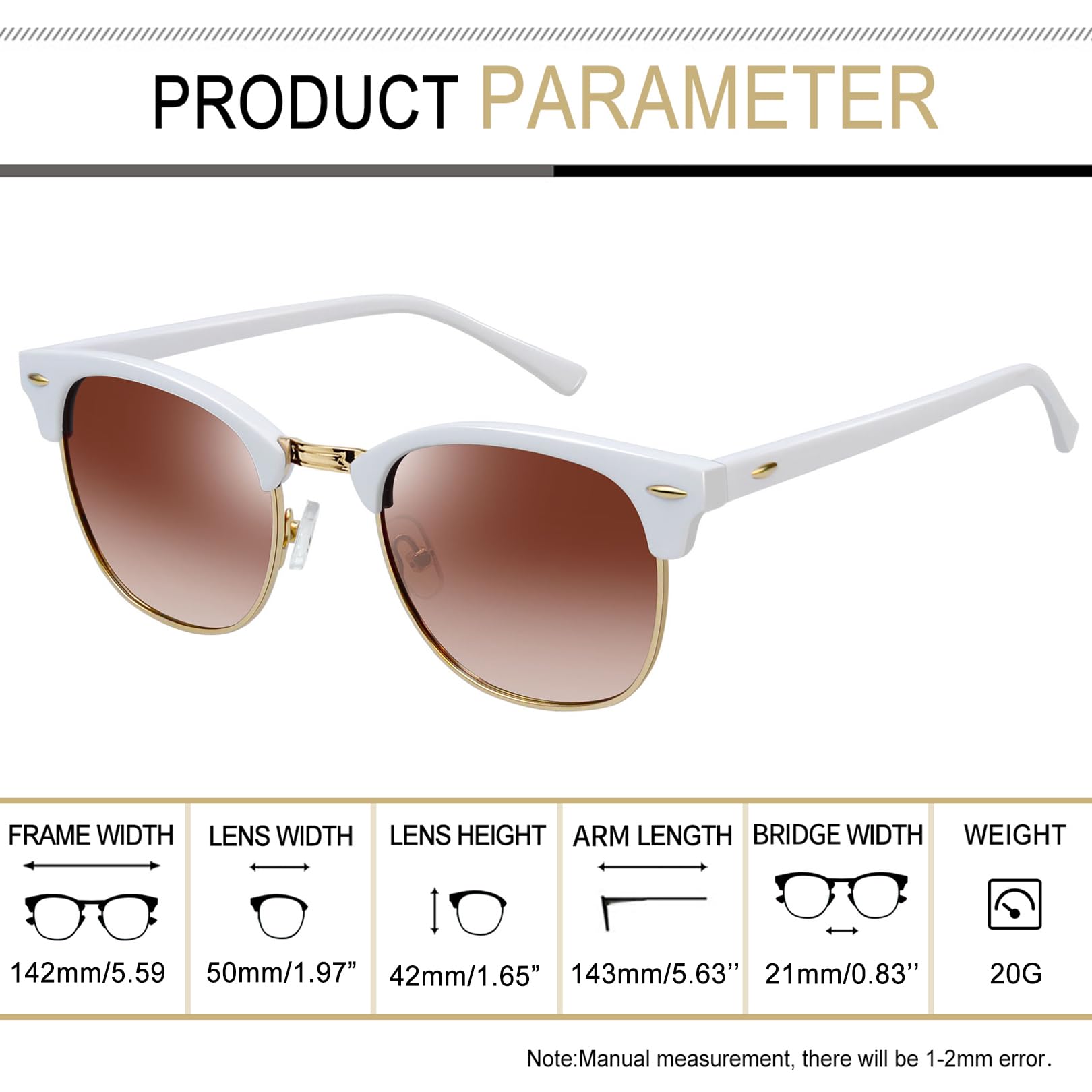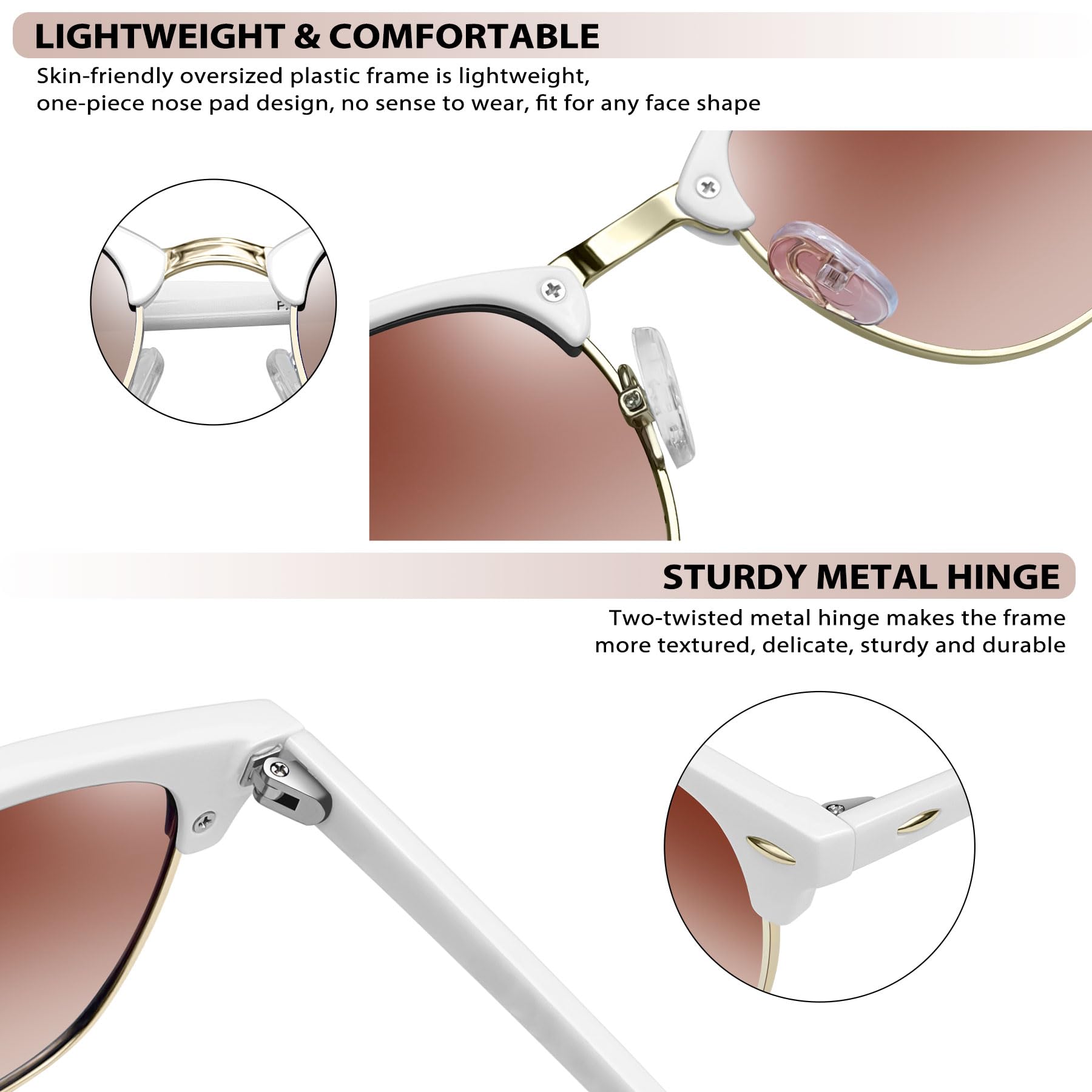 Timeless Club Master Style : Club Masters sunglasses date back to the 1950s, were popular in the 1980s, and are still a classic today. Semi rimless sunglasses have a solid plastic browline area, with sturdy wire metal frame, soft silicone nose pads, double-burst metal hinges, and polarized lenses make half frame sunglasses perfect for everyday use. White frame sunglasses make you charming, the icing on the cake for your outfit with this classic sunglasses