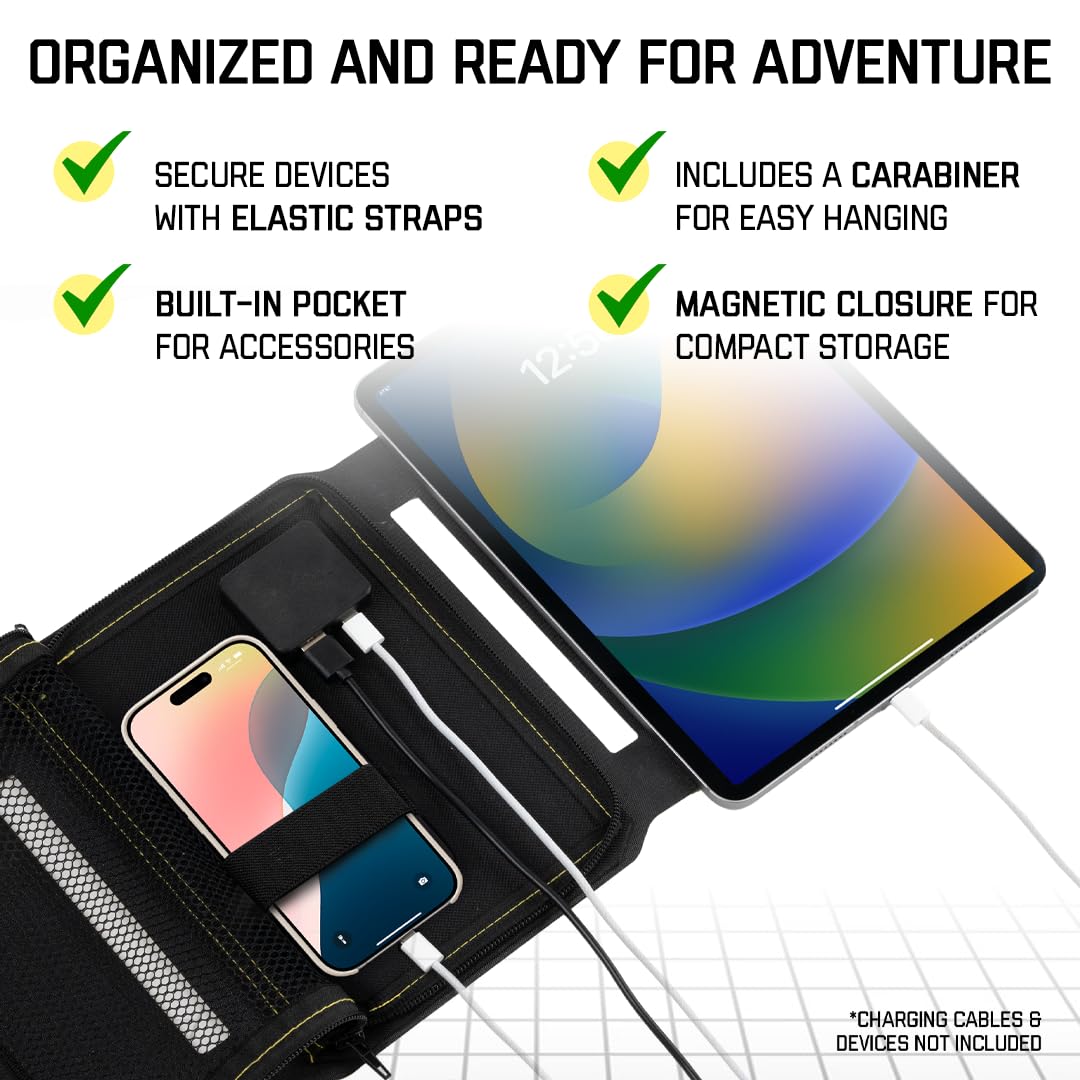 Compact Foldable Solar Charger – Lightweight design folds to tablet size, with magnetic closure, mesh pocket, and elastic straps—perfect for travelers and backpacking solar panel setups